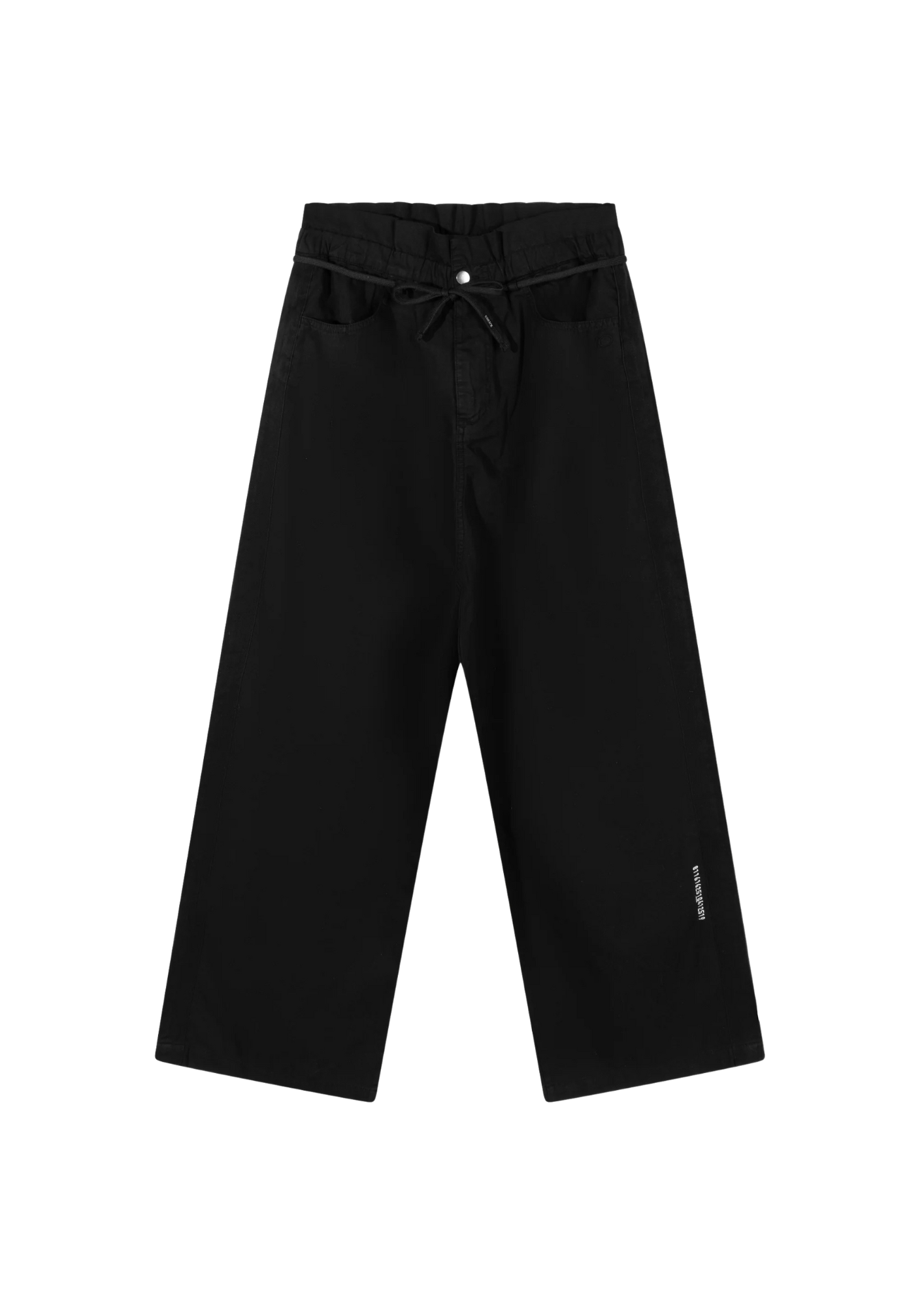 Relaxed fit paperbag broek met wijde pijpen, gemaakt van katoen- en linnenblend twill. Voorzien van een elastische geplooide tailleband, een rits- en knoopsluiting, een koord ceintuur, steekzakken, opgestikte achterzakken, herringbone biezen langs de zijnaden, een '10' monogram borduring onder de linker steekzak en een 'numbers' borduring op de linker broekspijp.