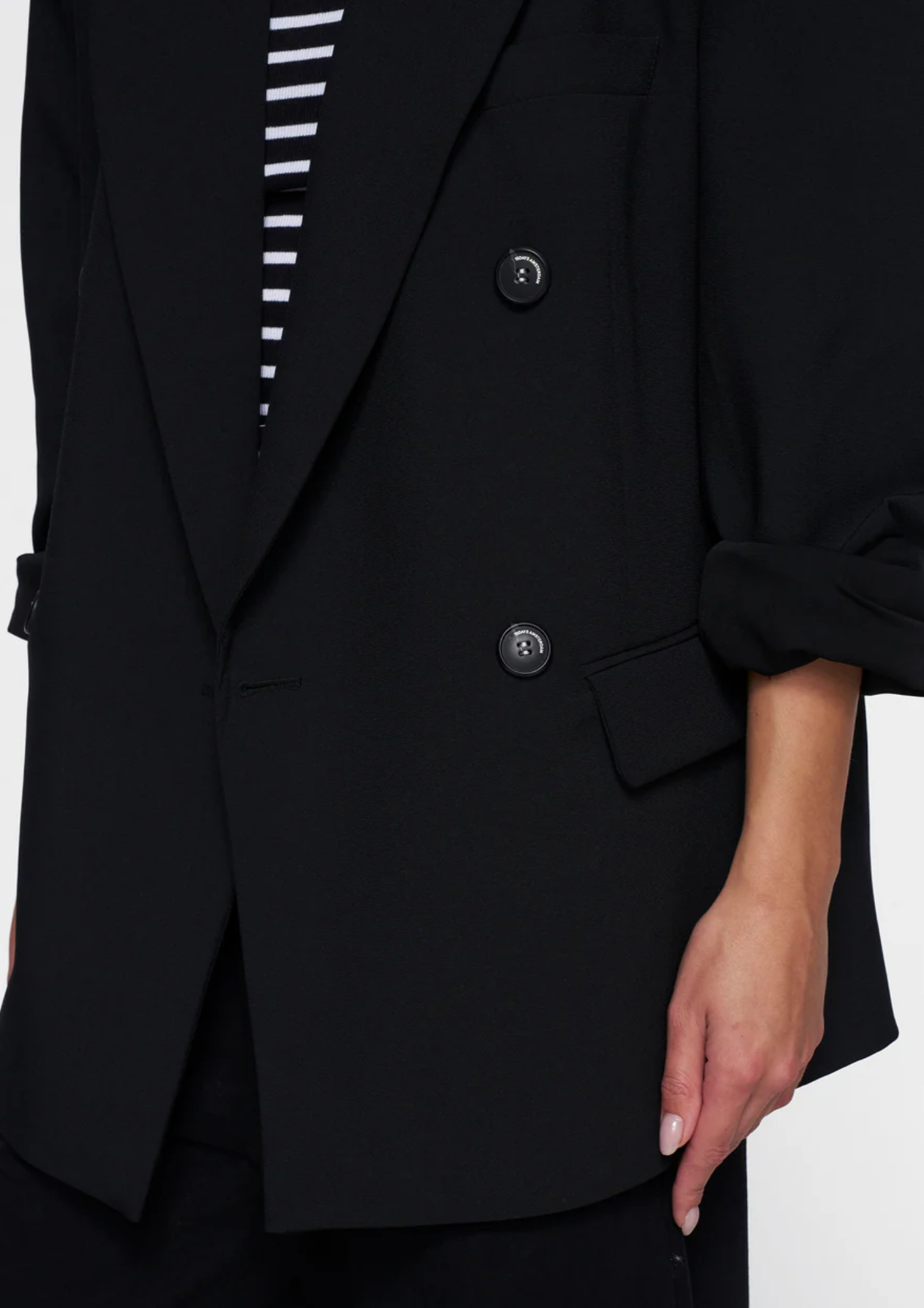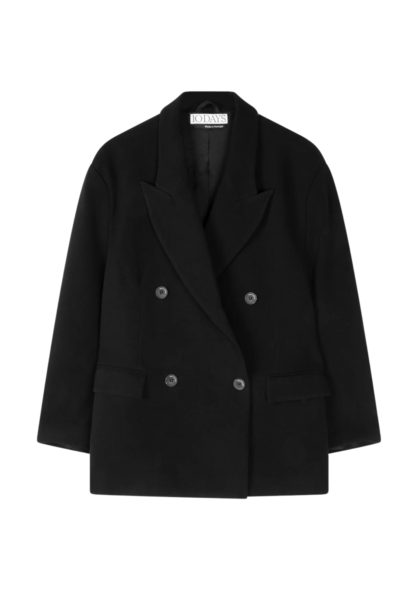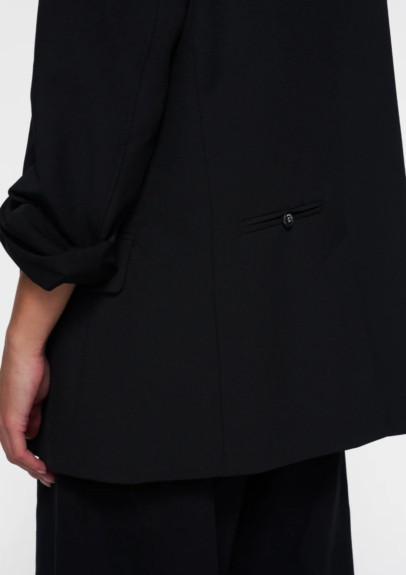 Oversized fit blazer, gemaakt van een fijne crêpe met een voering van katoen en viscose. Voorzien van schoudervullingen, een reverskraag met knoopsluiting, twee klepzakken, een handgeschreven borduring op de rug, een fake paspelzak op de achterzijde en twee splitten aan de achterzijde.
