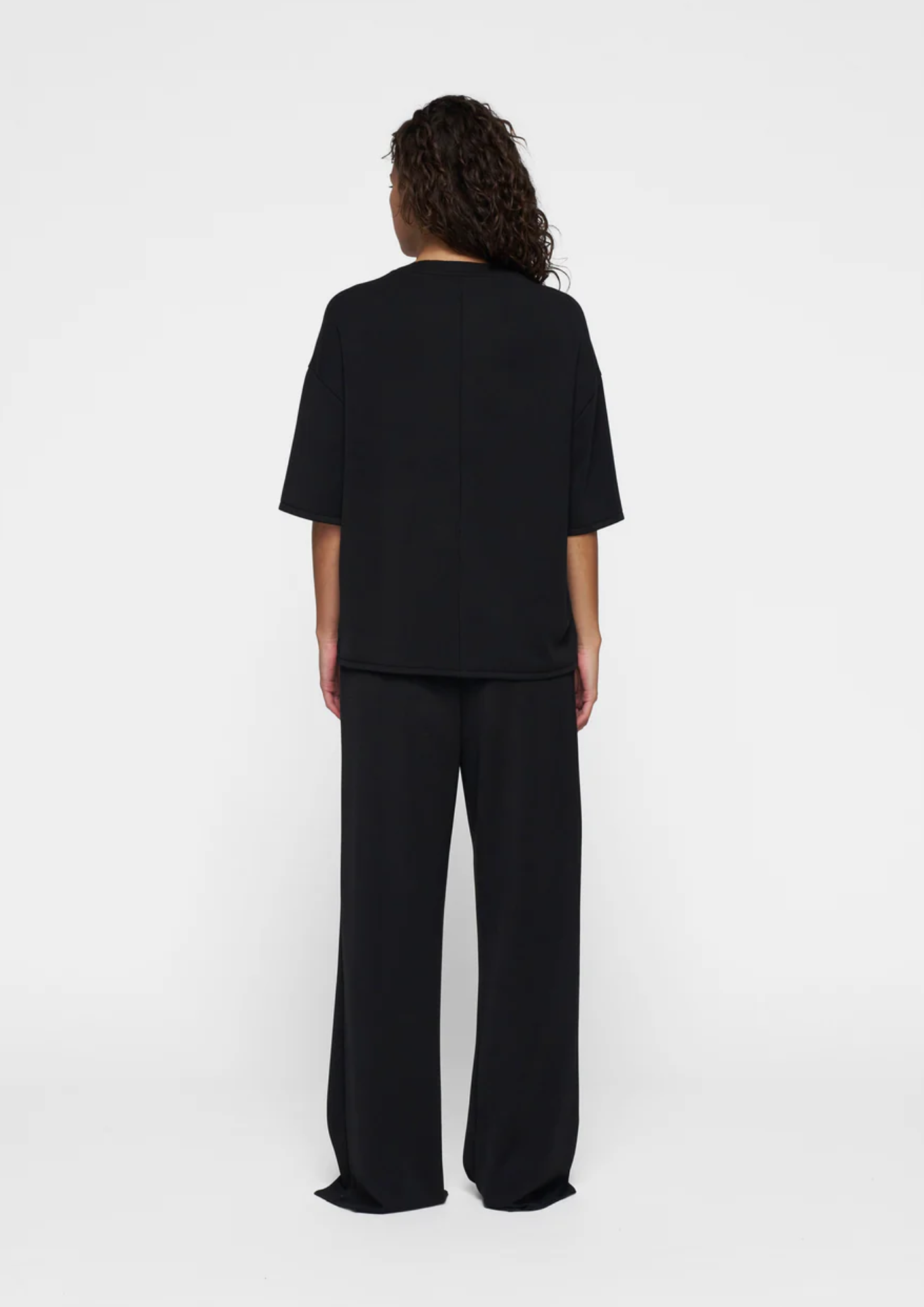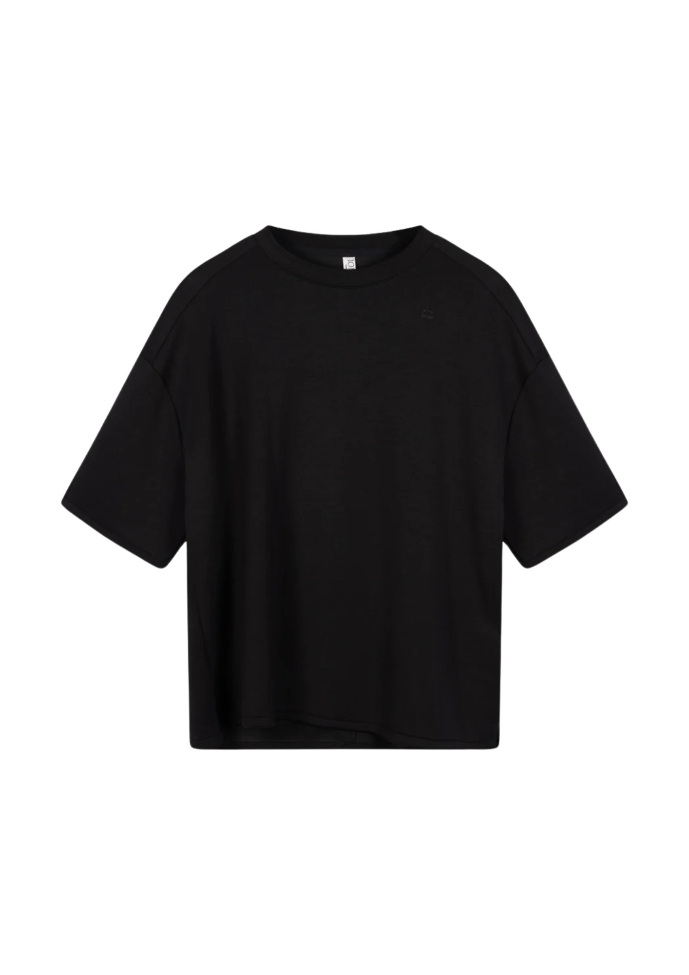 Relaxed fit T-shirt met korte mouwen, gemaakt van superzacht active scuba. Van nature kreukvrij, ultra-zacht en lichtgewicht. Voorzien van een mini stripes logo print op de linker schouder, een raw edge halslijn en splitten aan de uiteinden van de zijnaden.
