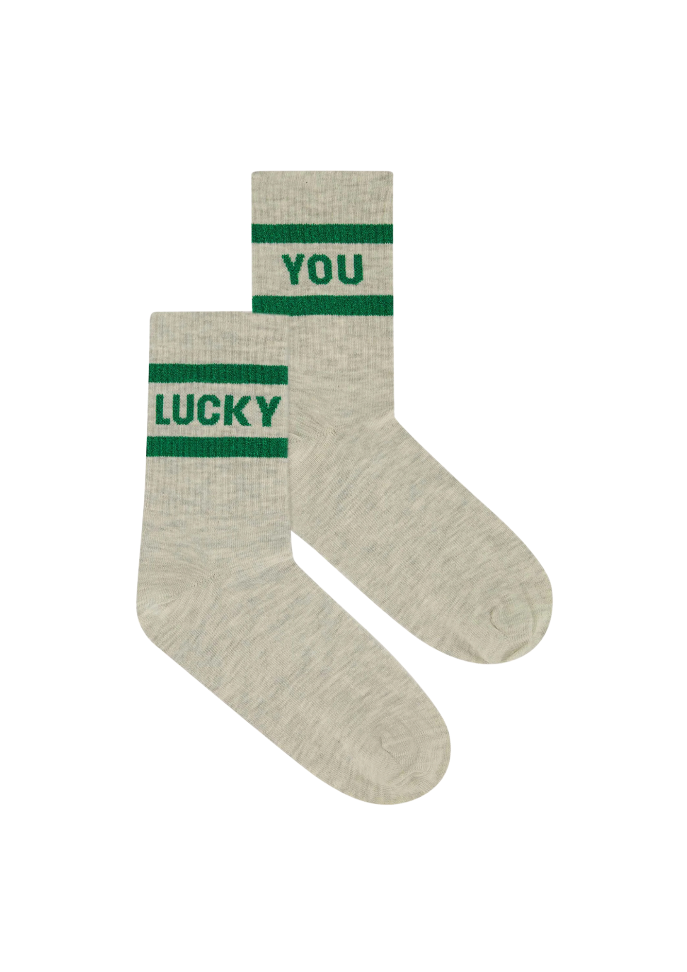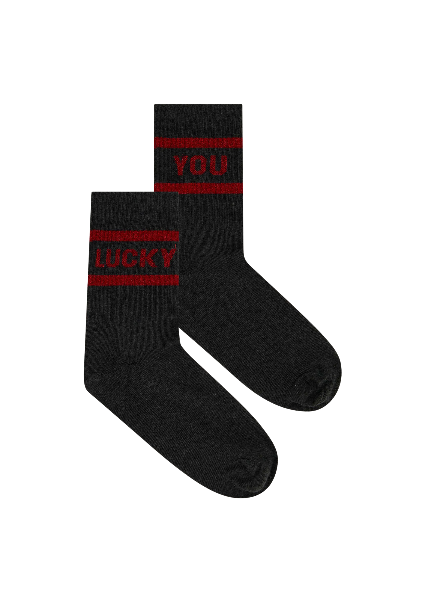 Klassieke sokken met de woorden 'lucky' en 'you'. Gemaakt van een zachte katoen met stretch en lurex.