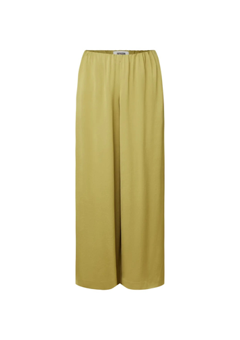 TWEEZER is een wijde broek met elastische tailleband. De casual pasvorm wordt mid-waist gedragen. Gemaakt van een hoogwaardige en vloeiende satijn.