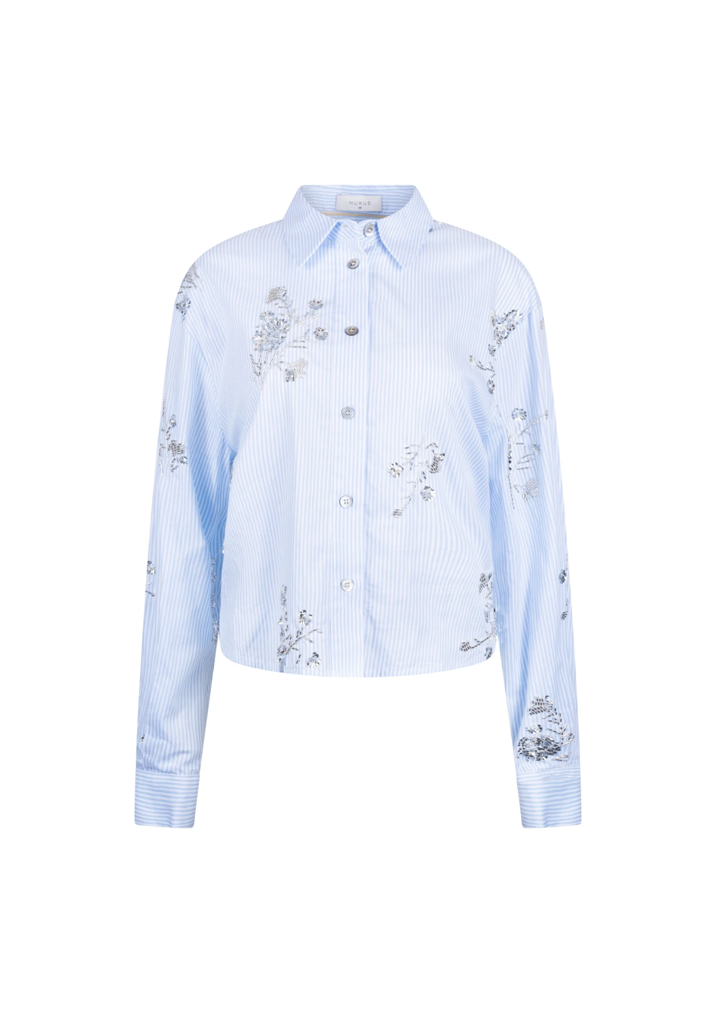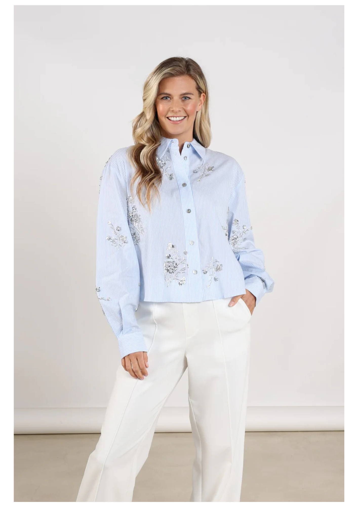Deze lichtblauwe blouse straalt elegantie uit. Het kraagje en de blinde sluiting zorgen voor een clean en verfijnd silhouet. De zilvere pailleten geeft de blouse een luxe touch. Voorzien van lange mouwen en perfect om zowel chic als stijlvol casual te dragen.