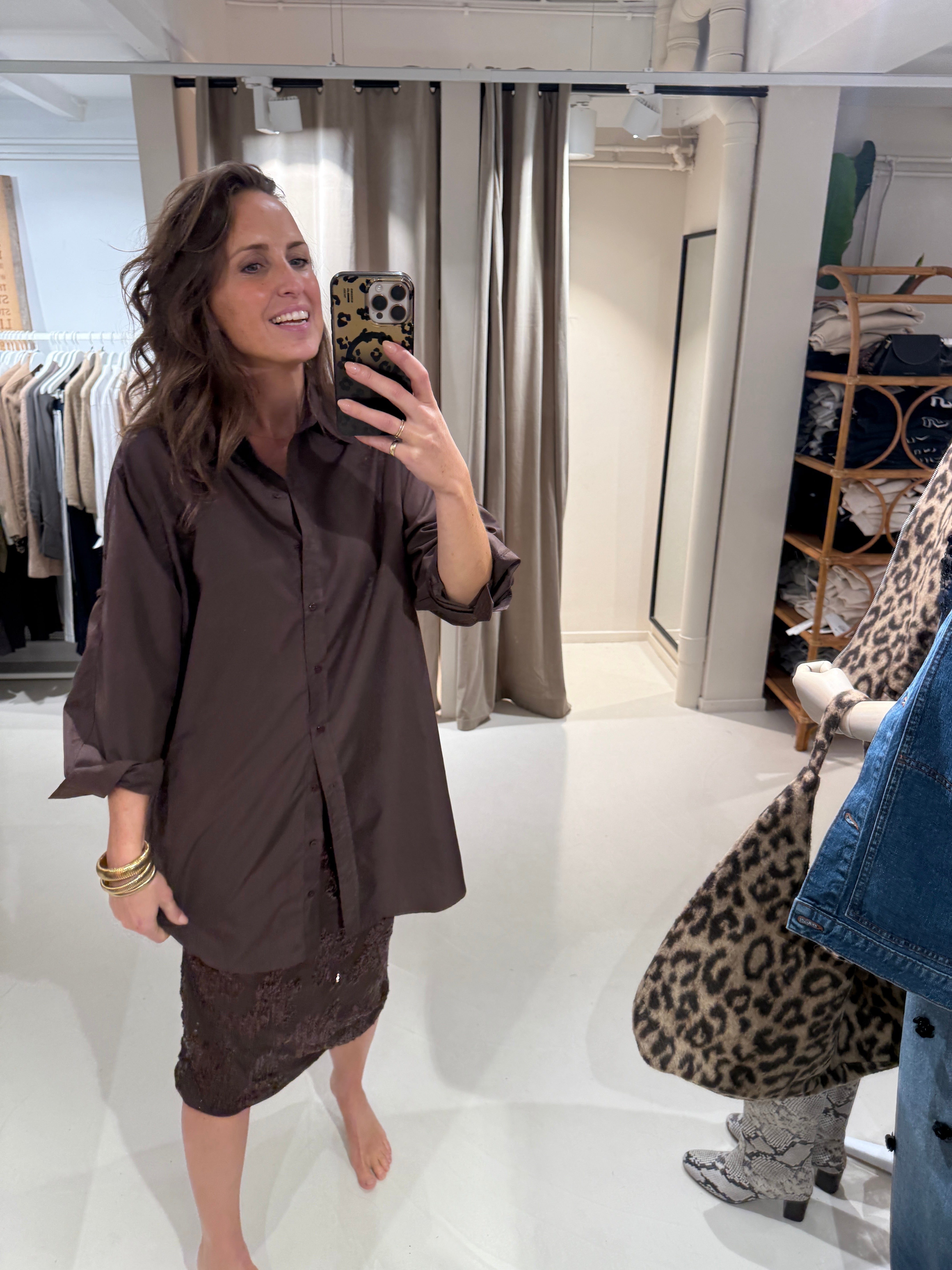 Bruine lange blouse. Geweldig over een jeans of lange rok. Hij valt oversized!
