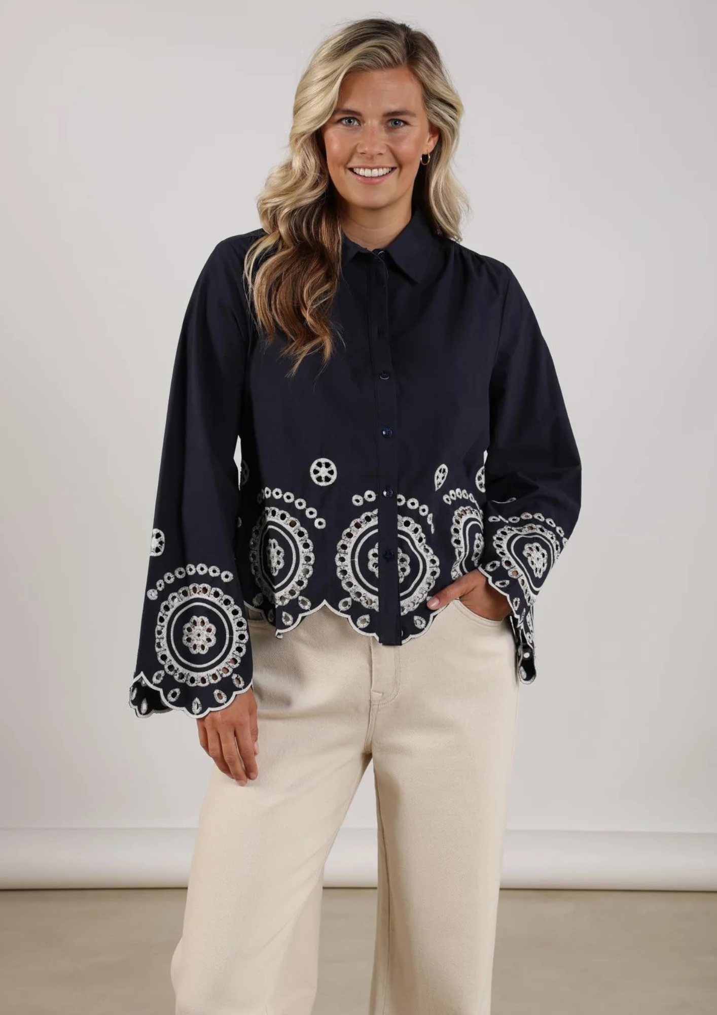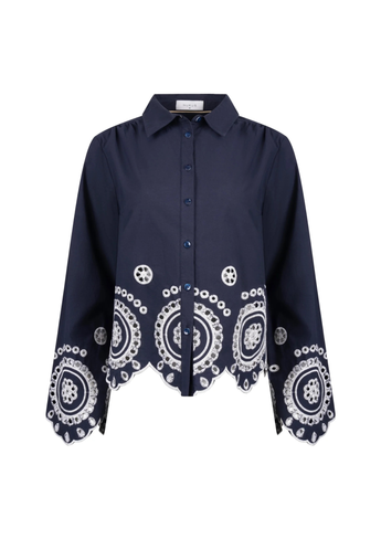 De embroidery blouse is een verfijnd en stijlvol item voor Spring 2026. De combinatie van navy met crème borduursel geeft deze blouse een luxe en gedetailleerde uitstraling die direct in het oog springt. Gemaakt van 100% katoen voelt de blouse licht en comfortabel aan, ideaal voor het voorjaar. De pasvorm zorgt voor een vrouwelijke en draagbare look. Perfect te combineren met de Shay pants ruffle voor een complete en modieuze set.
