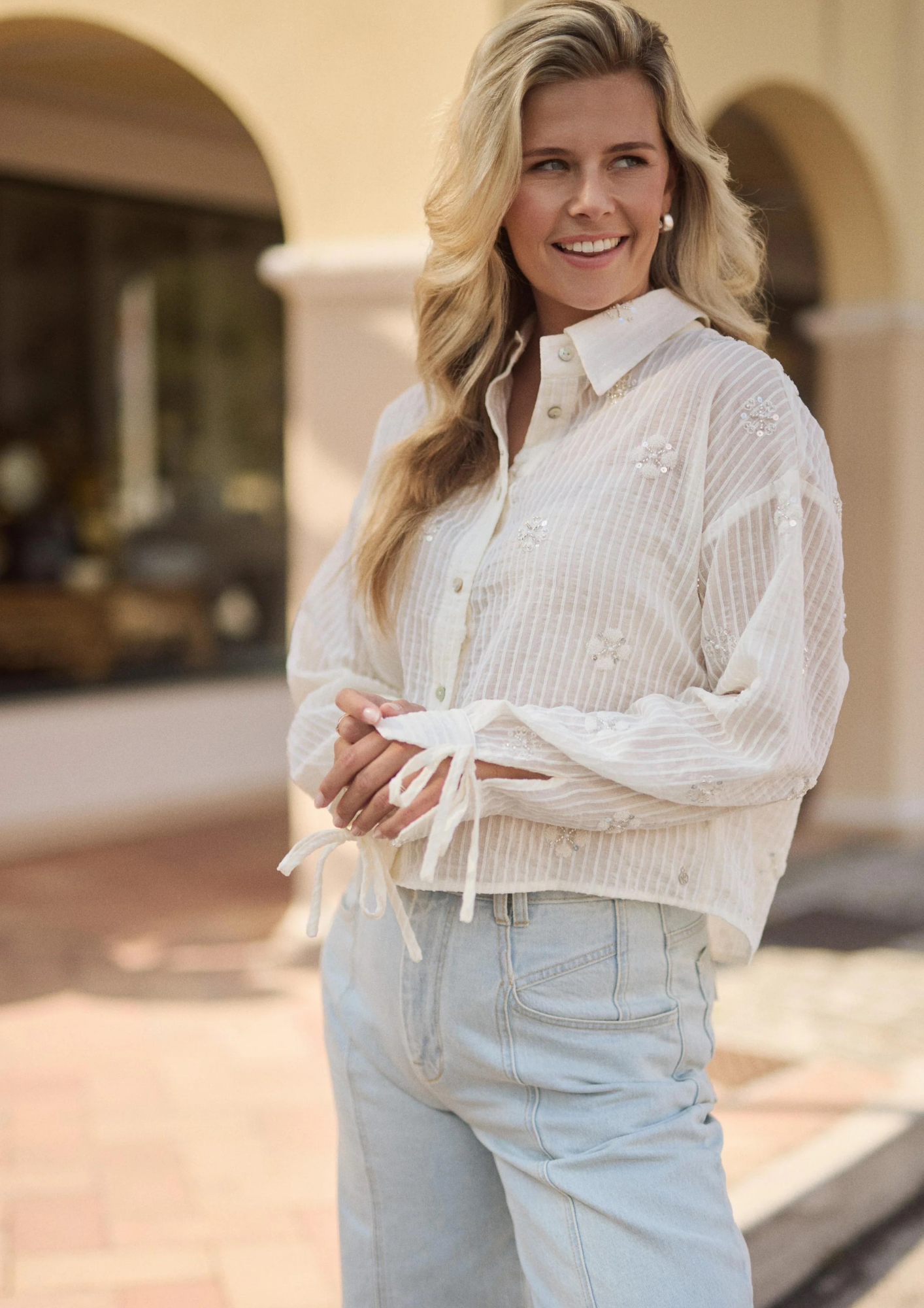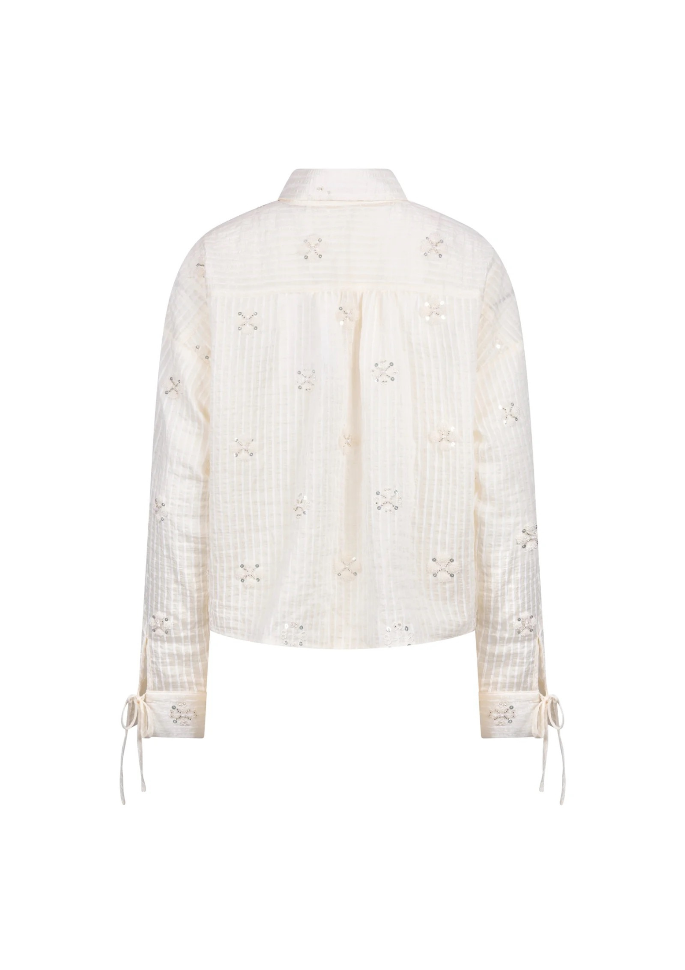 Deze blouse met kraag en strikdetail bij de manchetten heeft een iets korter model dat net over de broekband valt, waardoor het item perfect combineert met de Senna pants of Shay pants ruffle. Het subtiele streepmotief met borduur en pailletten geeft de blouse een luxe en orginele uitstraling. Gemaakt van 45% tencel, 30% chenille en 25% polyamide, voelt de blouse zacht en comfortabel aan.