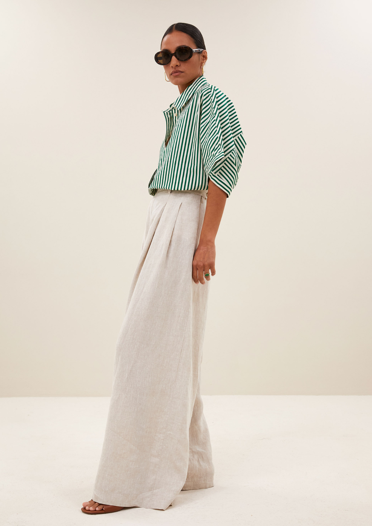 Deze losvallende linnen broek met mid-waist taille combineert comfort met een elegante, geklede stijl. Dankzij de verborgen ritssluiting en praktische zijzakken is hij zowel stijlvol als functioneel. Perfect voor wie op zoek is naar een luchtige, lange broek die moeiteloos draagbaar is en een verfijnde uitstraling geeft.