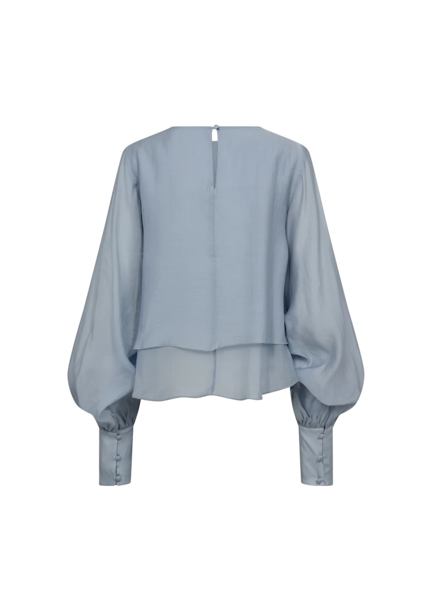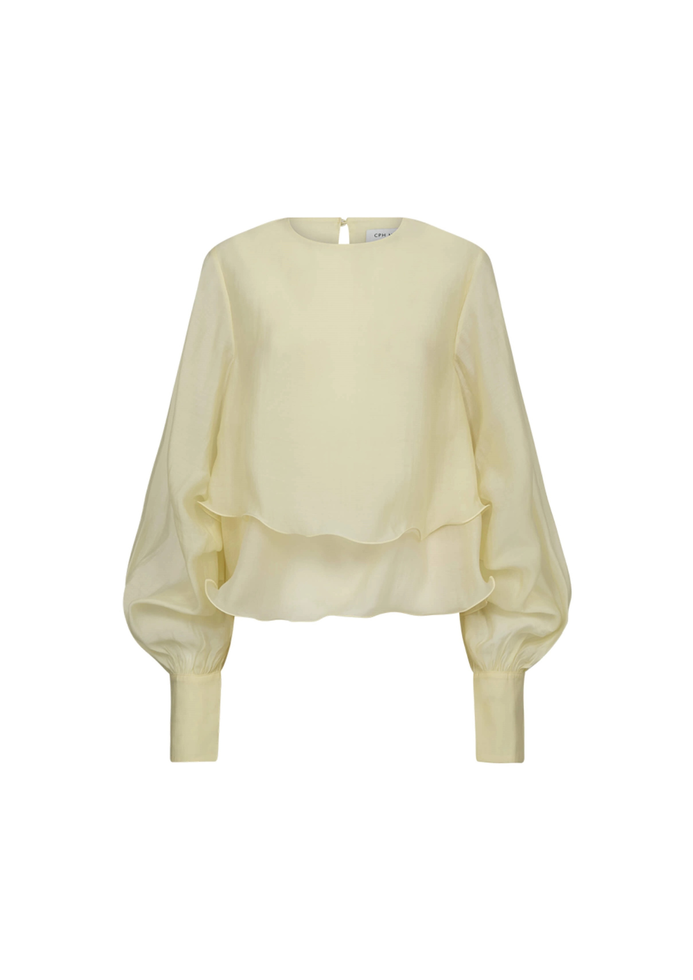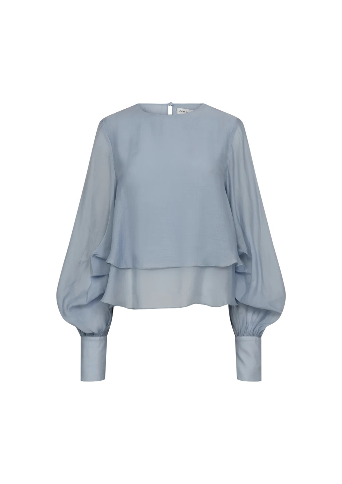 De CMTILLY-BLOUSE is een blouse met lange mouwen, gemaakt van een semi-transparante geweven stof met een soepele valling. Het model heeft een boxy silhouet en een extravagant gelaagd ruches-effect aan de zoom. De volumineuze, geplooide mouwen lopen taps toe in lange manchetten met met stof beklede knoopjes en de minimalistische halslijn heeft een sleutelgatuitsparing aan de achterkant. Het lijfje is dubbel gelaagd, terwijl de mouwen ongevoerd zijn, wat een elegant contrast creëert met de transparantie.
