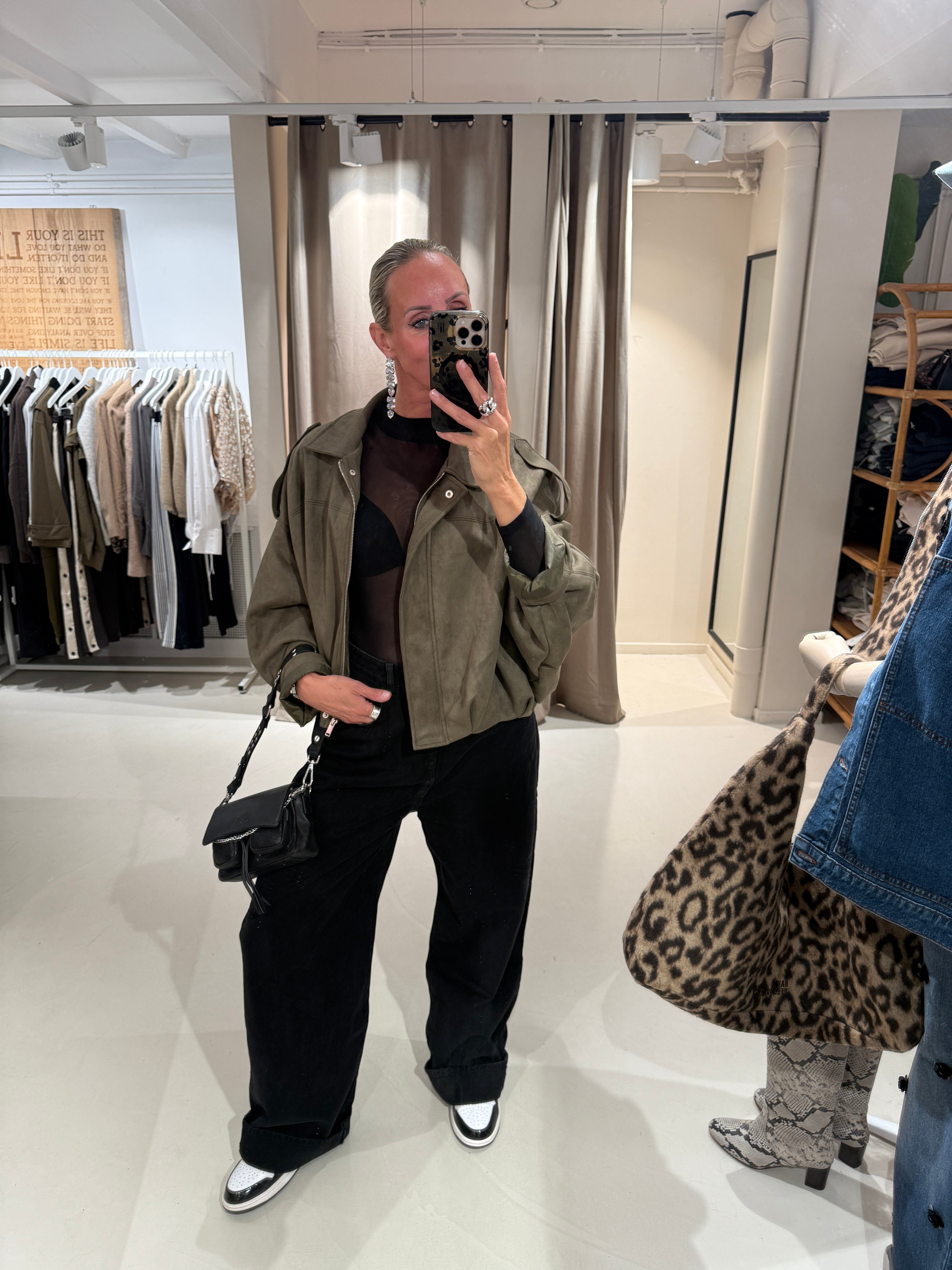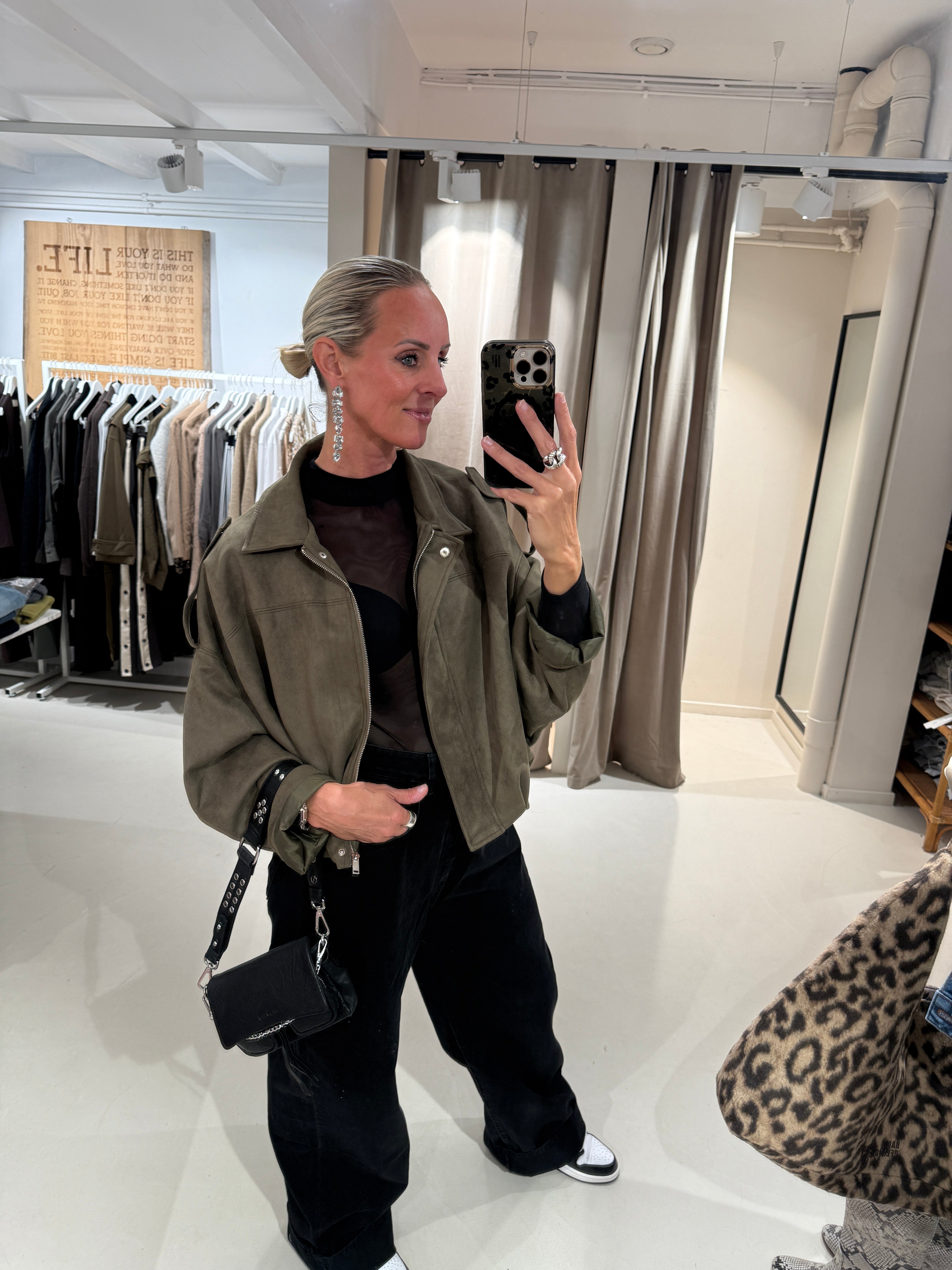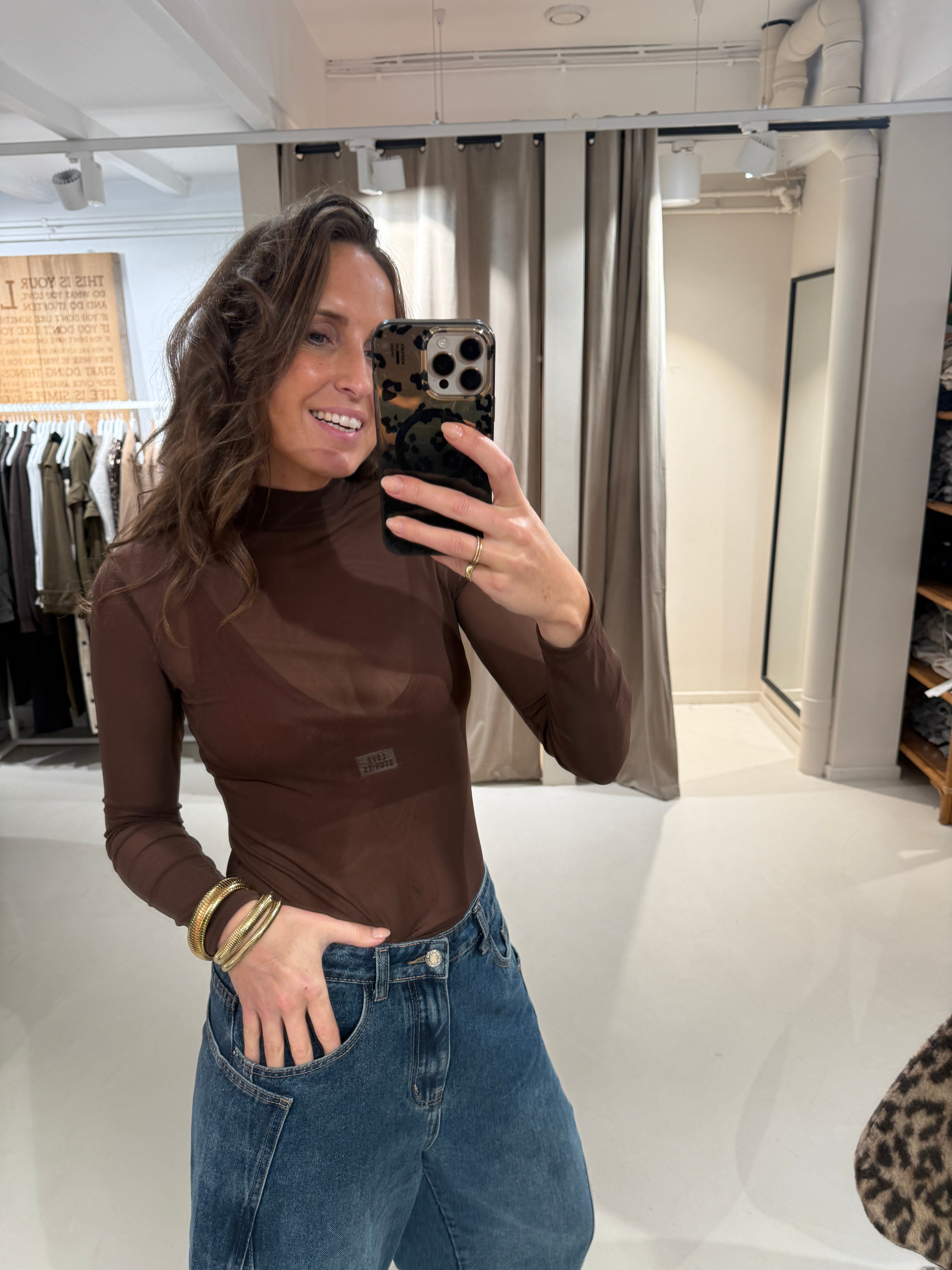 Body van mesh in donkerbruin of zwart met een klein opstaand kraagje en lange aansluitende mouwen.