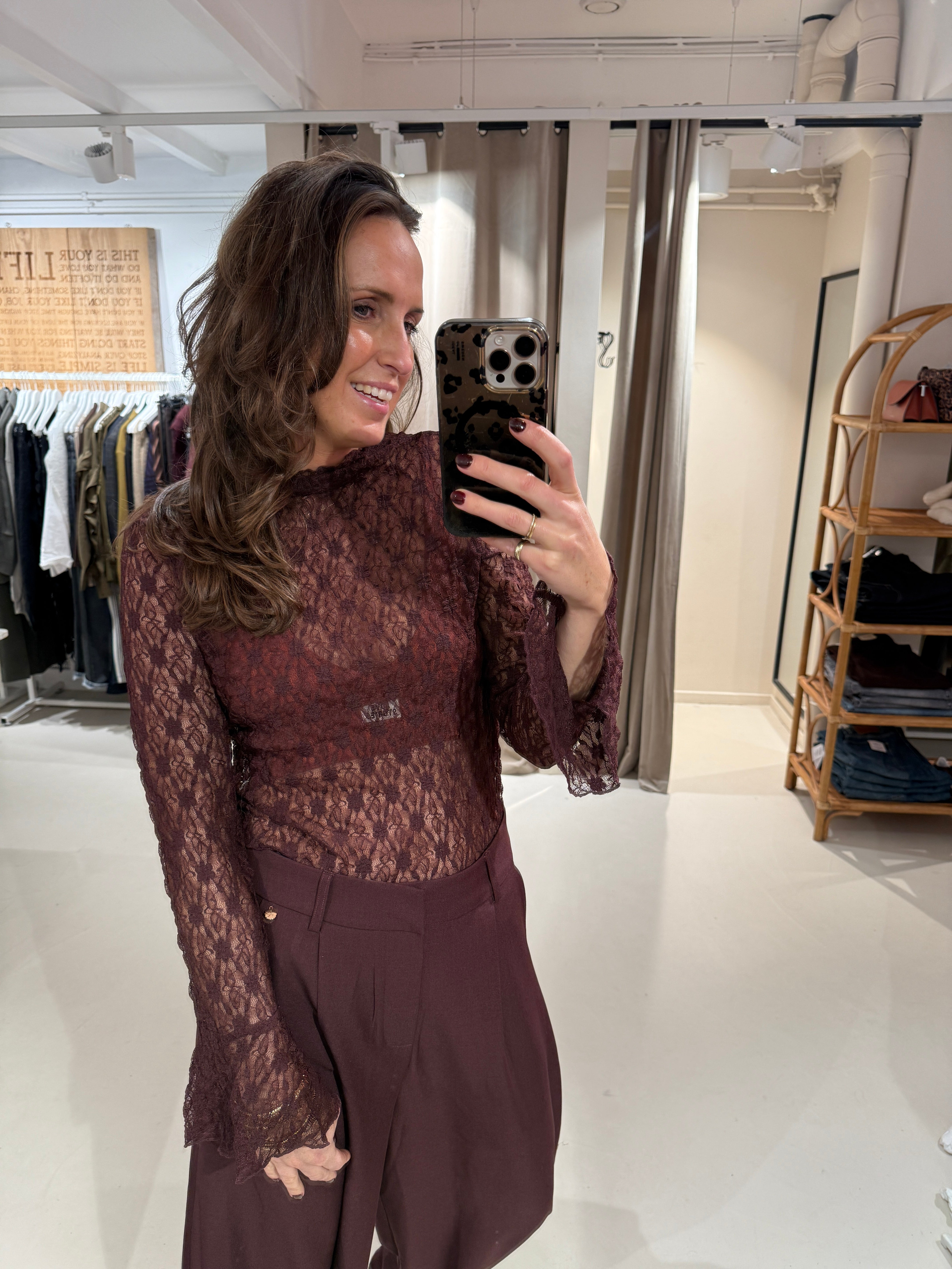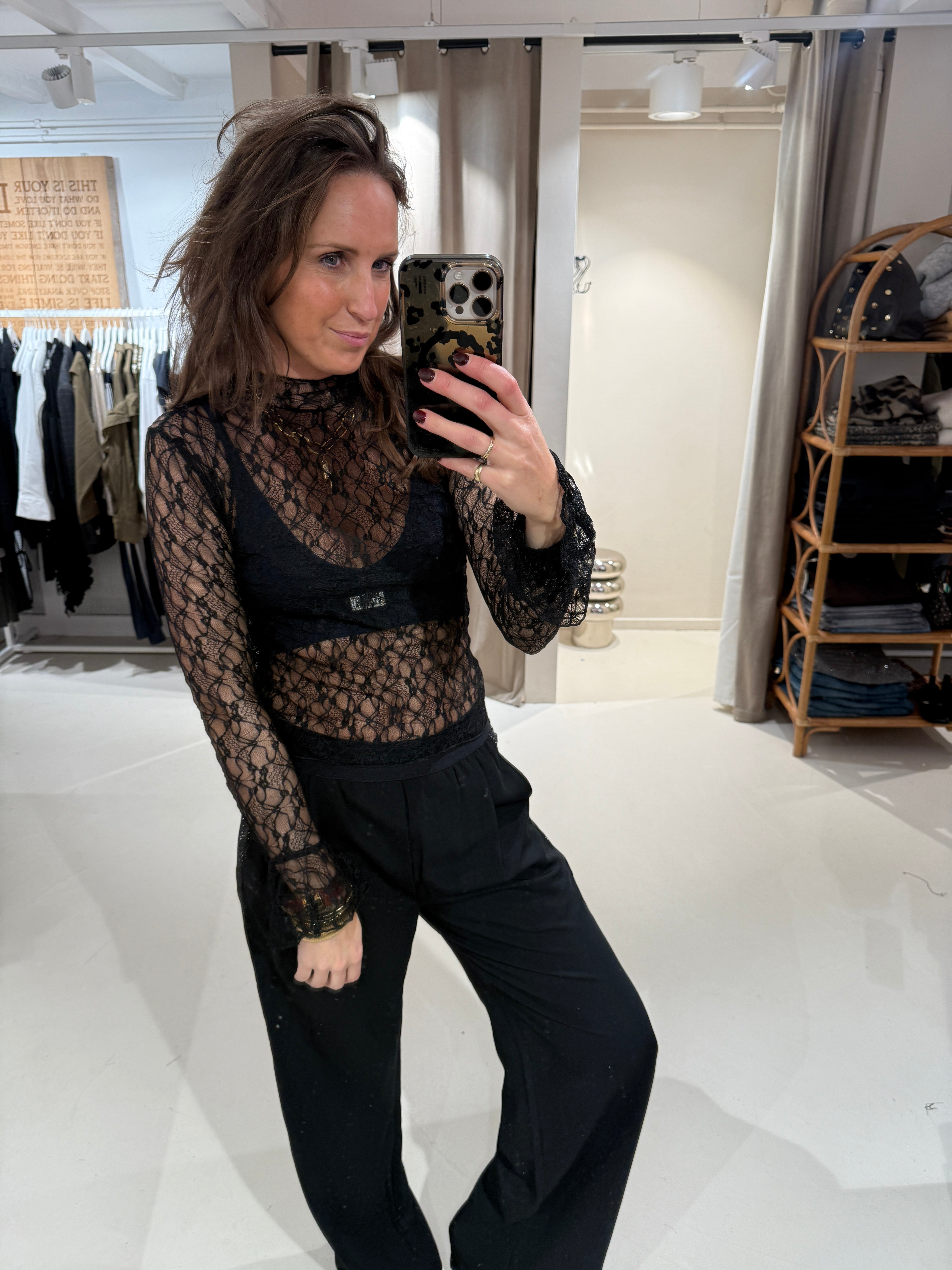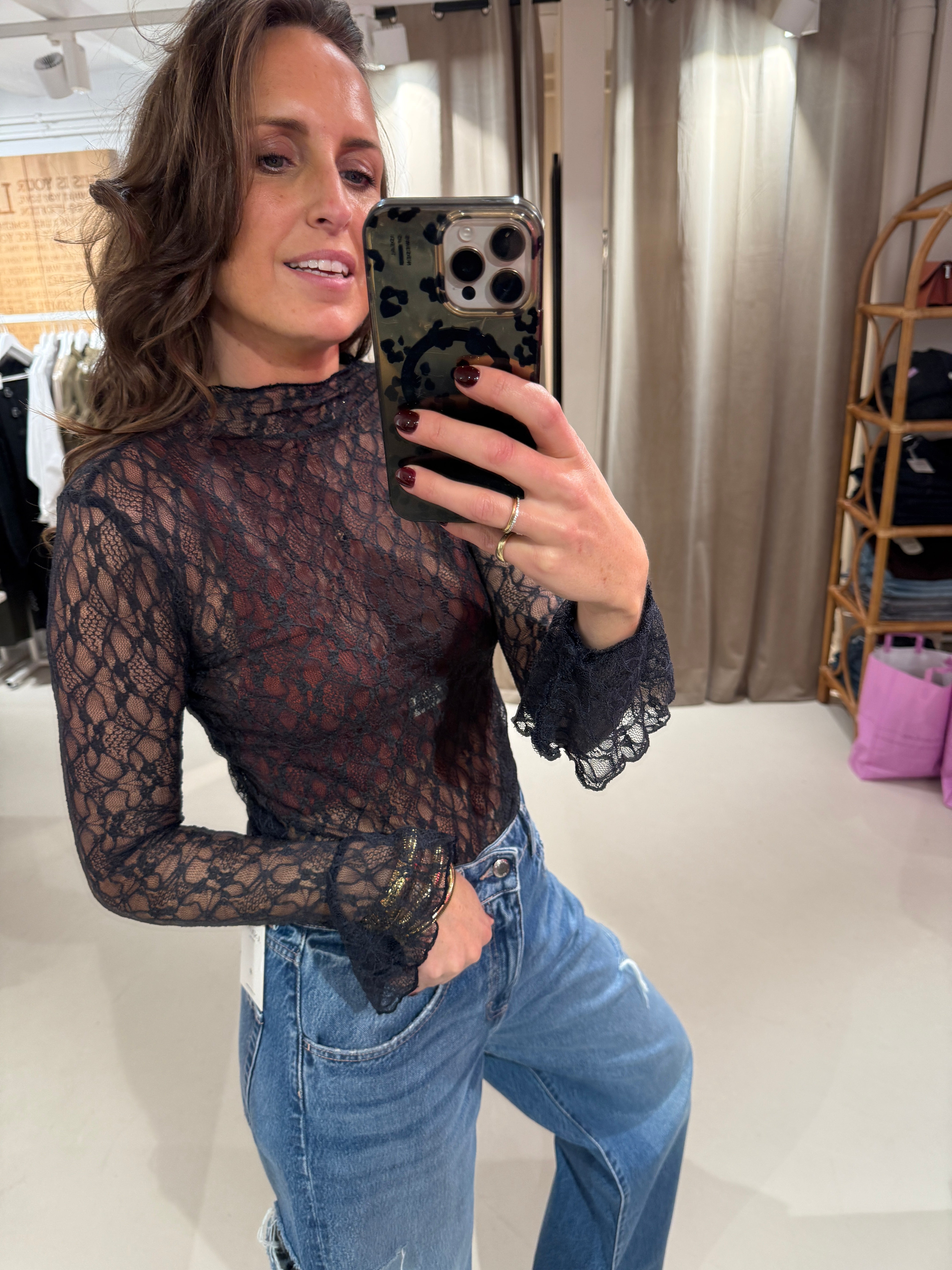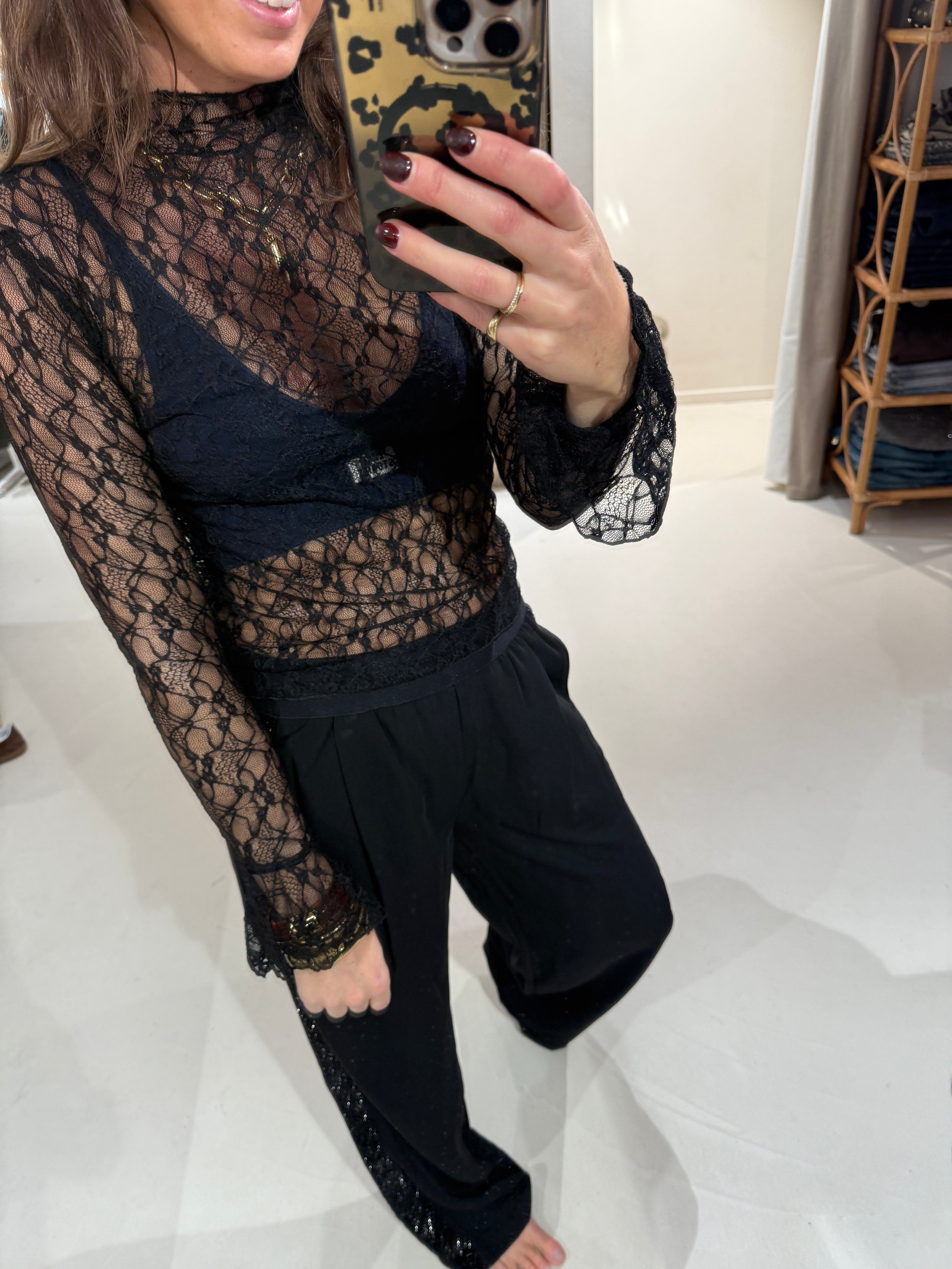 Turtleneck top in mesh kwaliteit met aansluitende mouwen en wijduitlopende manchetten.