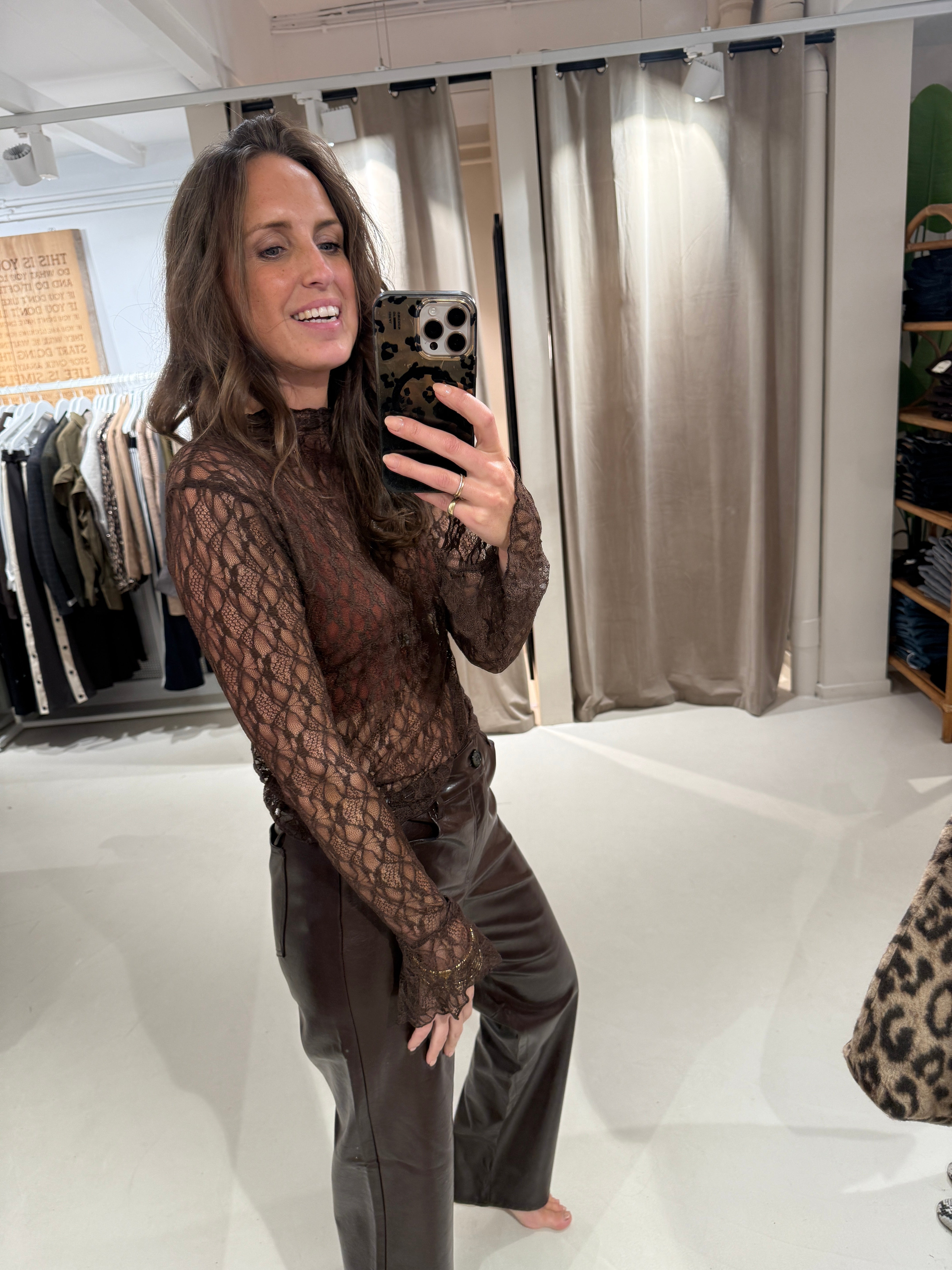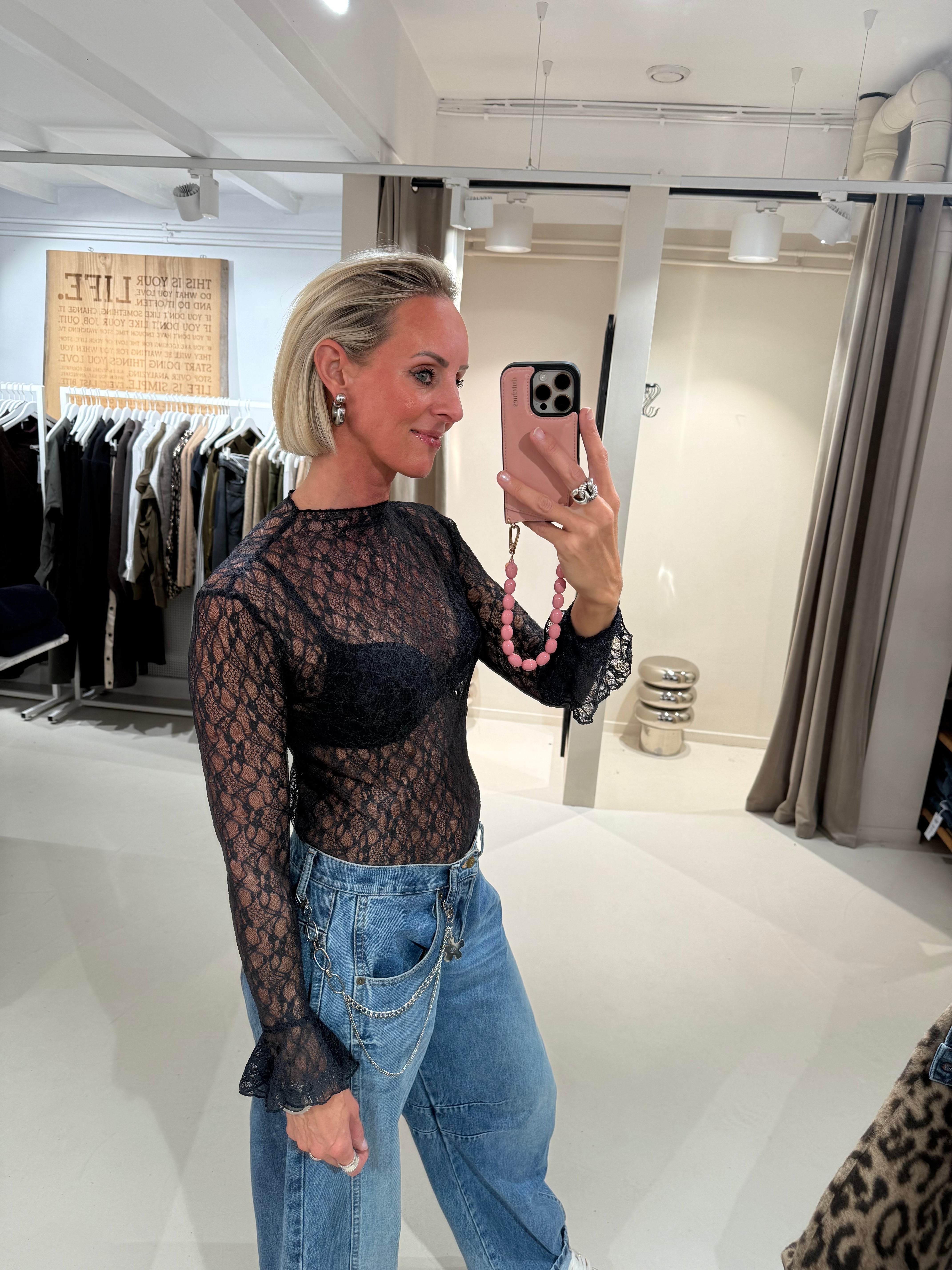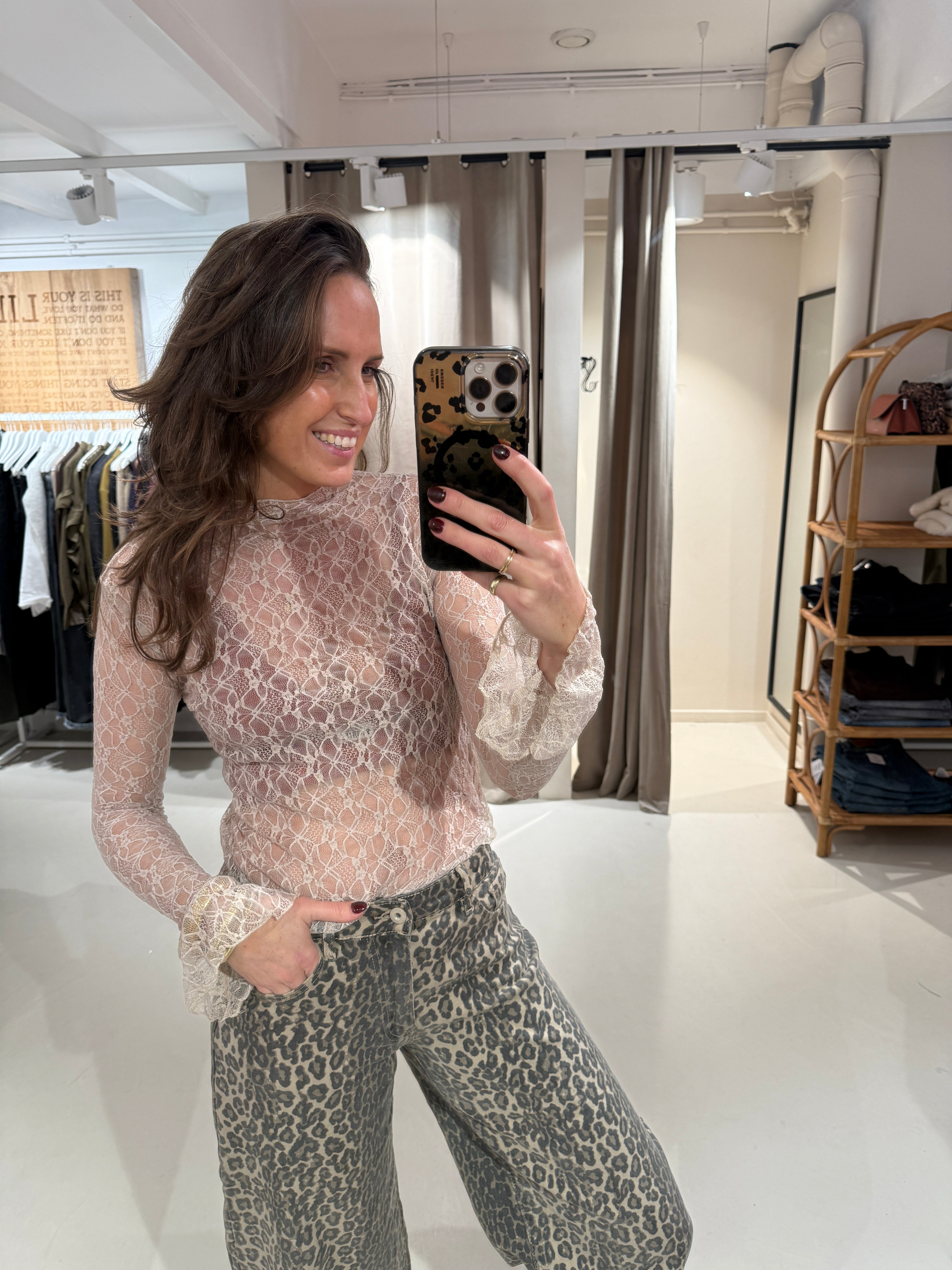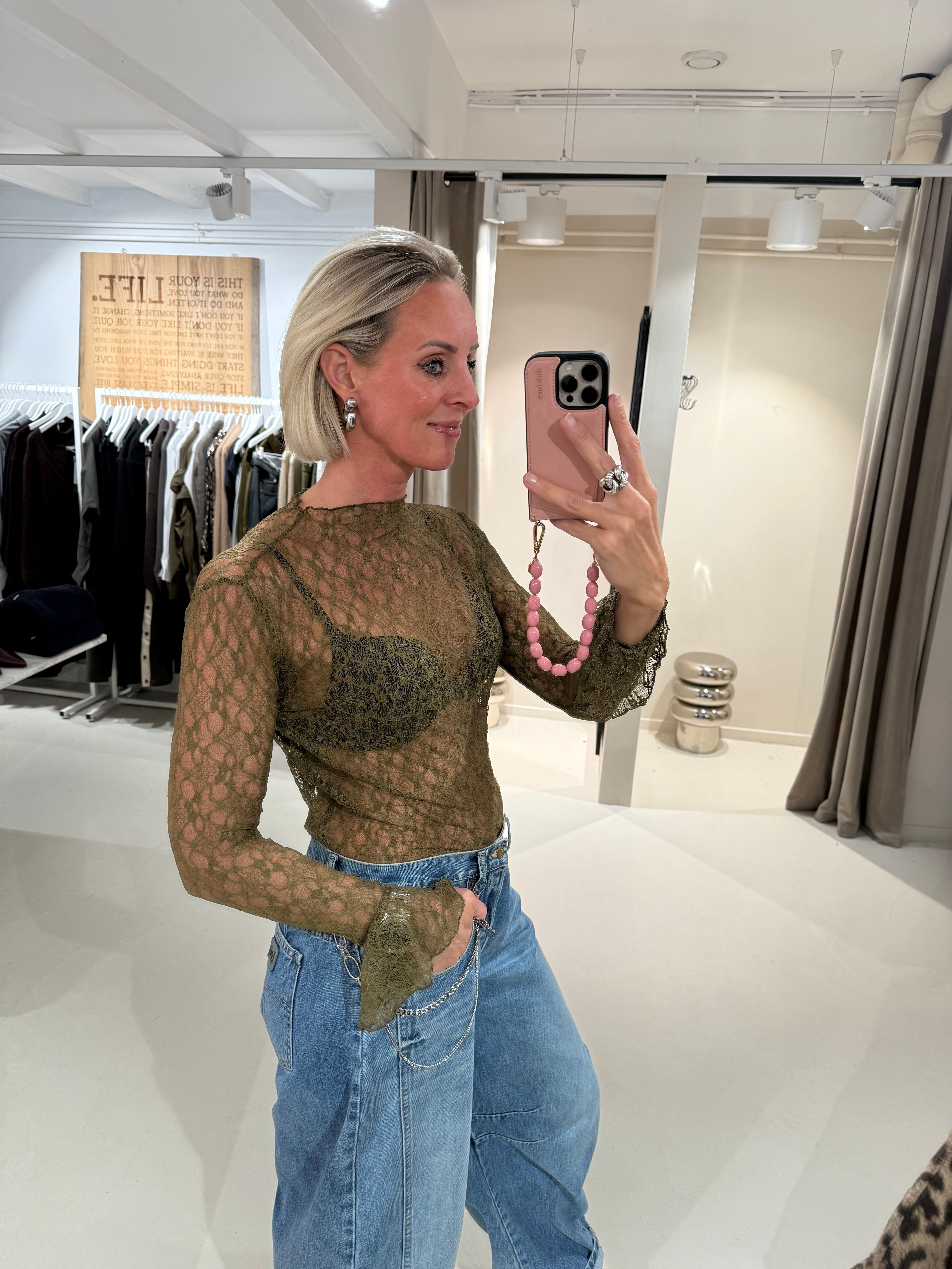 Turtleneck top in mesh kwaliteit met aansluitende mouwen en wijduitlopende manchetten.