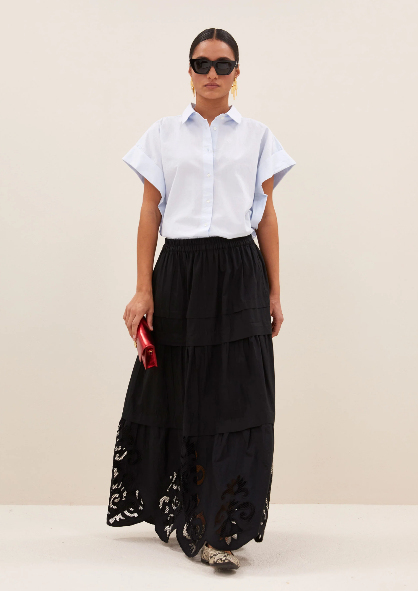 De perfecte aanvulling op jouw casual look! De pixie chambray blouse, een all-time classic in casual stijl. Gemaakt van katoenkwaliteit, biedt deze losse pasvorm met korte mouwen en een kraag een ontspannen en comfortabele look. Combineer de blouse met lauren skirt voor de perfecte look!