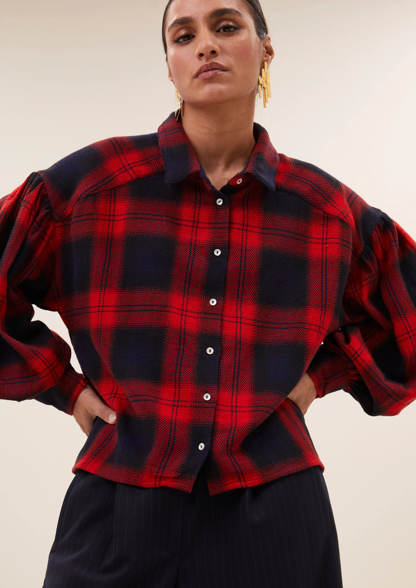 De sarah short red check blouse, een elegantie blouse met een comfortabele, losse pasvorm die perfect is voor elke gelegenheid. De korte lengte en speelse, volumineuze lange mouwen geven je outfit een frisse, levendige uitstraling. Parelmoeren knopen zorgen voor een subtiele, elegante touch, perfect voor een stijlvolle look!