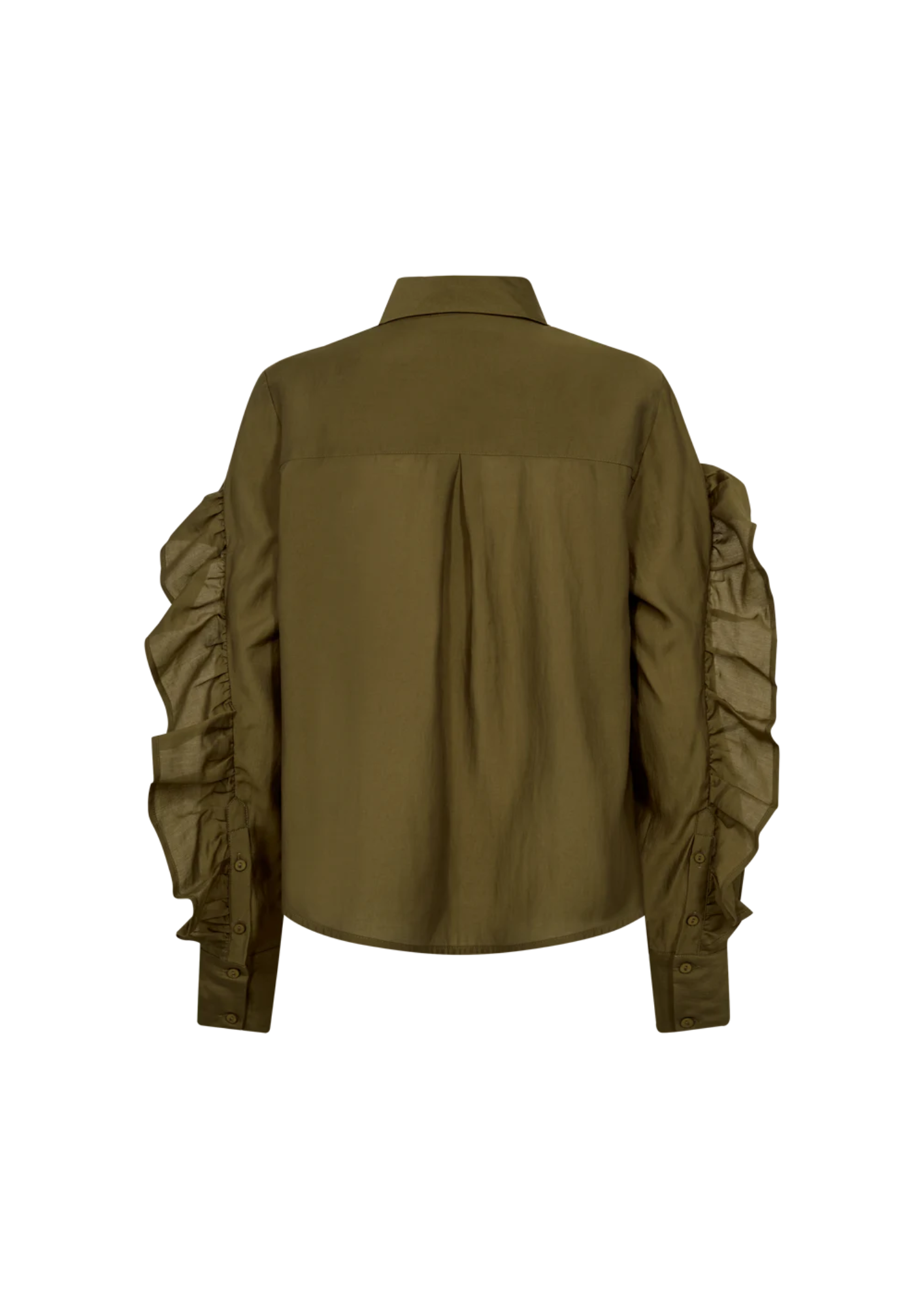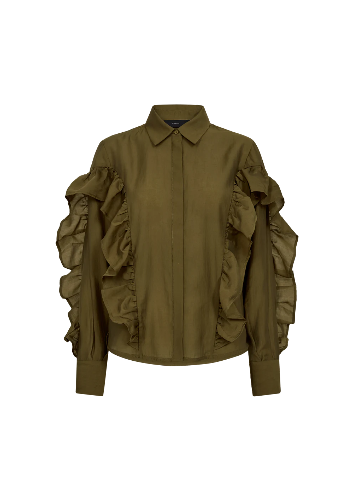 Het Molly Shirt is een overhemd van premium materiaal met een verborgen knoopsluiting aan de voorkant, een delicate kraag en lange mouwen met elegante, grote volants.