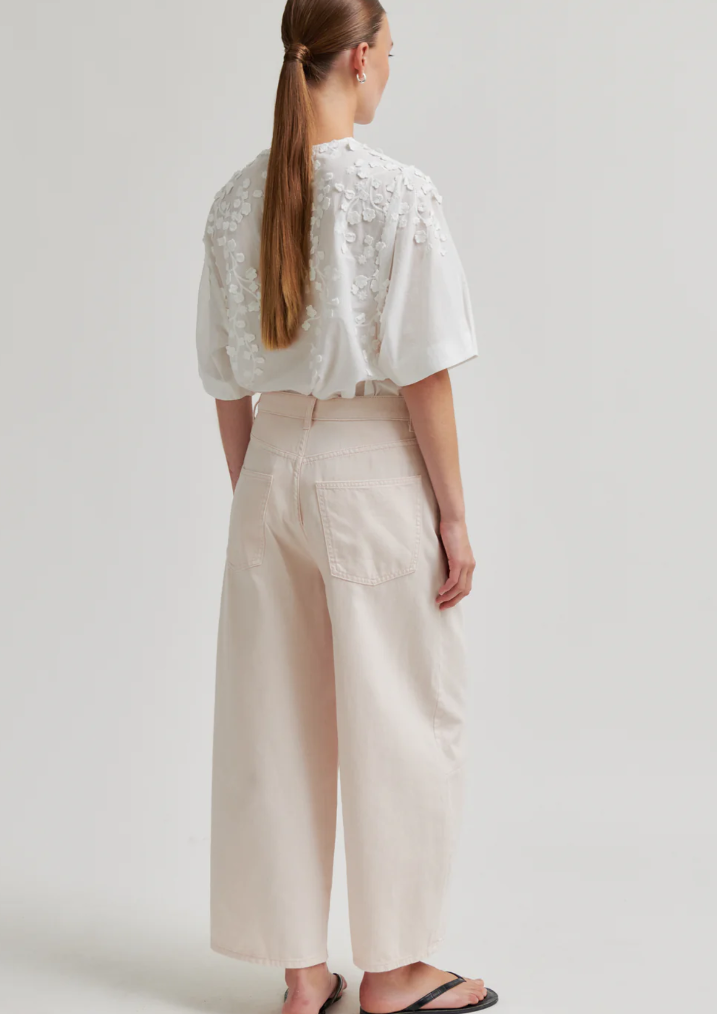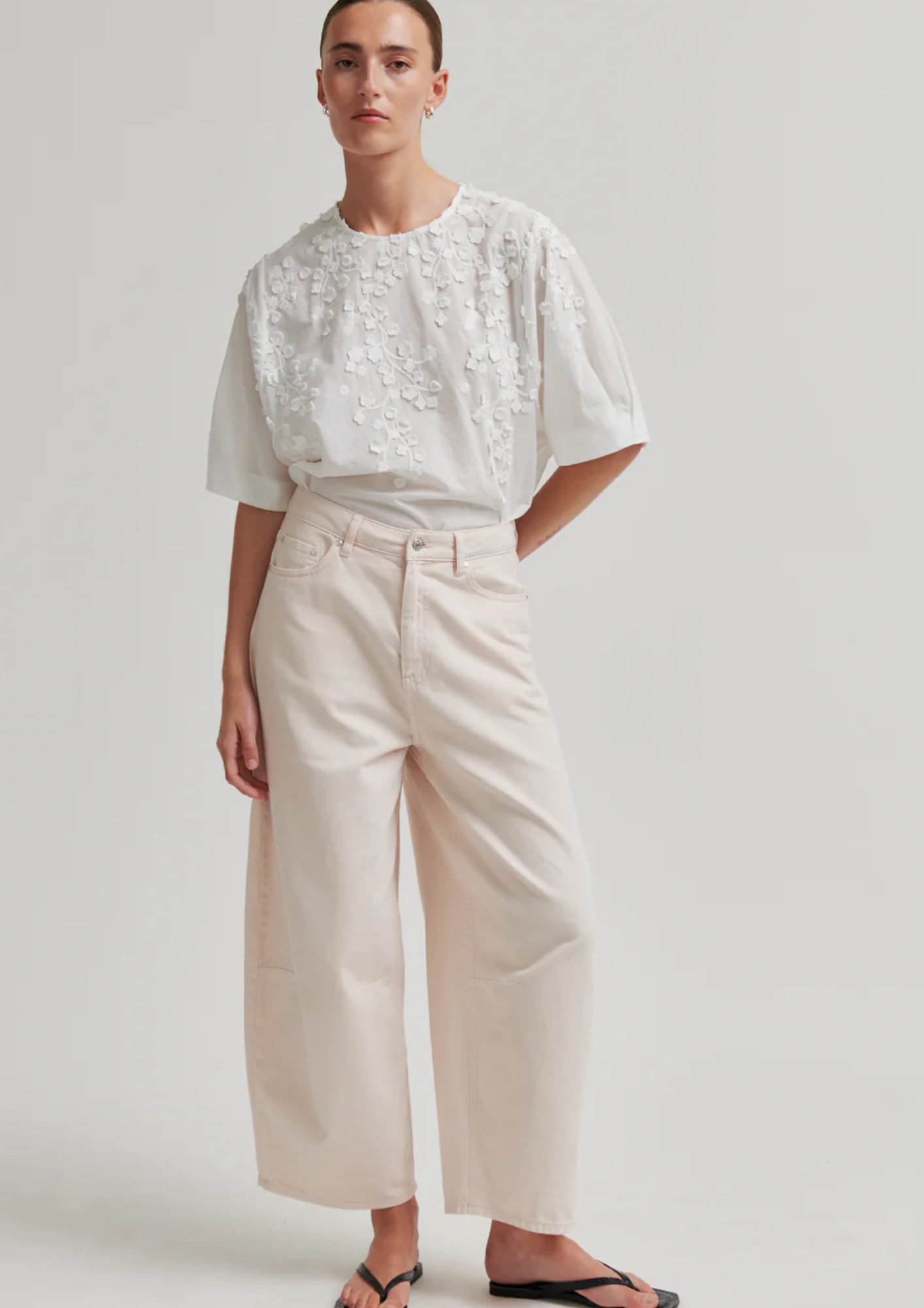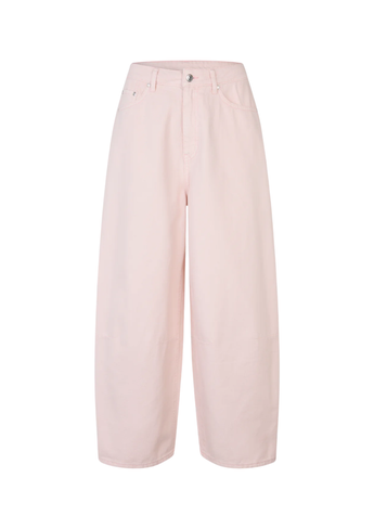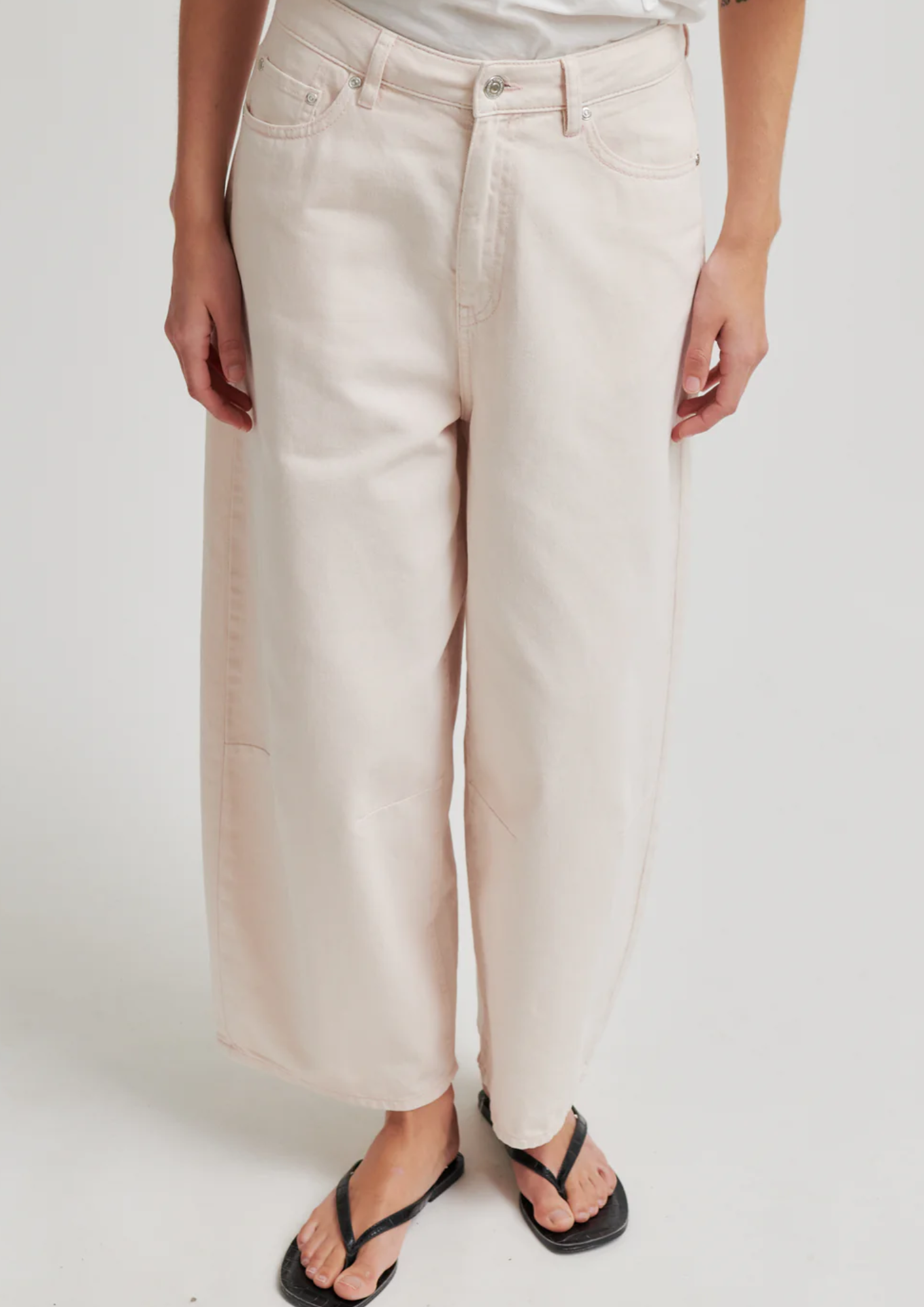 Cropped jeans van Second Female. De jeans is gemaakt van crèmekleurig katoenen denim met bijpassende stiksels. Voorzien van een verborgen ritssluiting en knoop aan de voorkant. Vijf zakken. Zilverkleurige knoop en klinknagels. Middelhoge taille met cropped, baggy pijpen.