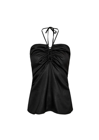 Prachtige top van Haute L'amitie in de mooiste ton-sur-ton print. De top heeft mooie knoopdetails aan de voorkant en bandjes die je in de nek kunt strikken. De draperie aan de zijkanten zorgt voor een prachtig silhouet.