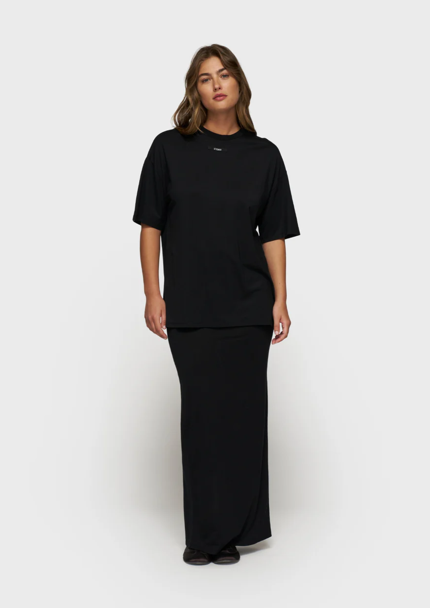 Regular fit lange rok van lyocell jersey met een mid waist elastische tailleband. Voorzien van een split aan de achterkant en afgewerkt met een subtiel logo detail net onder de tailleband.
