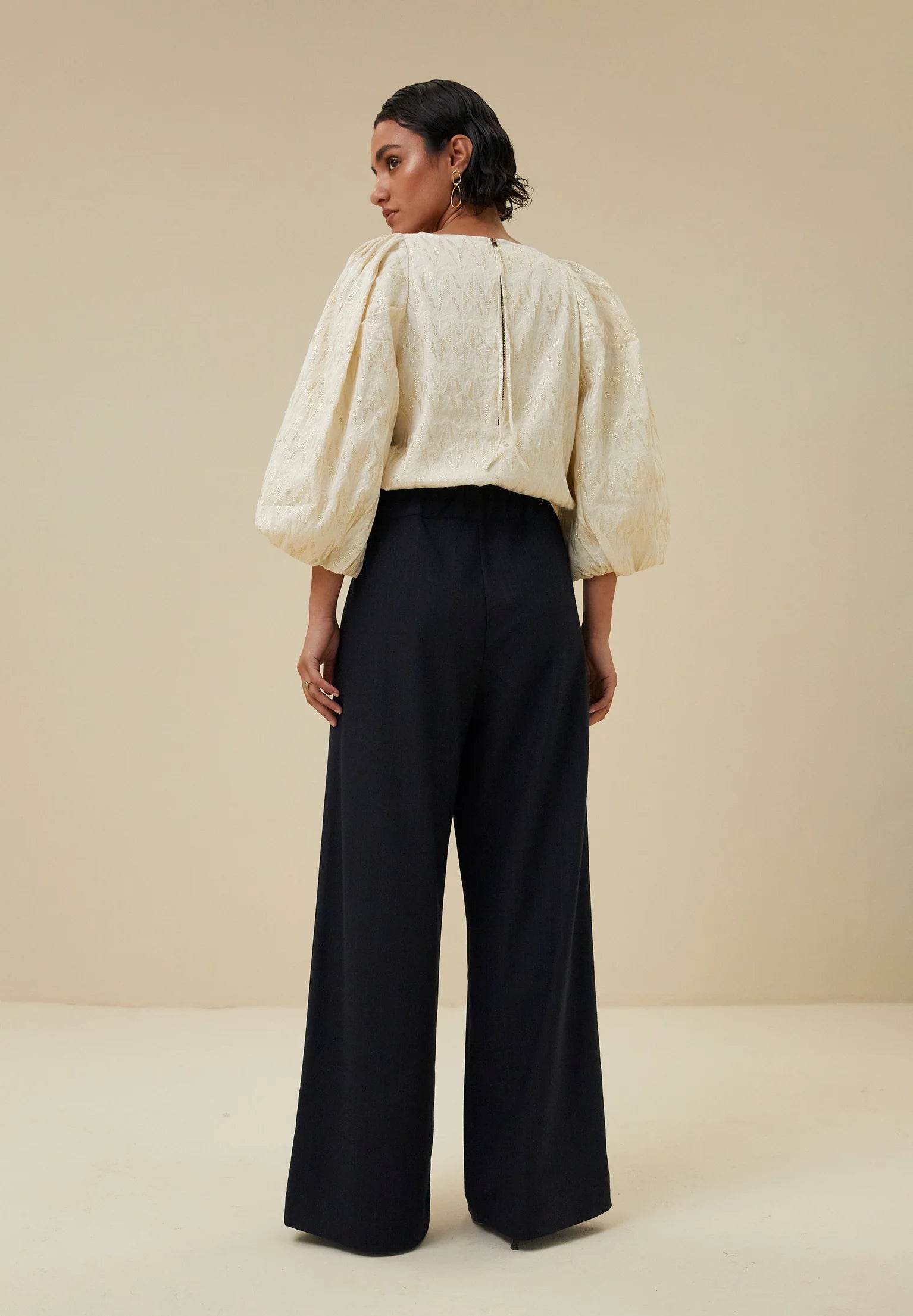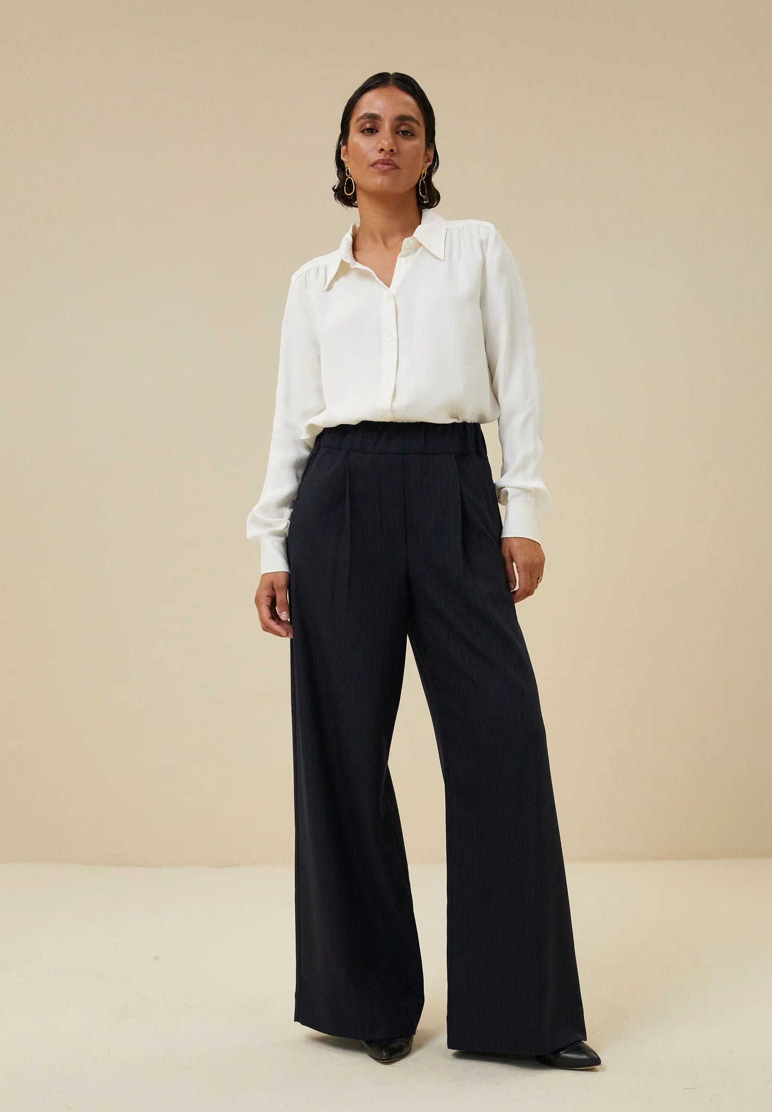 Elegantie en comfort? Dat is de benji pinstripe pant! De broek heeft een mid rise elastische tailleband, plooien aan de voorkant, steekzakken en wijde broekspijpen. Combineer met de bijpassende jill pinstripe jacket.