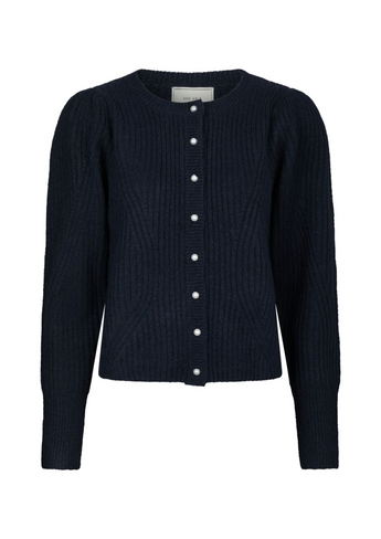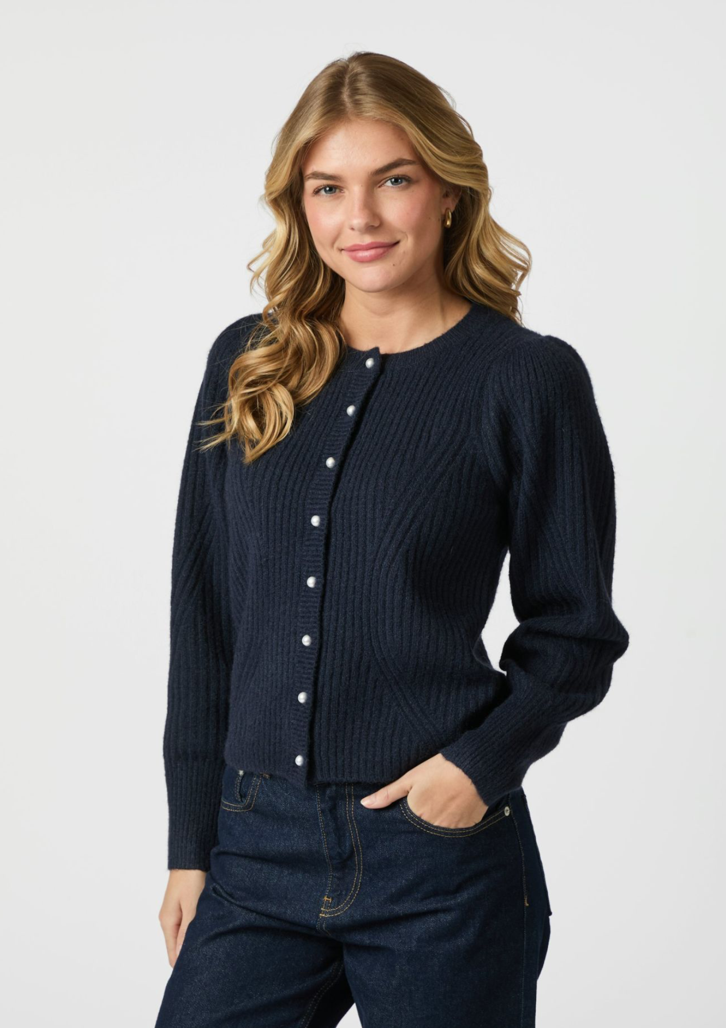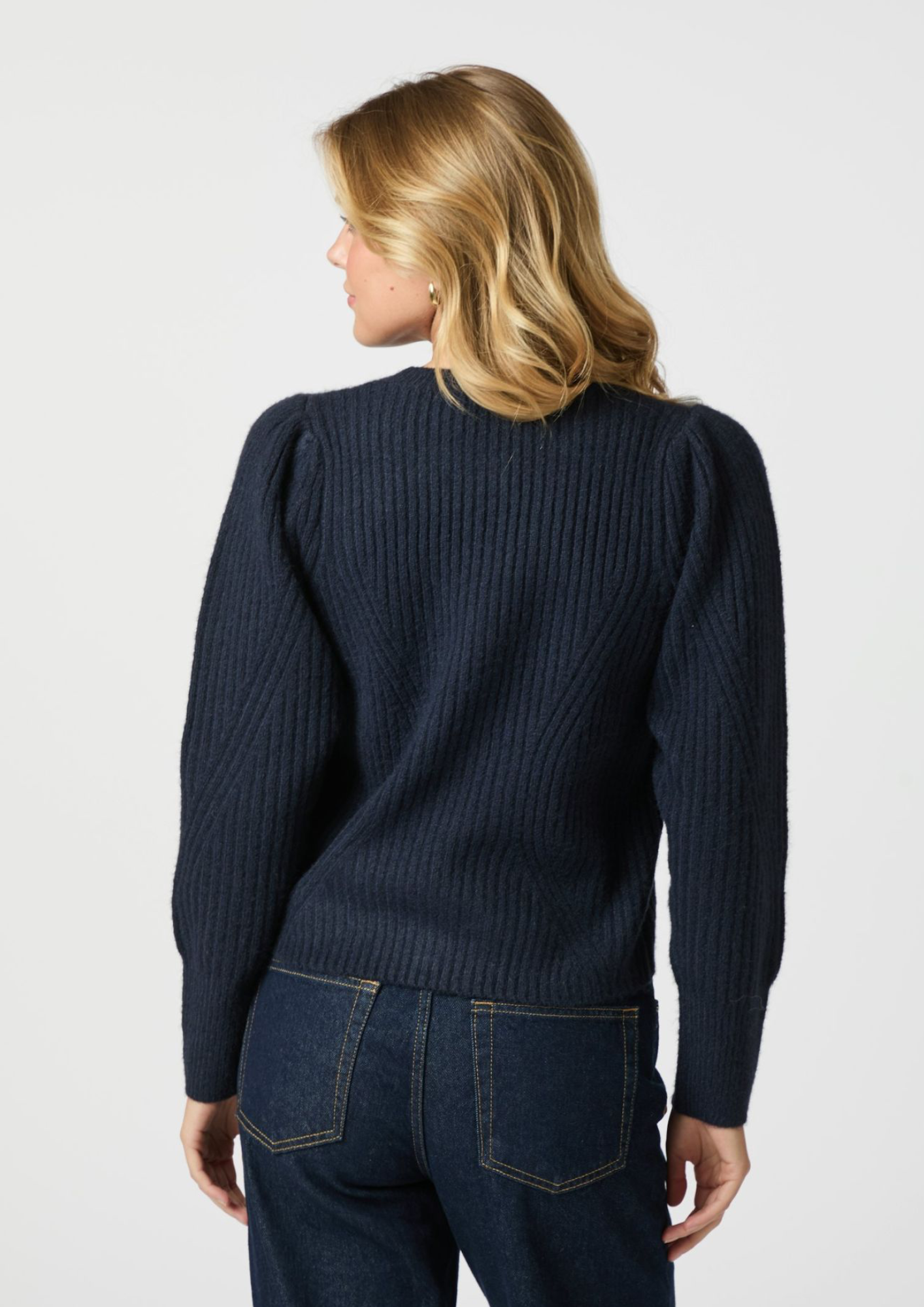 Vrouwelijk aansluitend gebreid vest met lange mouwen, met pofmouwen en een gestreepte textuur in het garen.