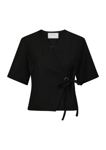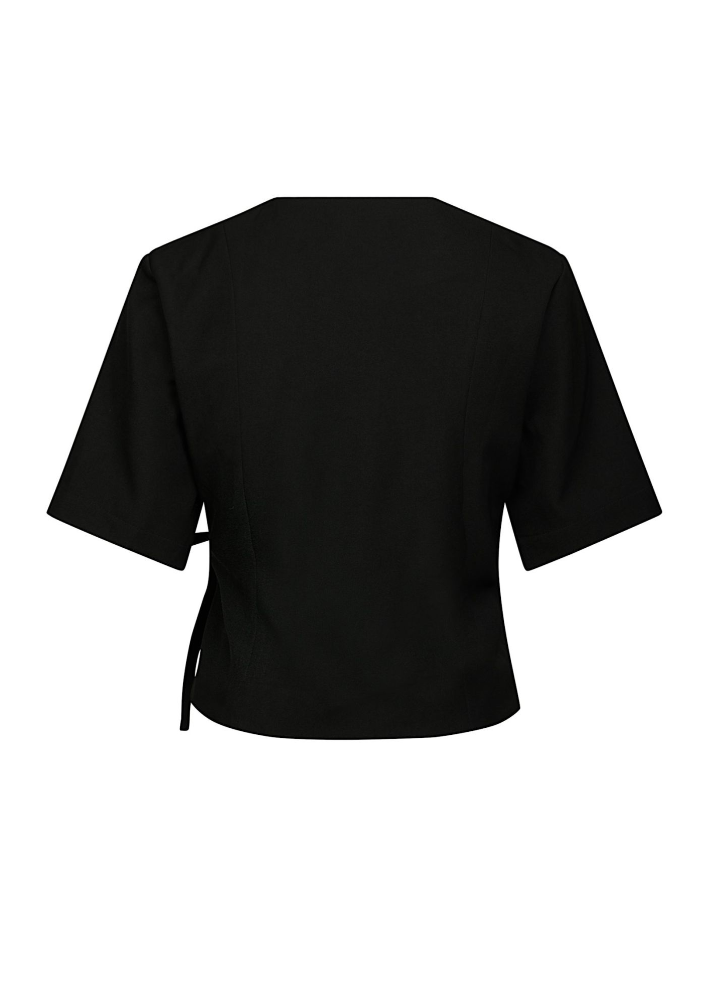 Getailleerde blouse met korte mouwen en wikkeleffect, o-ringdetails en strikbandjes. De kwaliteit is geweven en zacht met elastaan.