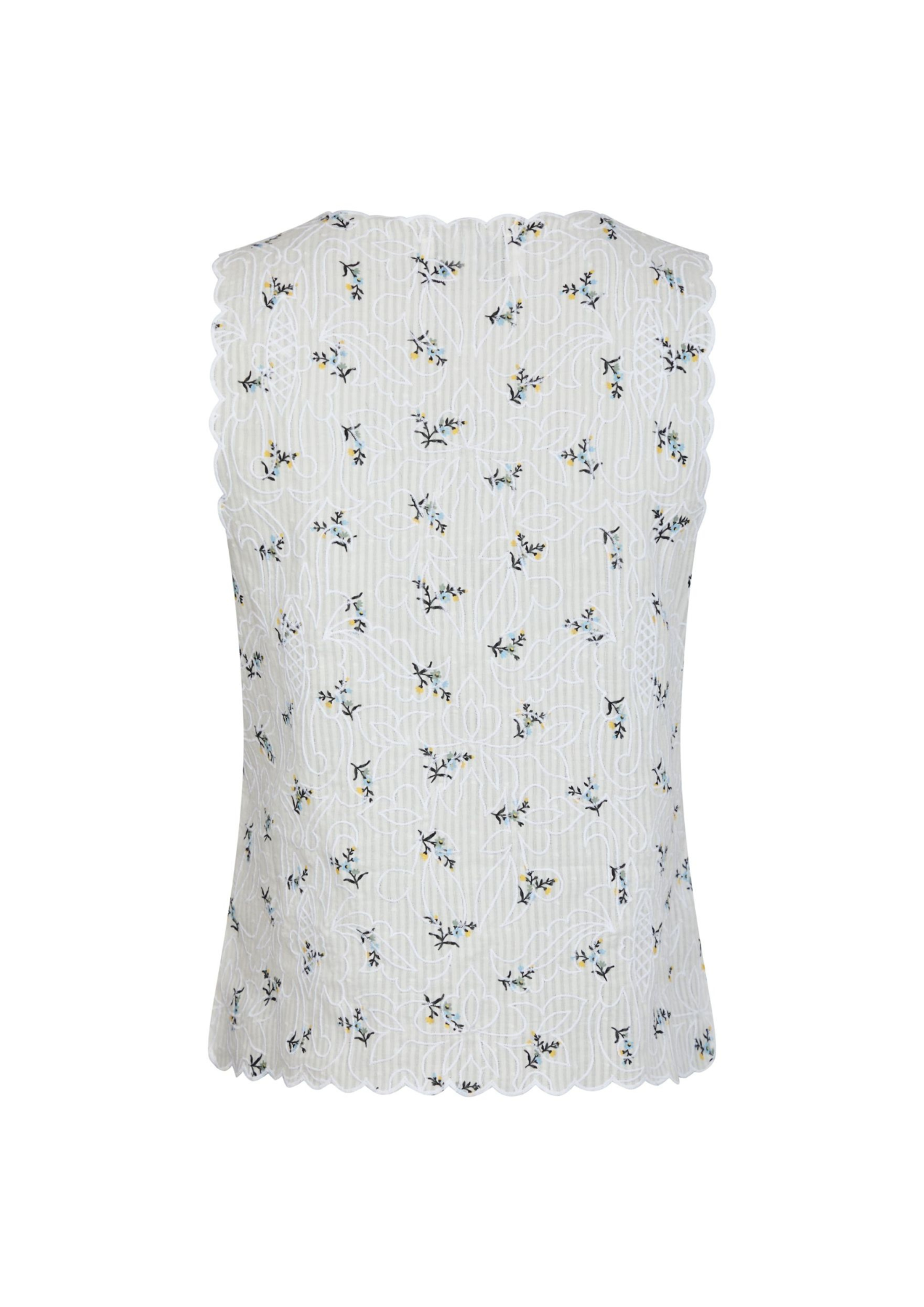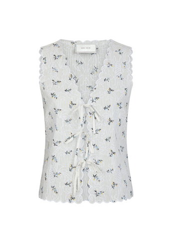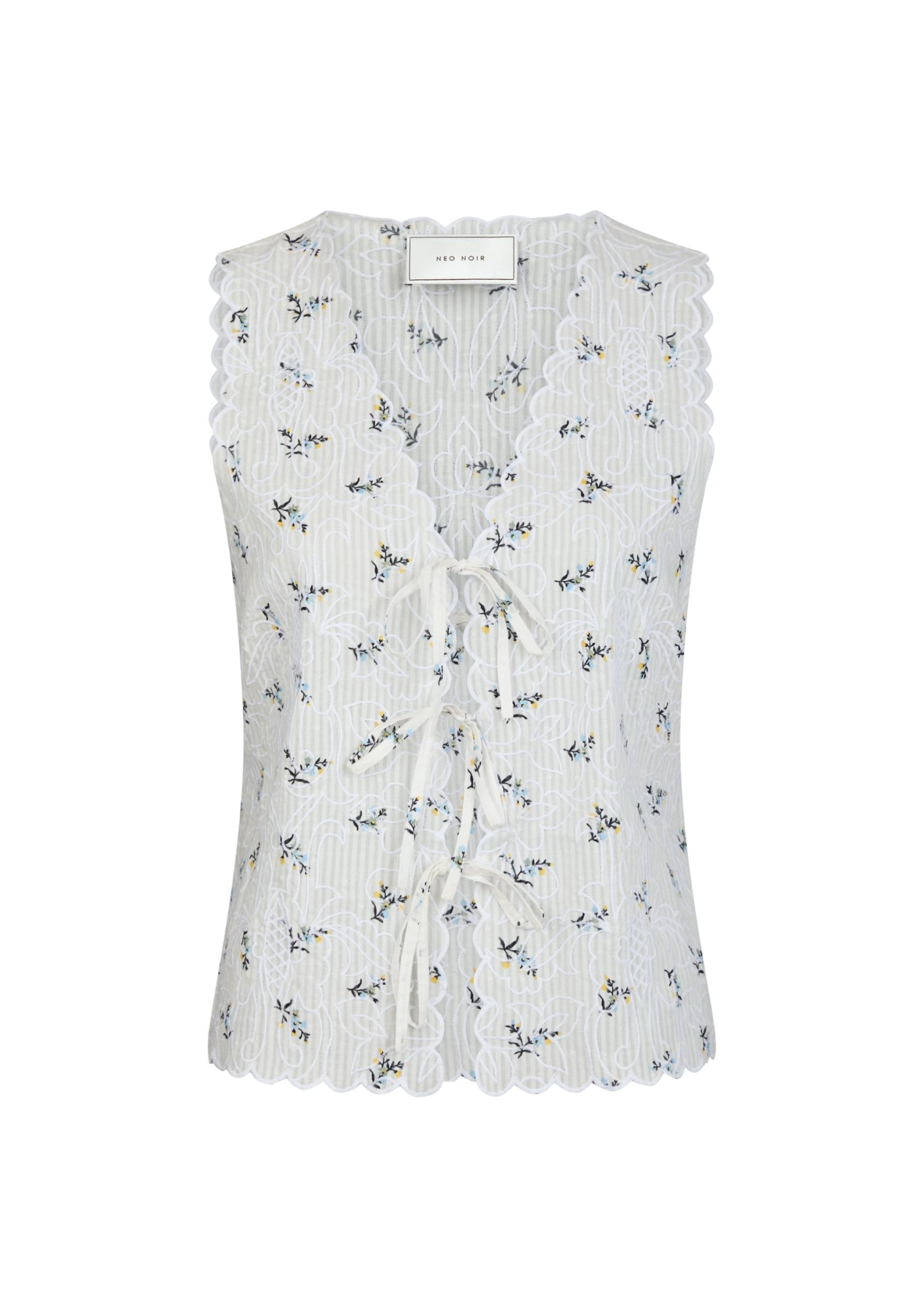 Superleuk topje met strikbandje aan de voorkant. Het topje heeft een lieflijke bloemenprint en is gemaakt van broderie anglaise stof, met een V-hals.