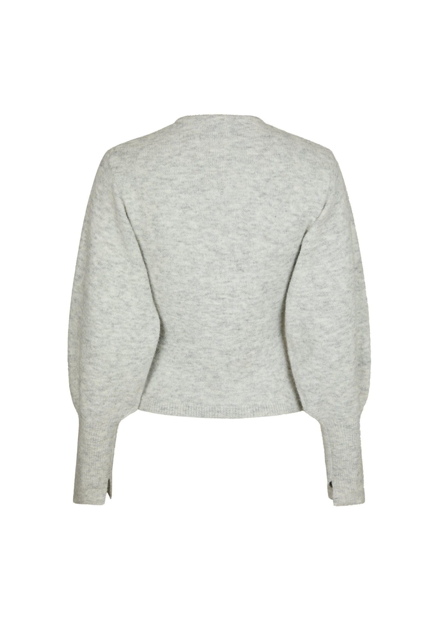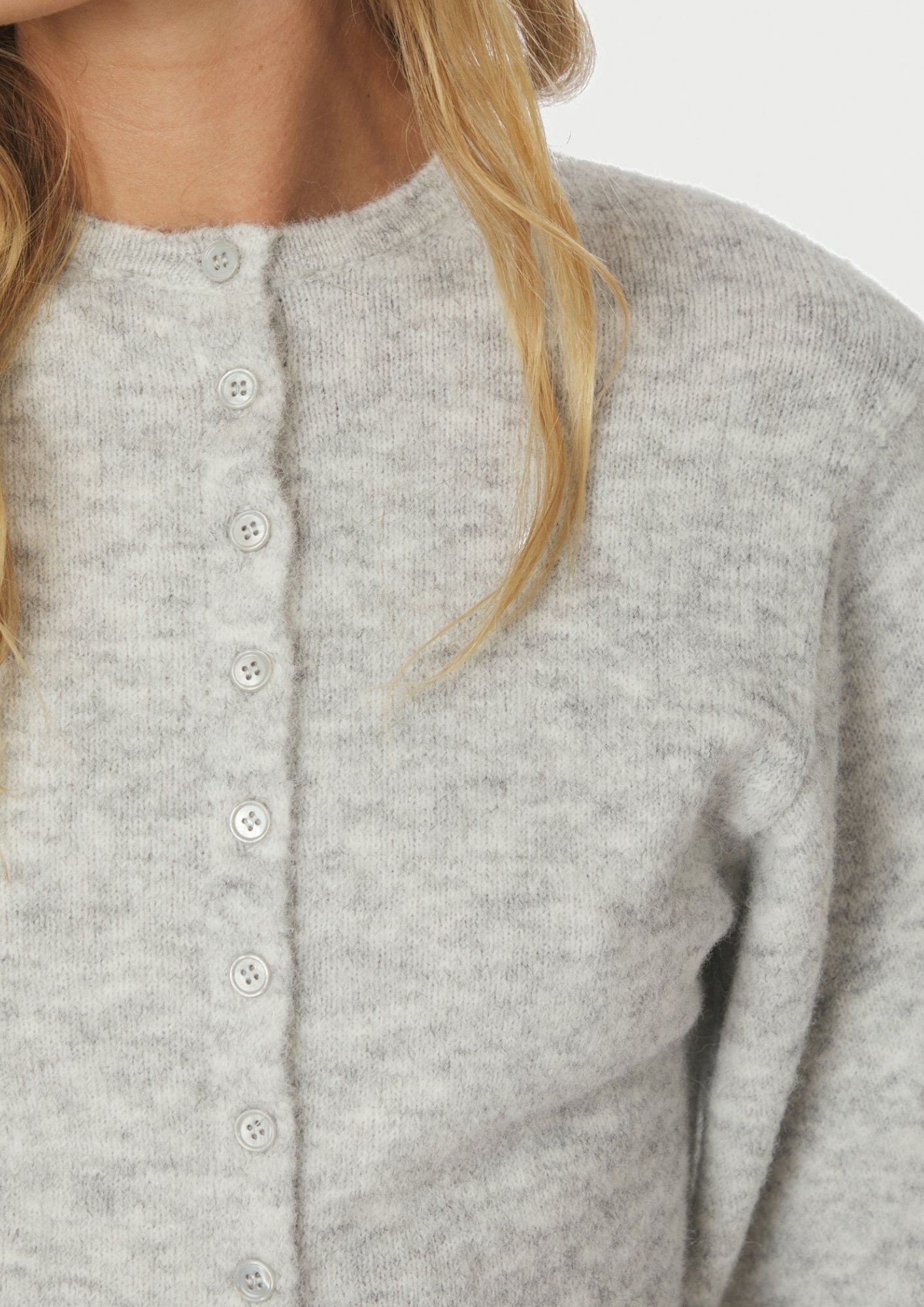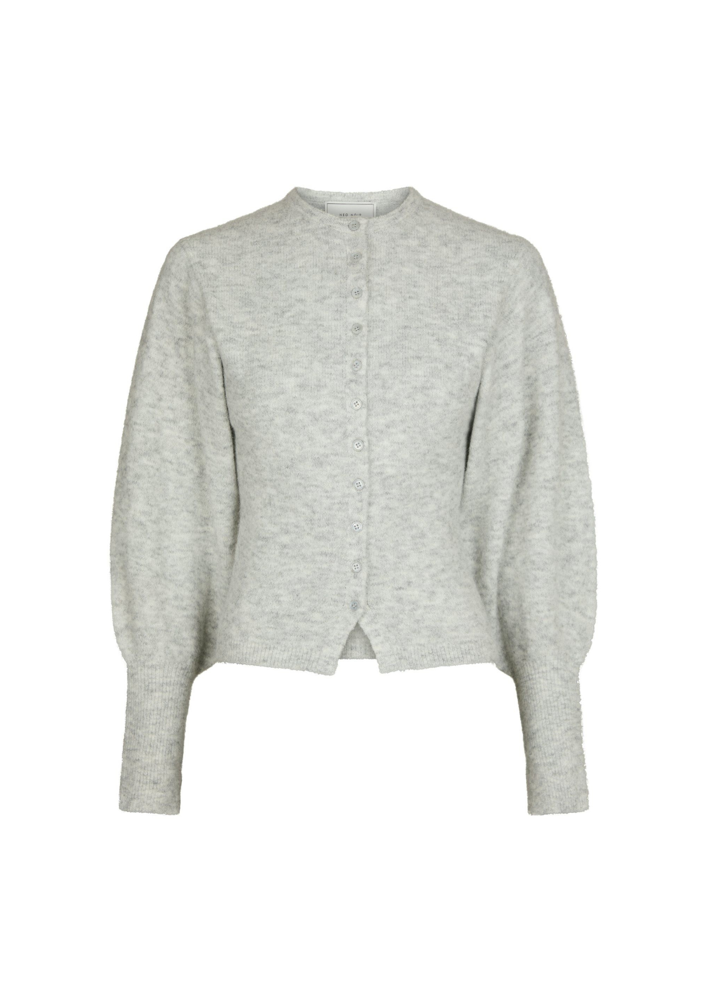 Gebreid vest met lange mouwen. Het vest heeft een ronde hals en een knoopsluiting aan de voorkant. Het heeft brede schouders en bovenarmen en sluit nauw aan bij de taille en de mouwuiteinden.