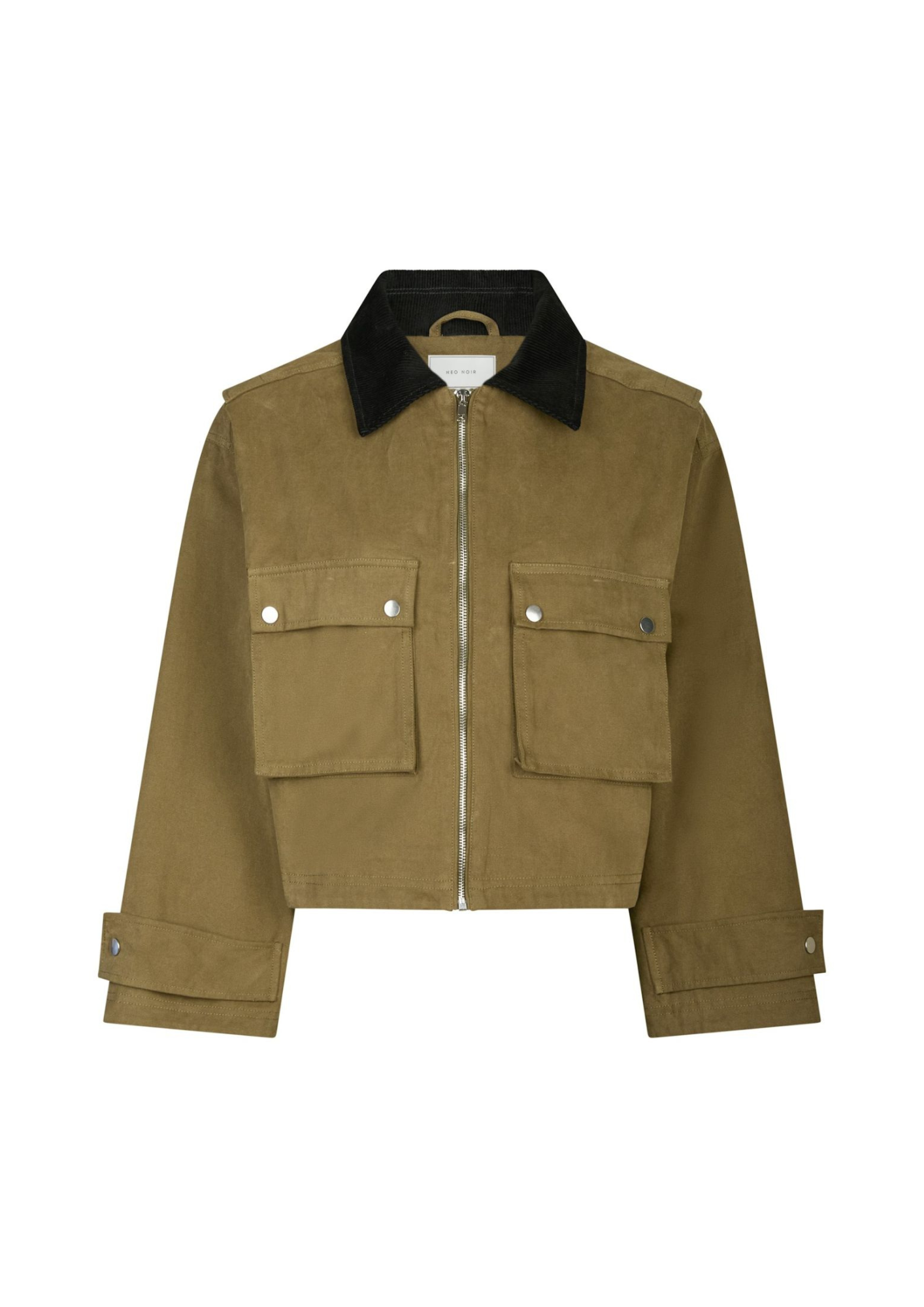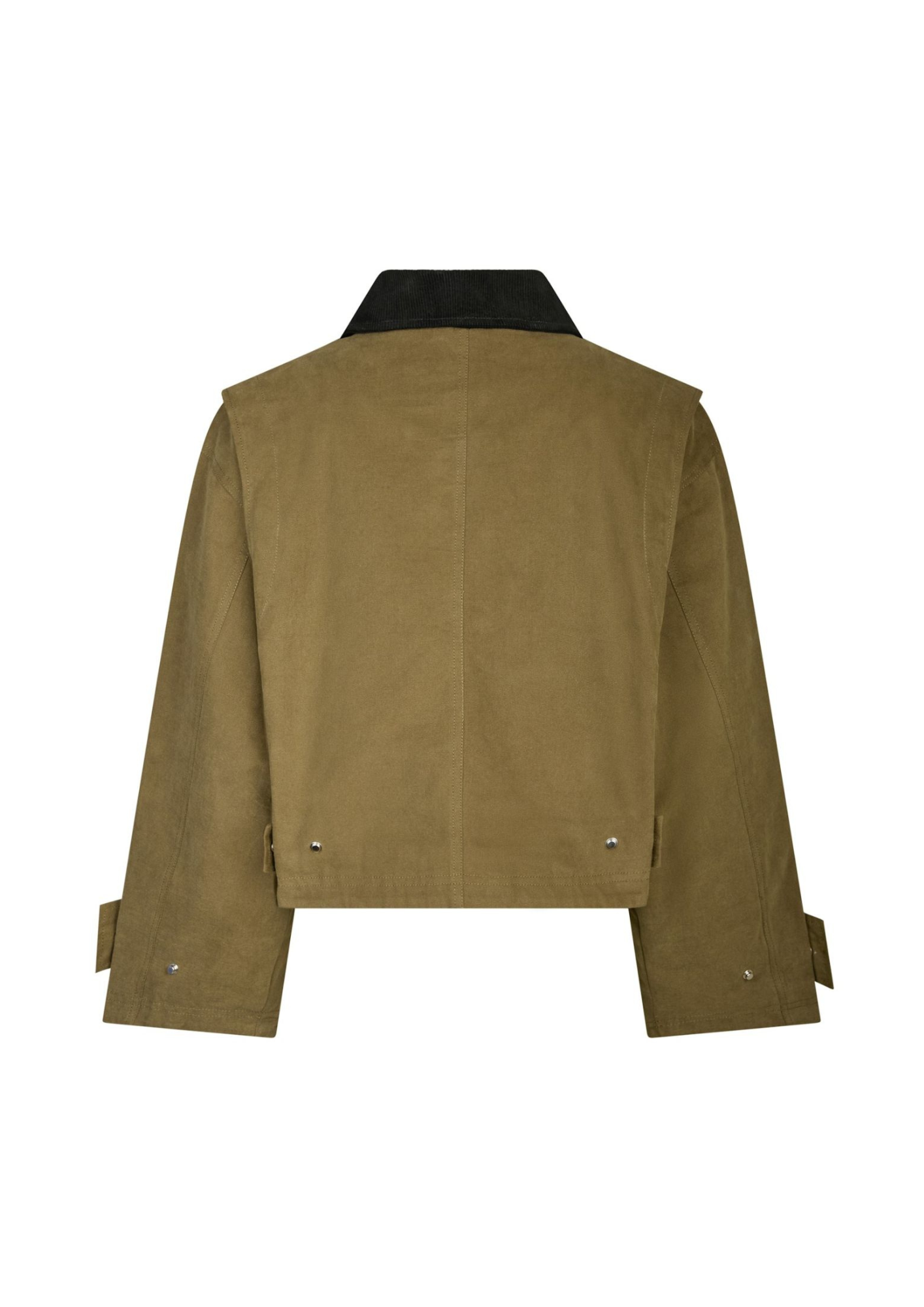 Supercoole jas met verlaagde schouders en kraag in contrasterende kleur. De kwaliteit is een mooi gewassen canvas met sluiting aan de voorkant