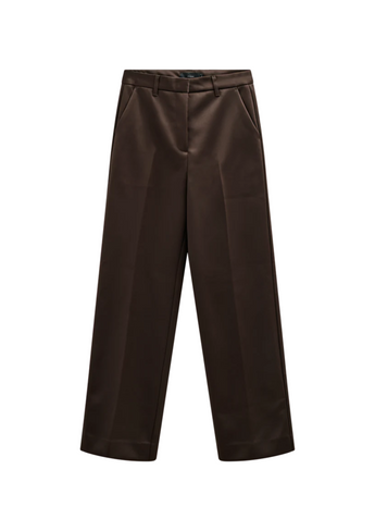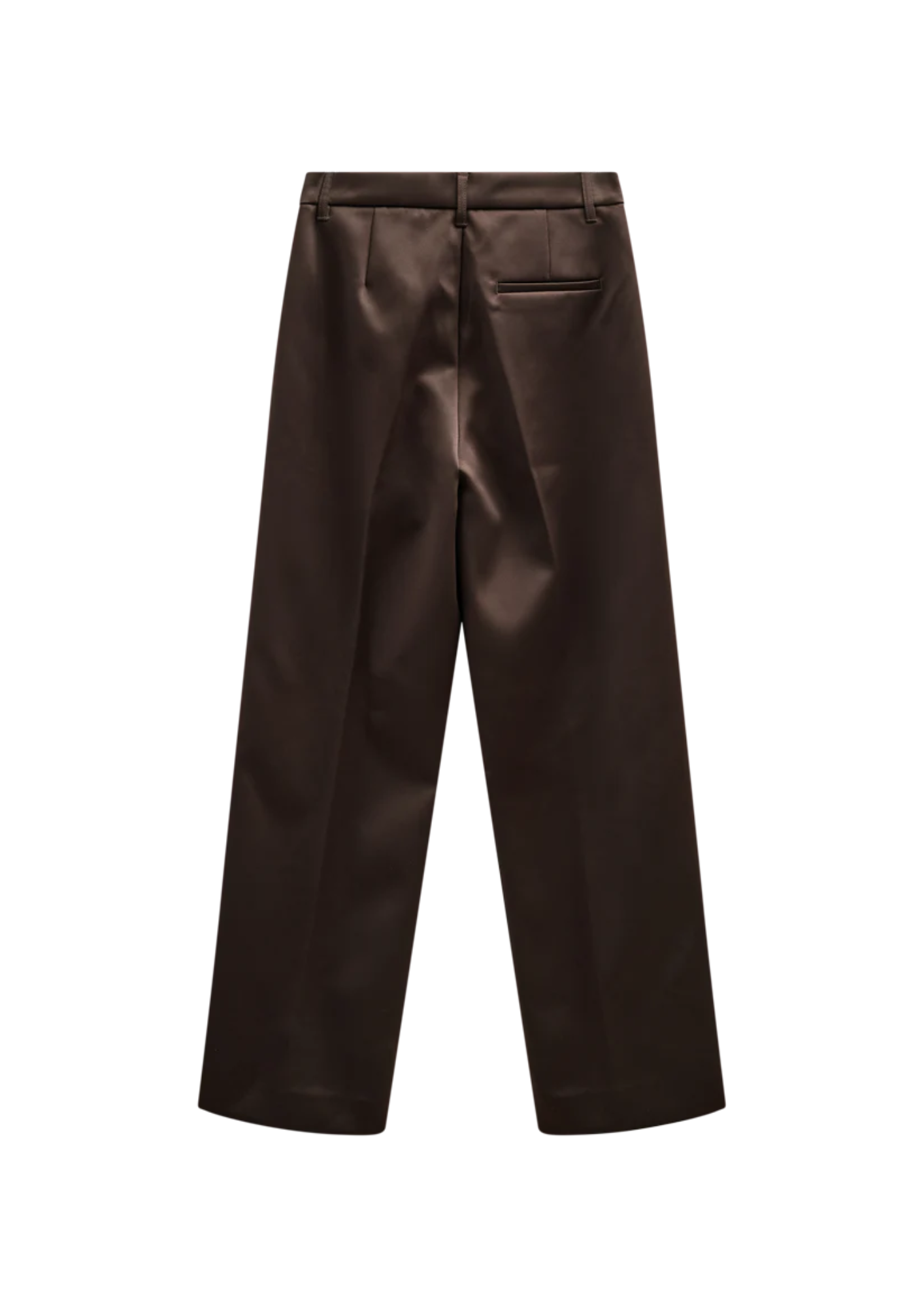 CMSHINE-PANTS is een klassieke, hoog getailleerde broek van luxe, zware satijnen stof met een normale pasvorm, rechte, wijde pijpen met plooien, steekzakken en een verborgen haak-en-oog- en ritssluiting.