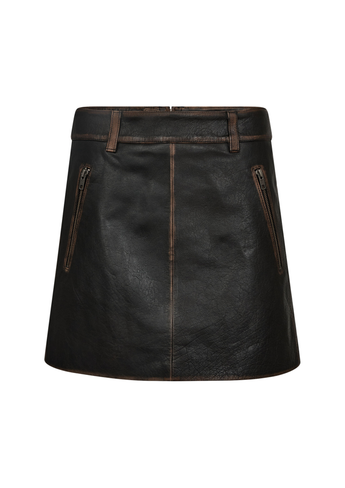Leren rok van Haute L'Amitié, gemaakt van 100% leer in een bruine mocca-kleur. De rok heeft een used look met een zichtbare textuur in het materiaal.