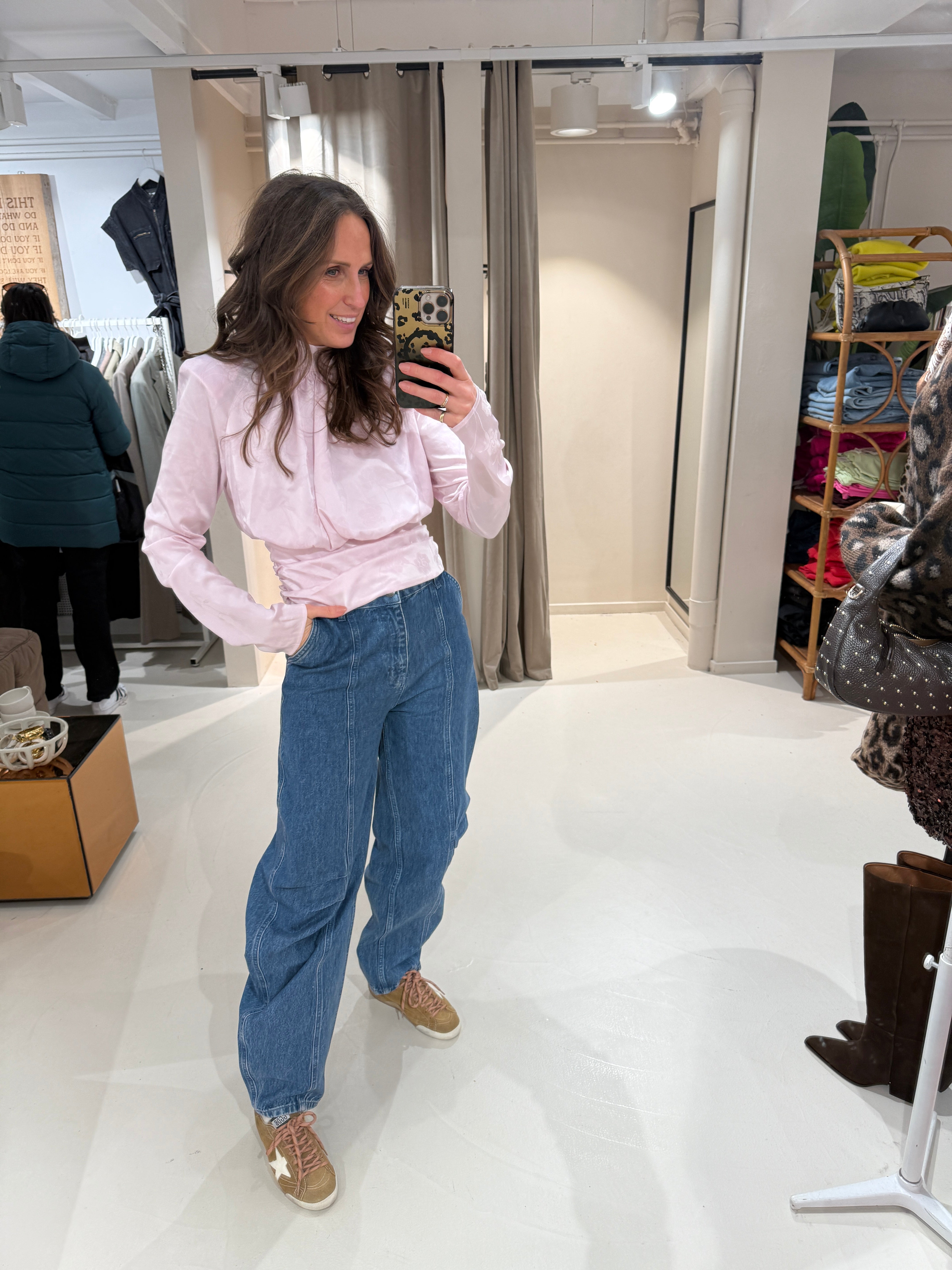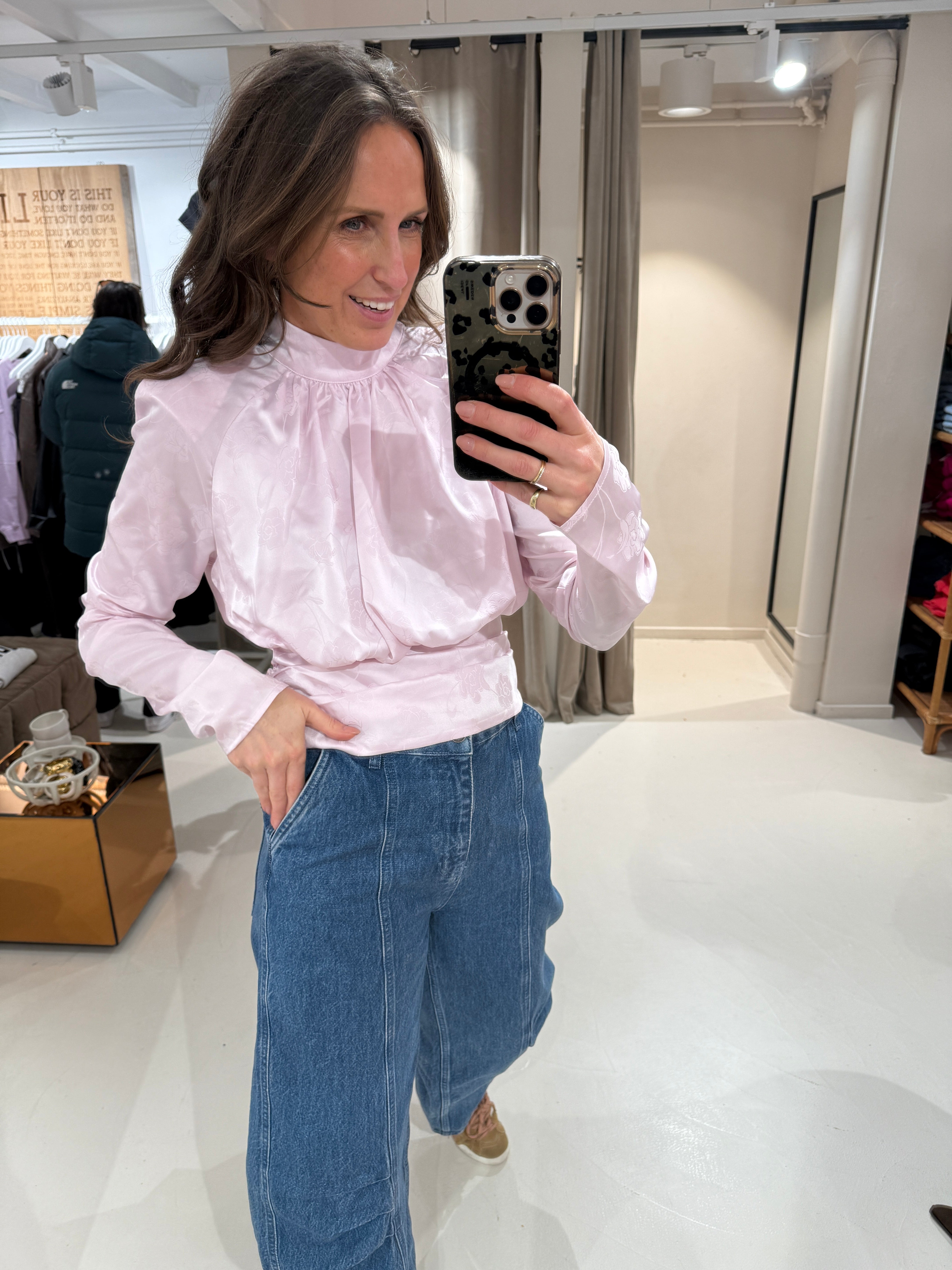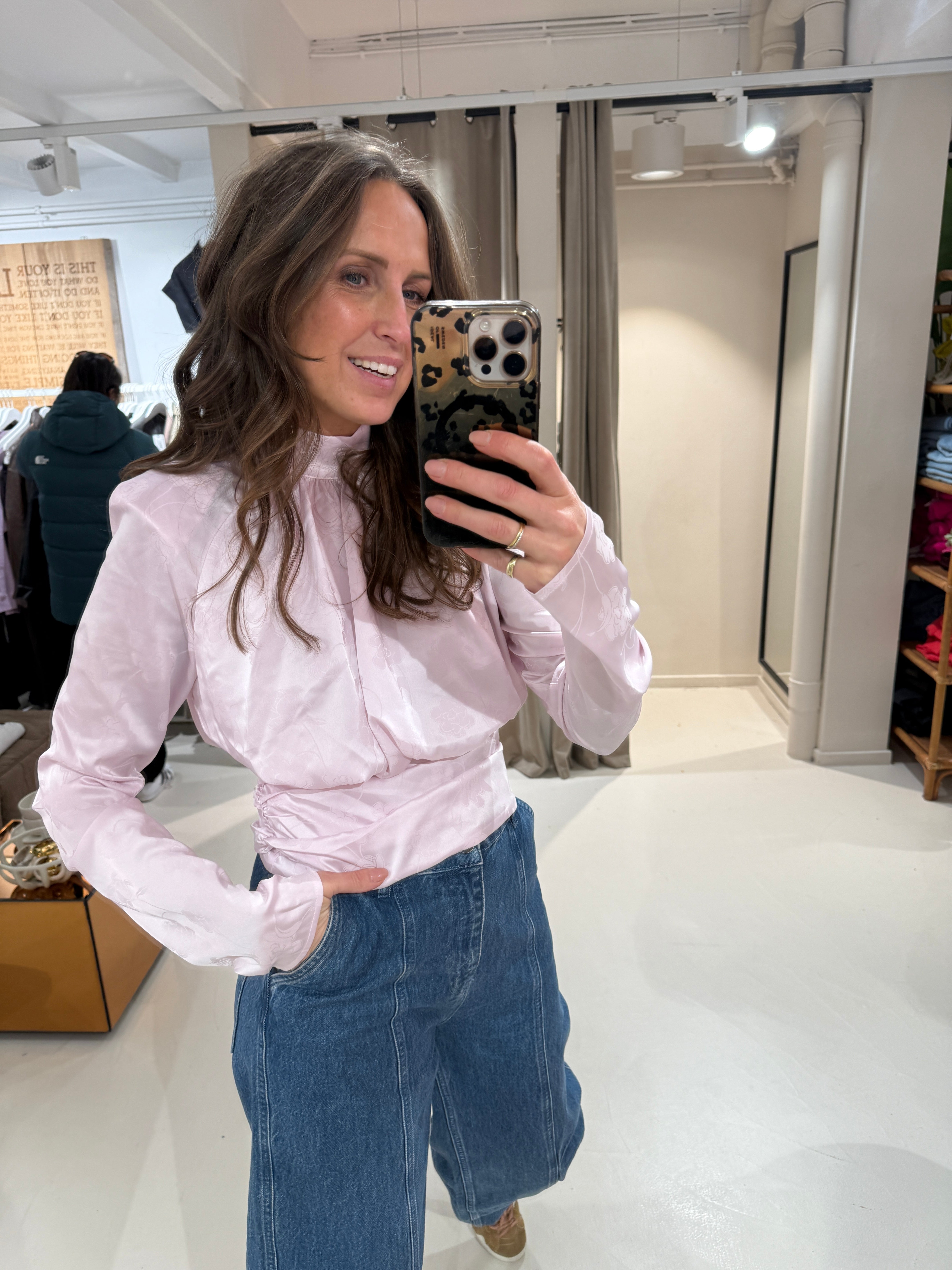 Deze light pink top met lange mouwen en plooien heeft een hoge hals, lange mouwen en een gedrapeerde plooiing aan de voor- en achterkant. De zoom is aan de zijkanten geplooid, waardoor er volume in de taille ontstaat. De top is gevoerd.