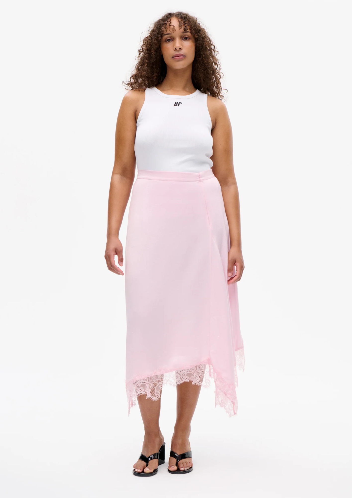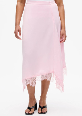 De Sophie-rok is een midi-rok met hoge taille en een elastische tailleband aan de achterkant. De rok heeft een asymmetrische zoom, afgewerkt met fijn kant.