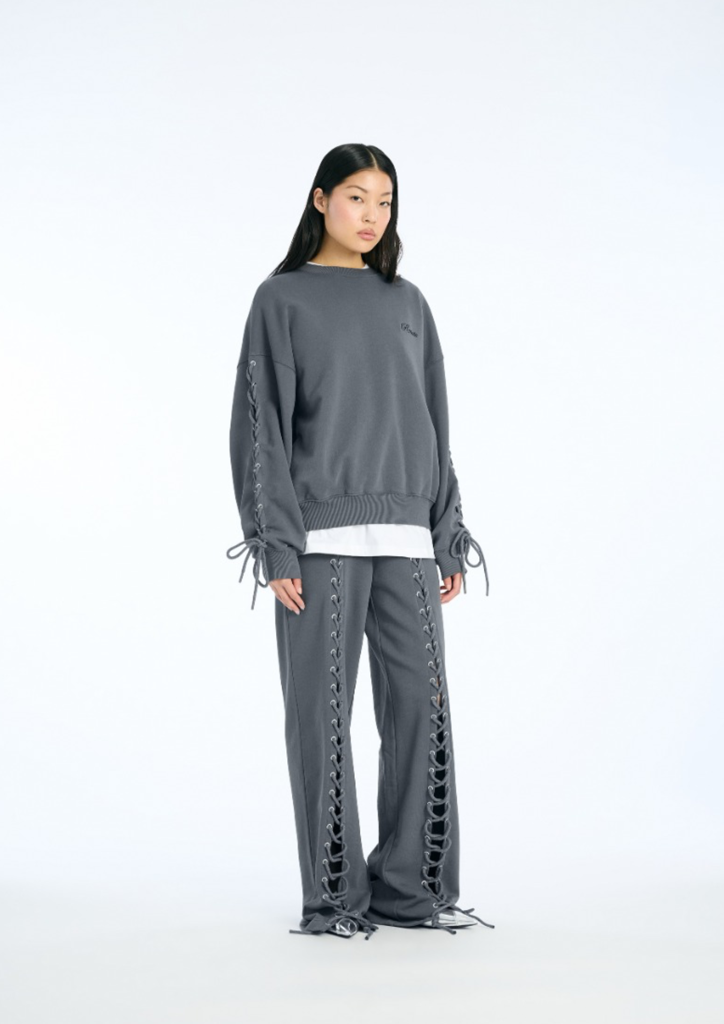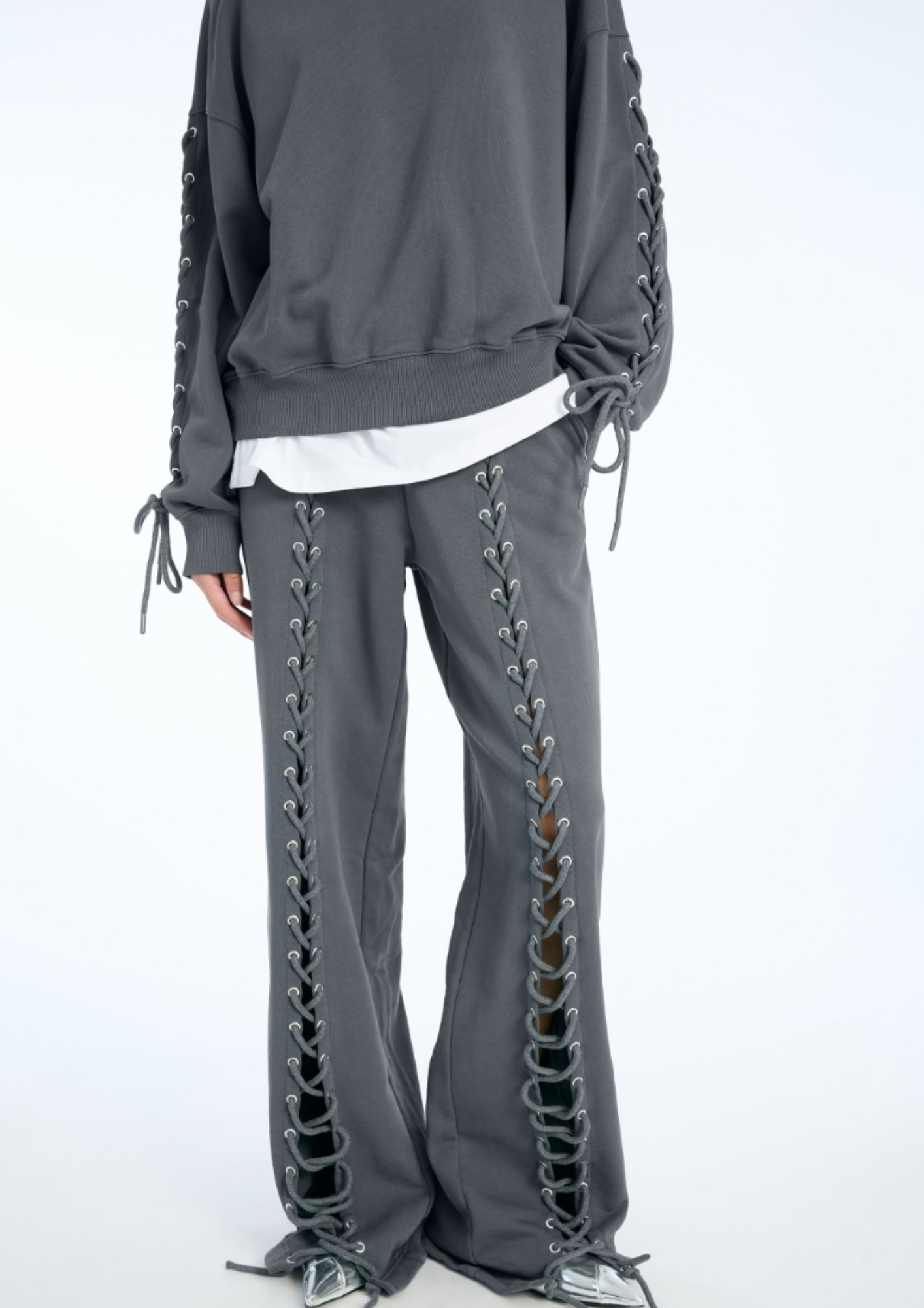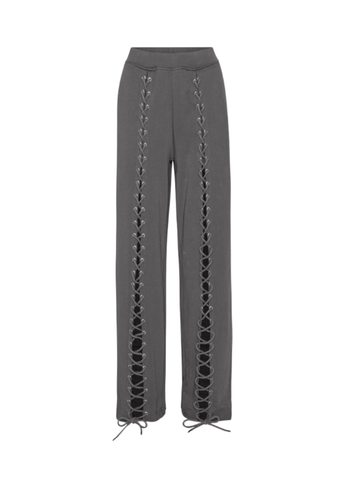 Deze donkergrijze joggingbroek met vetersluiting is gemaakt van biologisch katoen en heeft een relaxte, wijde pasvorm. De broek is voorzien van opvallende vetersluiting aan de voorkant van elke pijp, afgewerkt met metalen ringen en strikkoorden aan de zoom. De elastische tailleband zorgt voor extra comfort.