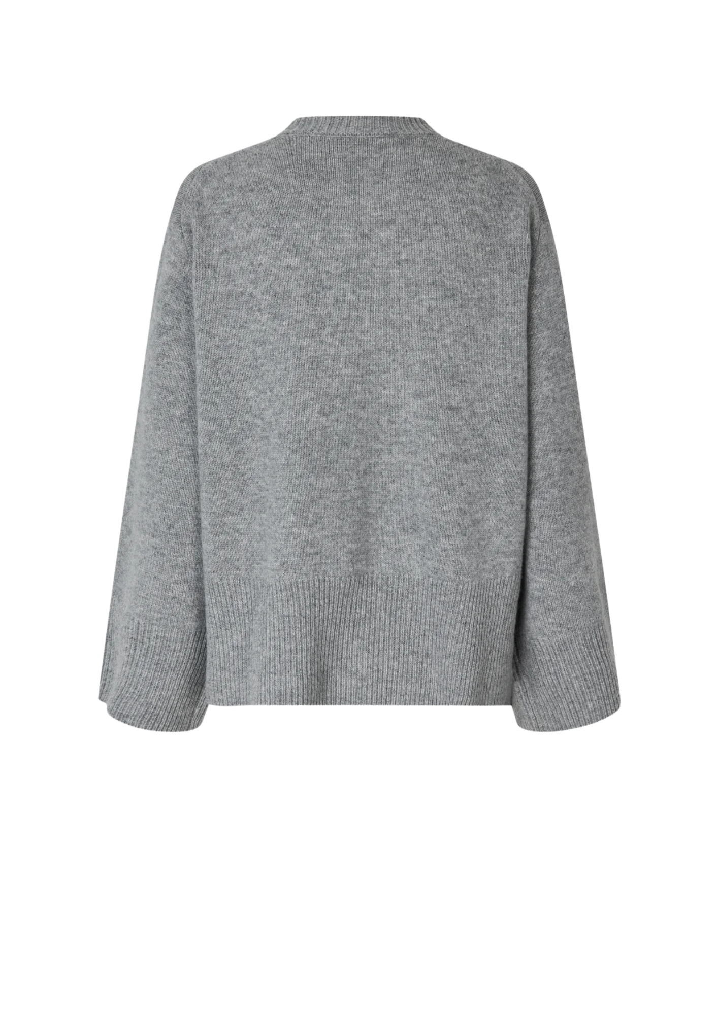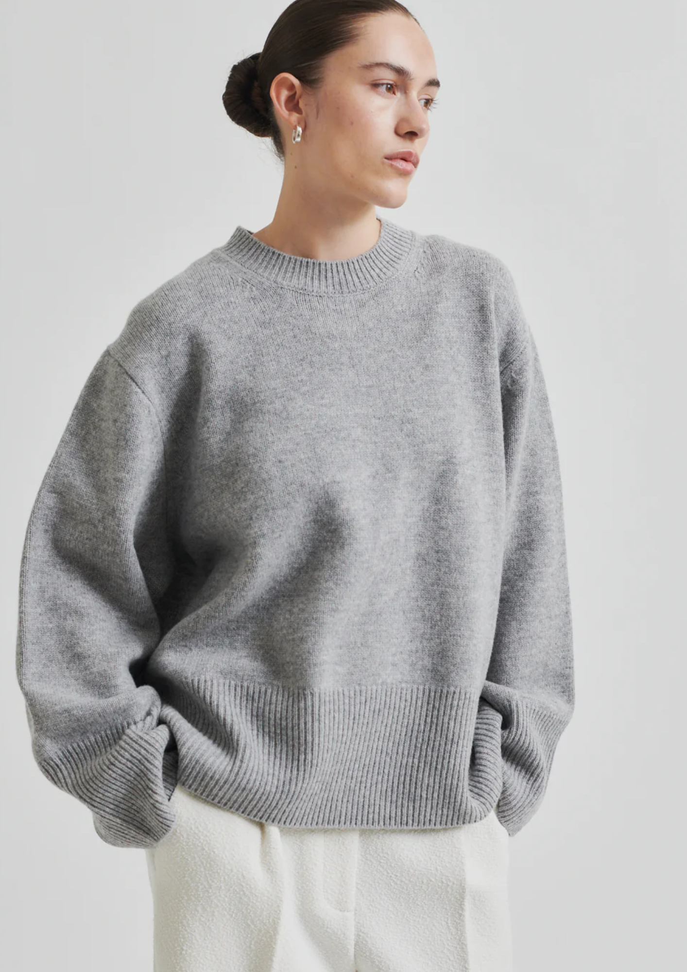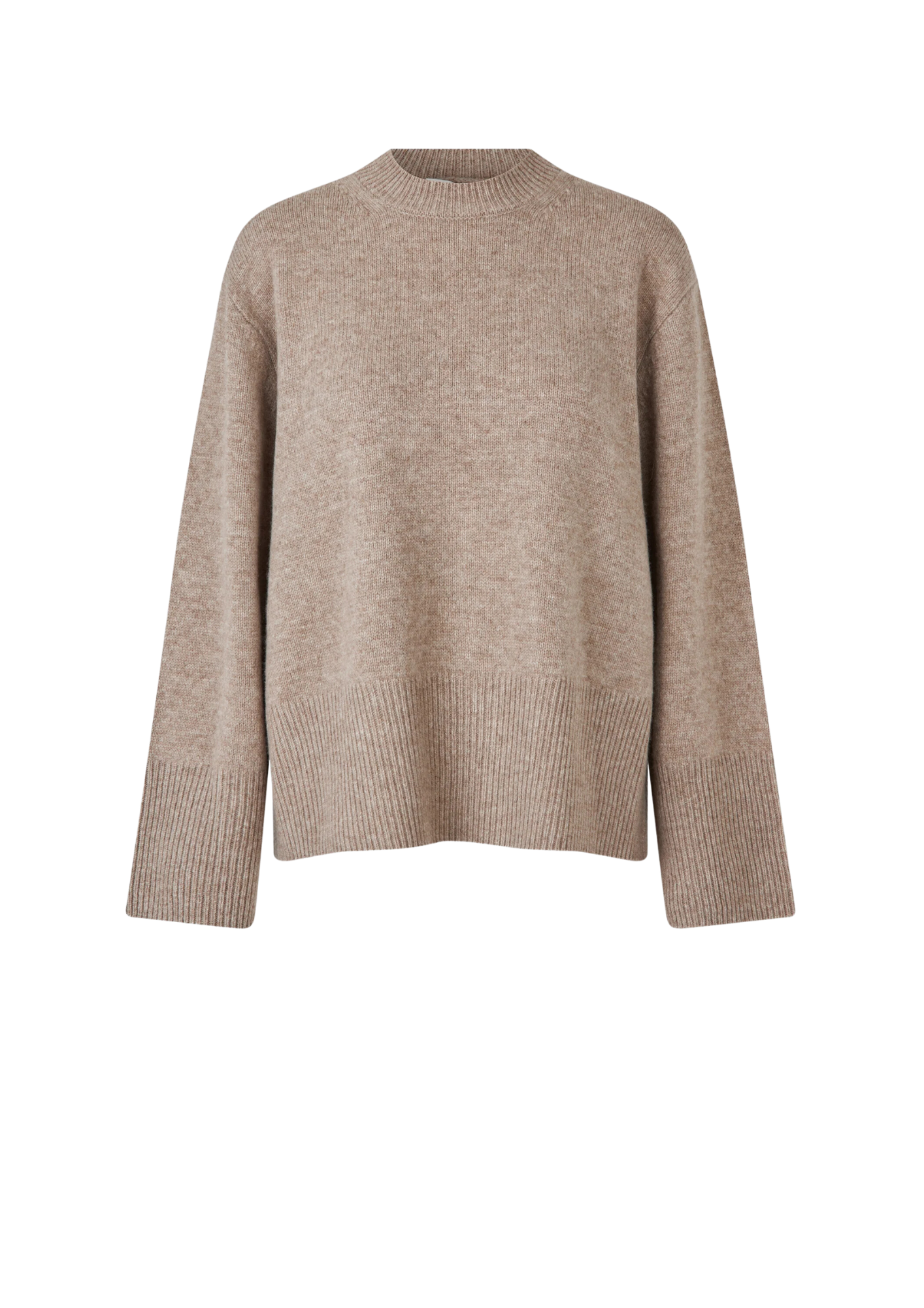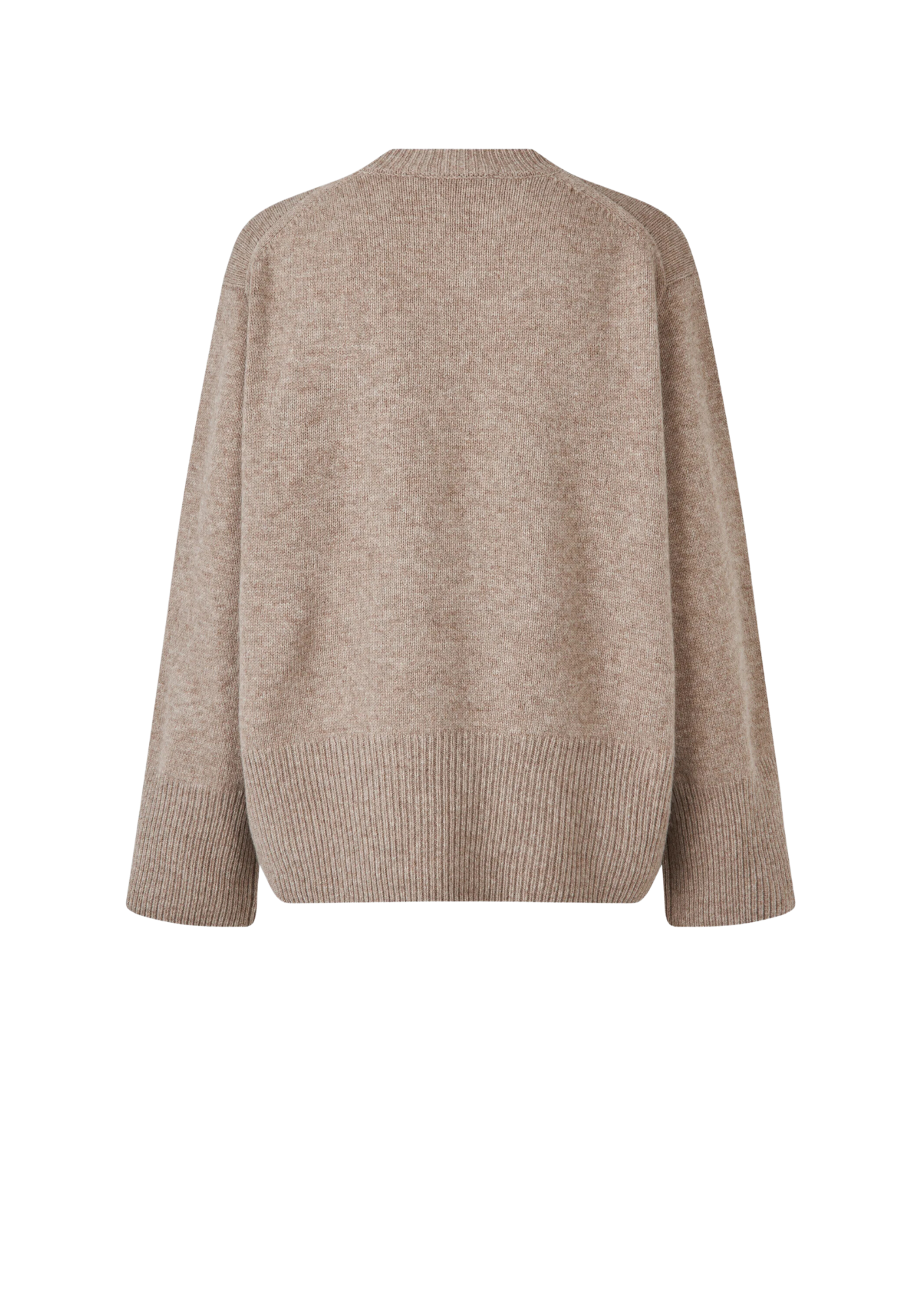 De pullover is gemaakt van zacht wol. Met een ronde hals en licht verlaagde schouders met extra brede, lange mouwen. Geribbelde hals, met extra brede rib bij de manchetten en onderzoom. Wijde, relaxte pasvorm.