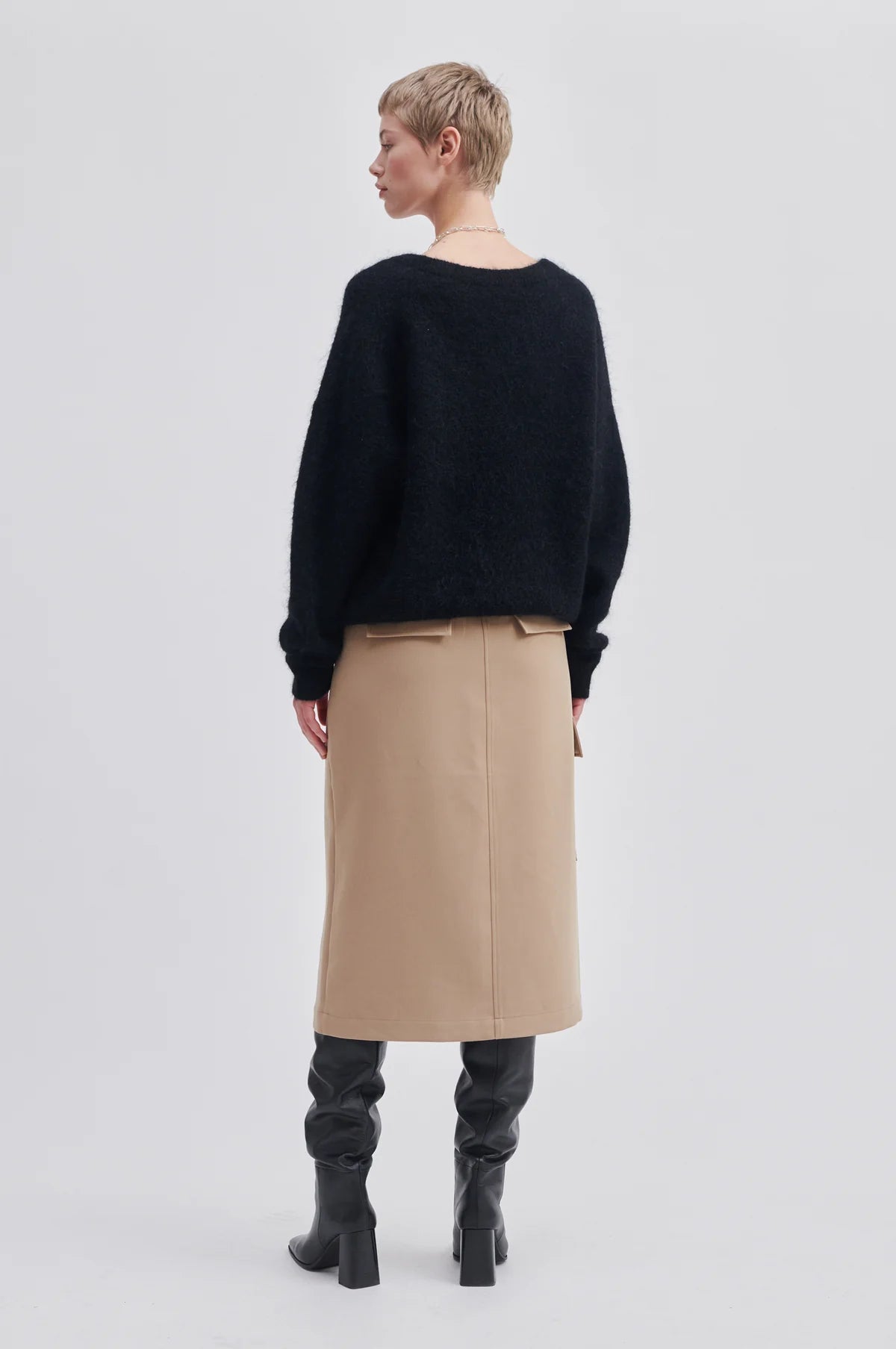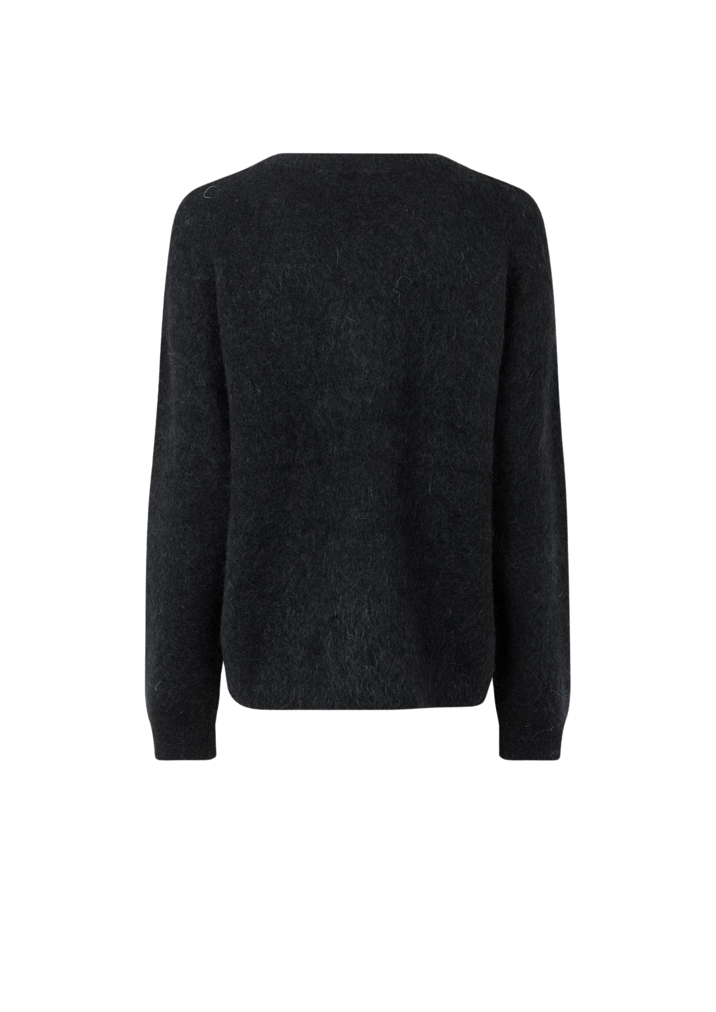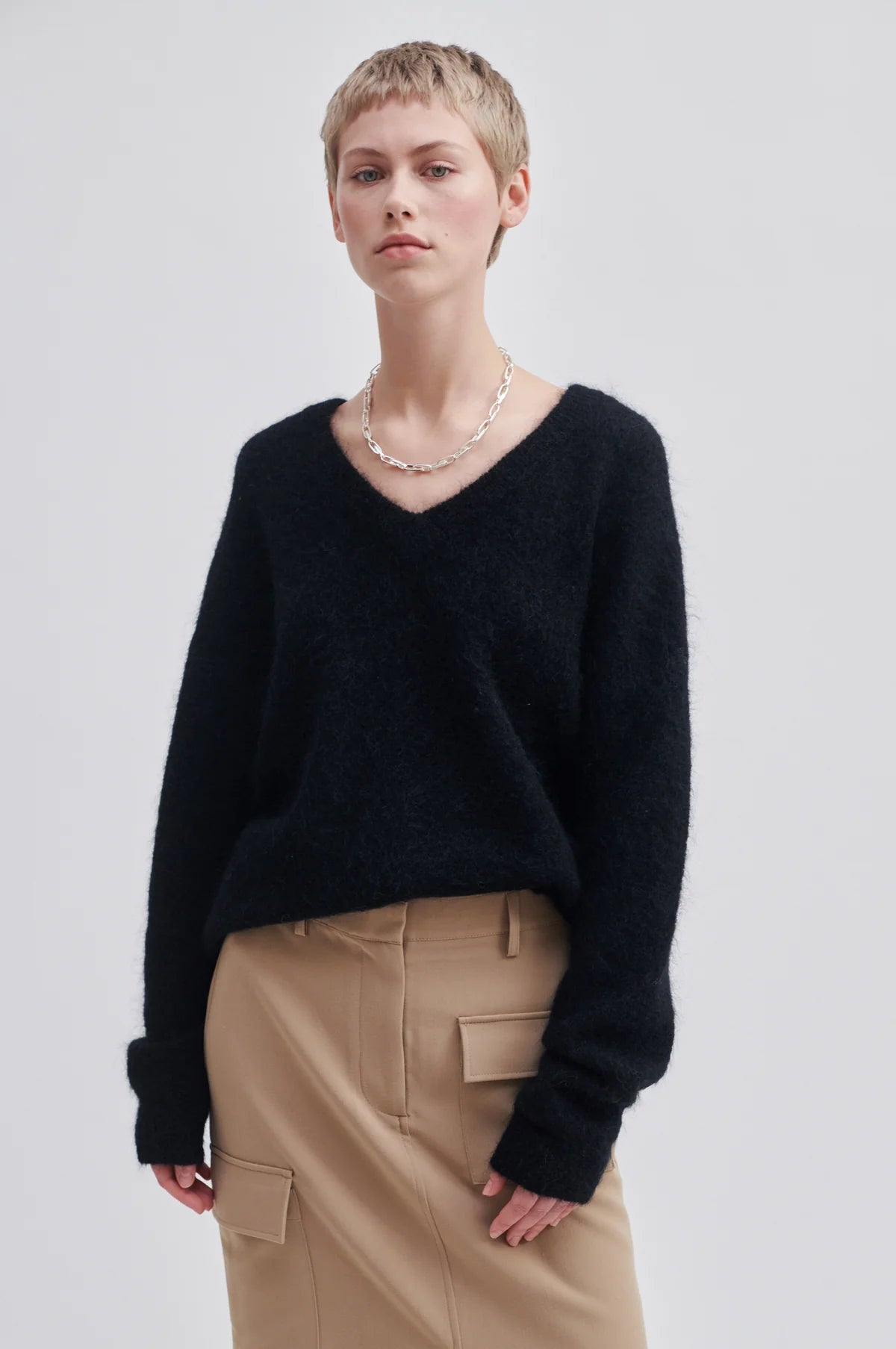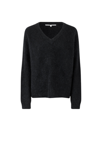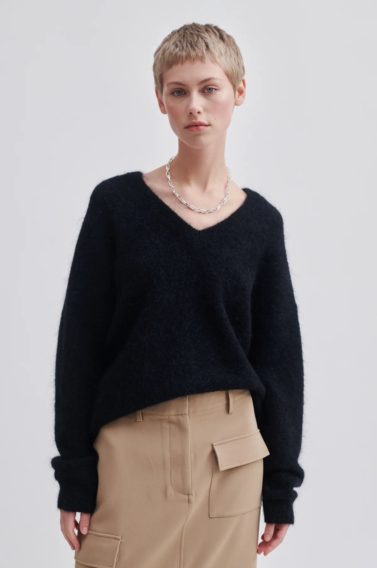Second Female oversize V-neck sweater. Made in a soft and stretchy mohair-wool blend with slightly fluffy texture. Featuring a V-neckline and dropped shoulders with long sleeves. Rib trim at neck, cuffs and bottom hem. Wide, loose and slouchy fit that creates a relaxed and casual expression.