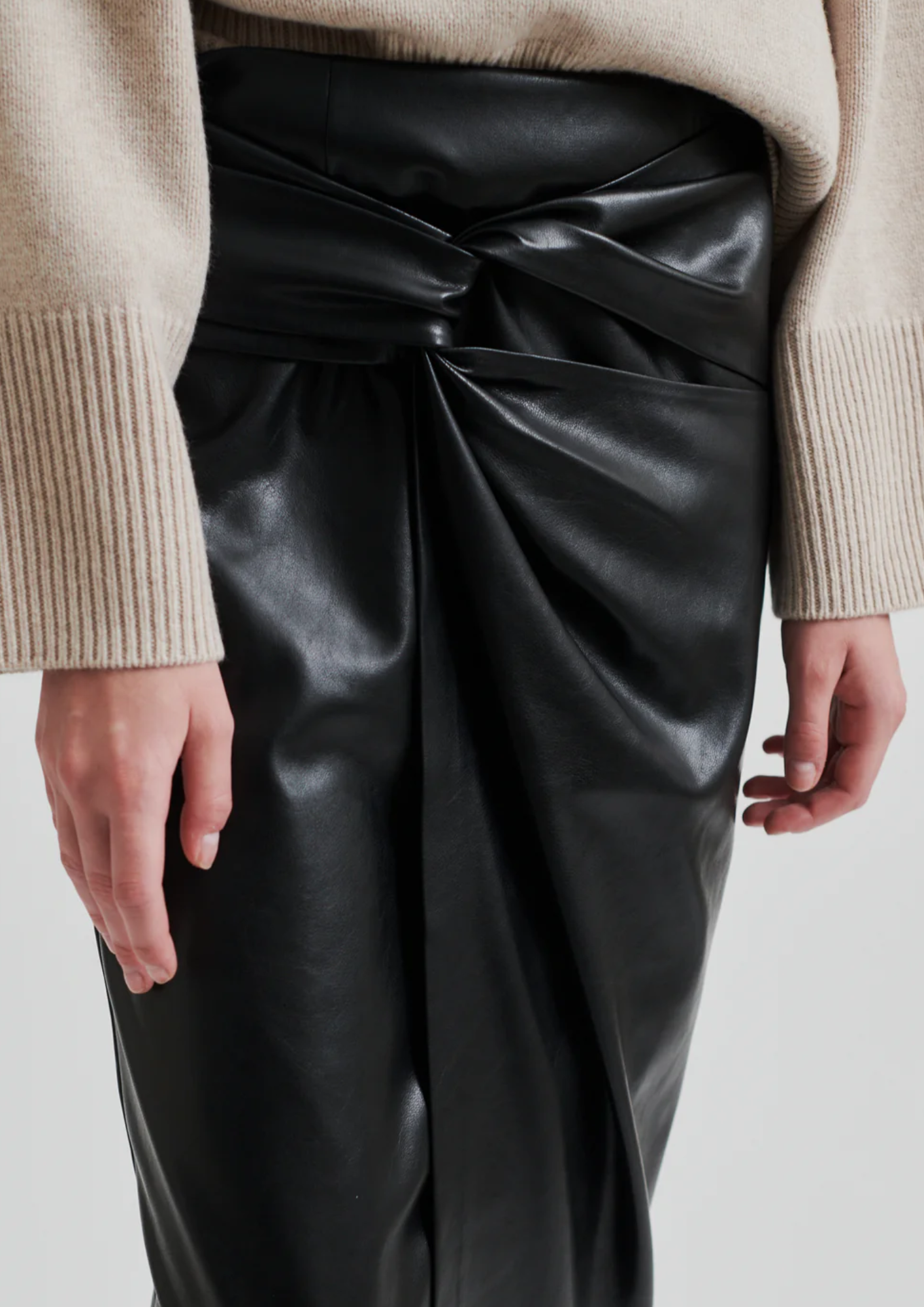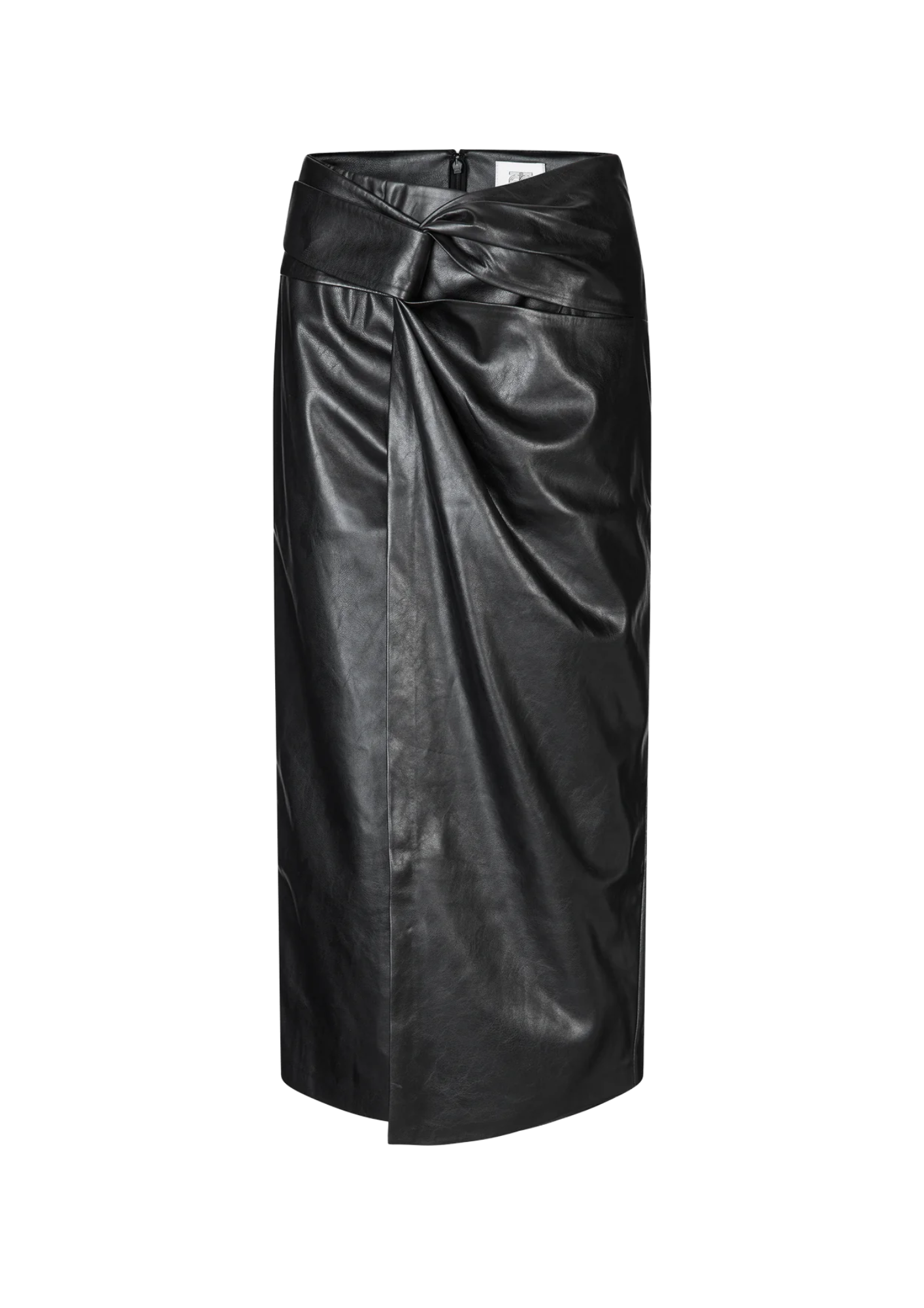 De rok is gemaakt van imitatieleer met een gladde, glanzende kwaliteit. Met een verborgen ritssluiting aan de achterkant en een band die door een gat op de overlappende flap gaat om een ​​gedrapeerd effect te creëren. Normale pasvorm met een lang, recht silhouet.