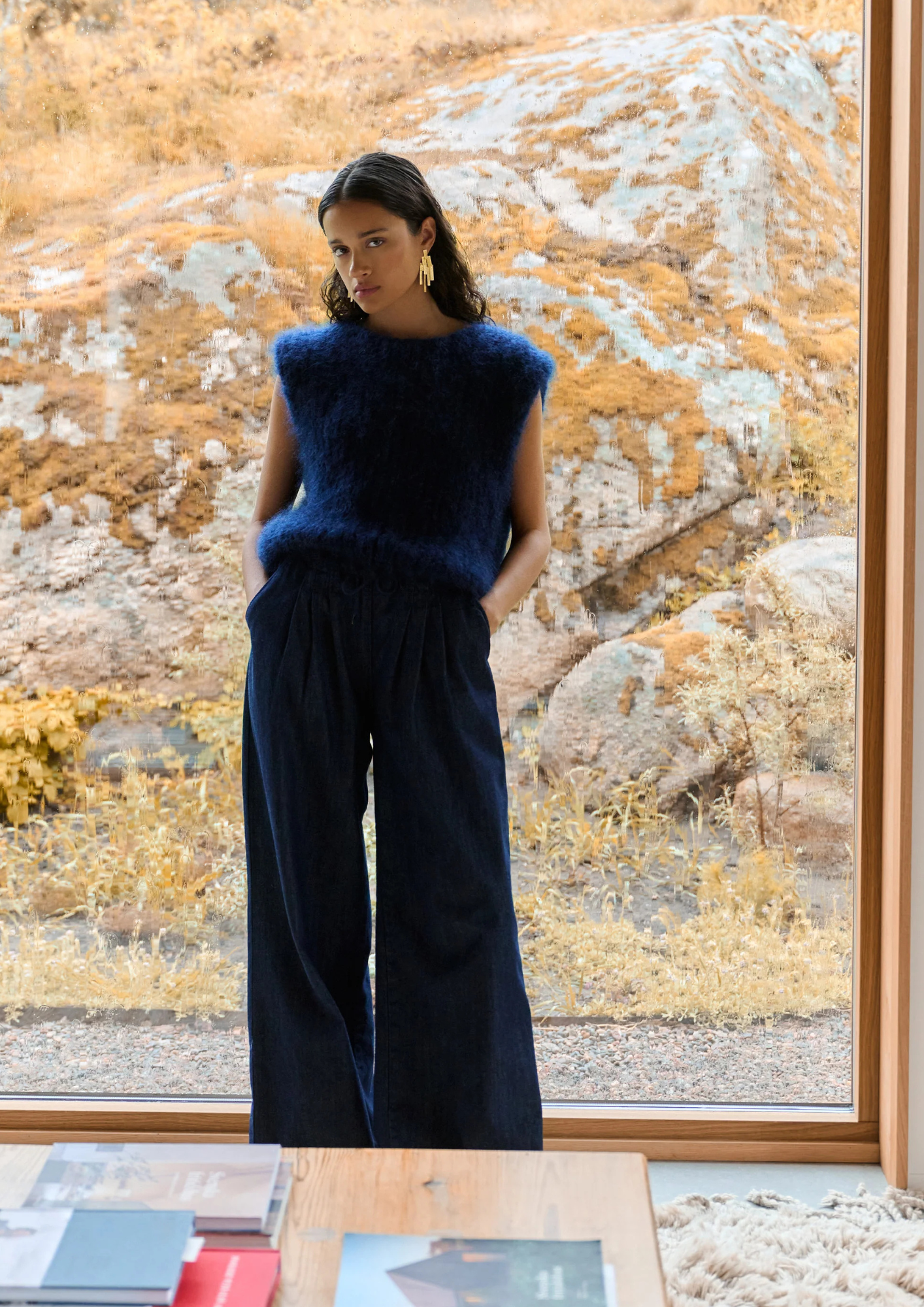De james spencer, een perfecte mix van comfort en elegantie. Met een elastieken band aan de onderkant en een mix van mohair biedt deze mouwloze top een zachte, luxe feel. De ronde hals en normale pasvorm zorgen voor de perfecte look voor elke dag!