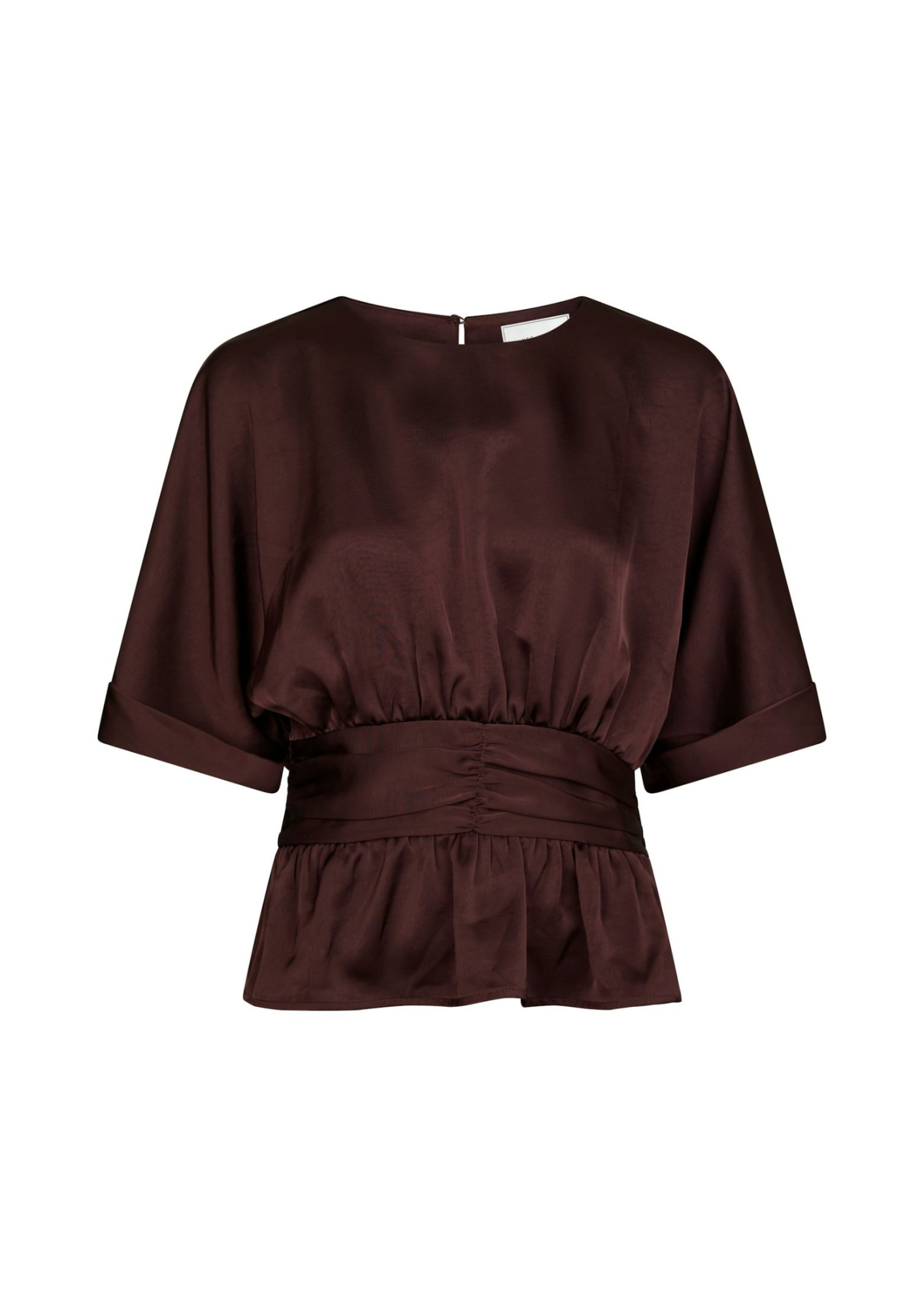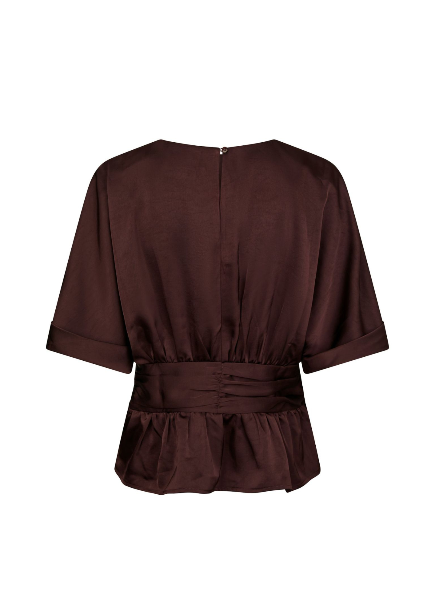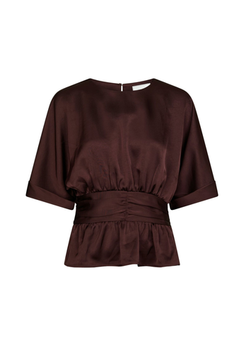 Schattig bloesje in een mooie zware satijnen kwaliteit. Het bloesje heeft wijde korte mouwen en is getailleerd in de taille.