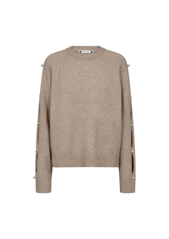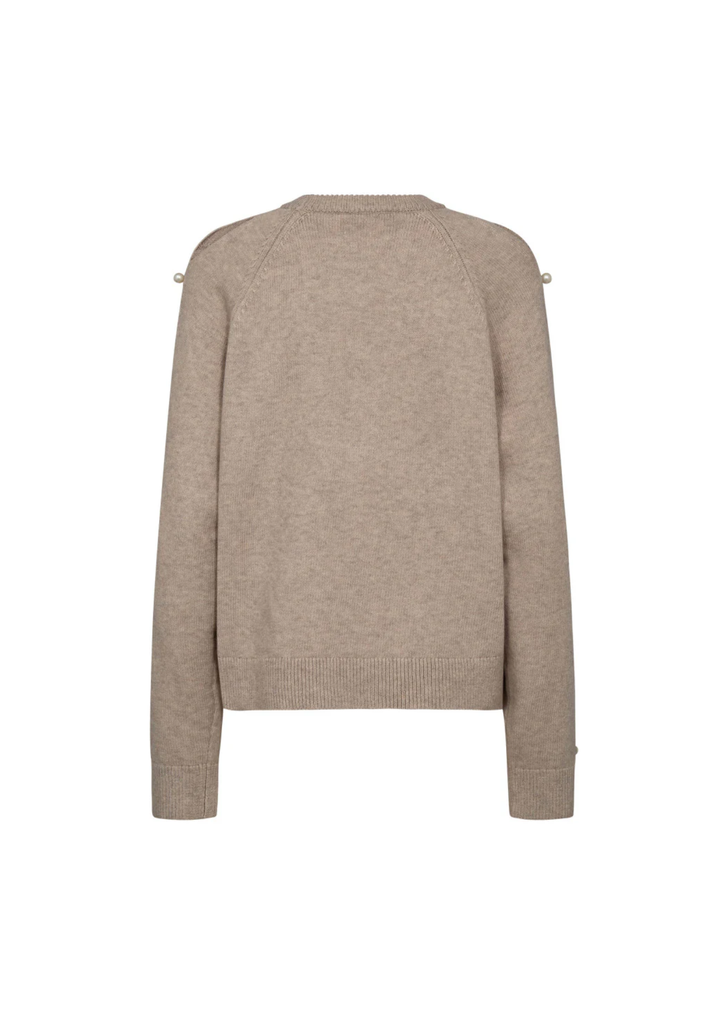 Deze Beige kleurige trui van Co’Couture krijgt een chique upgrade door de pareldetails langs de schouders.