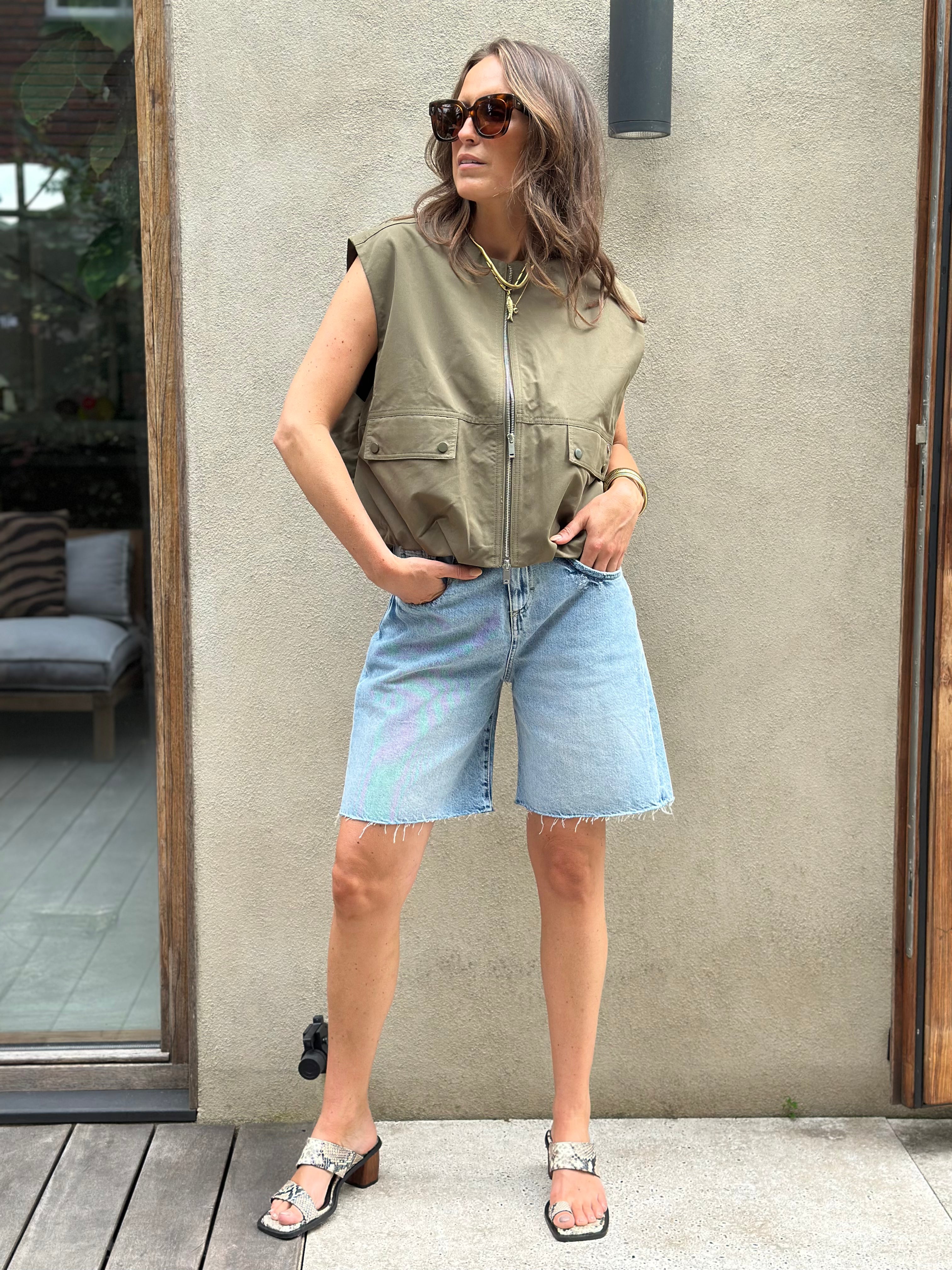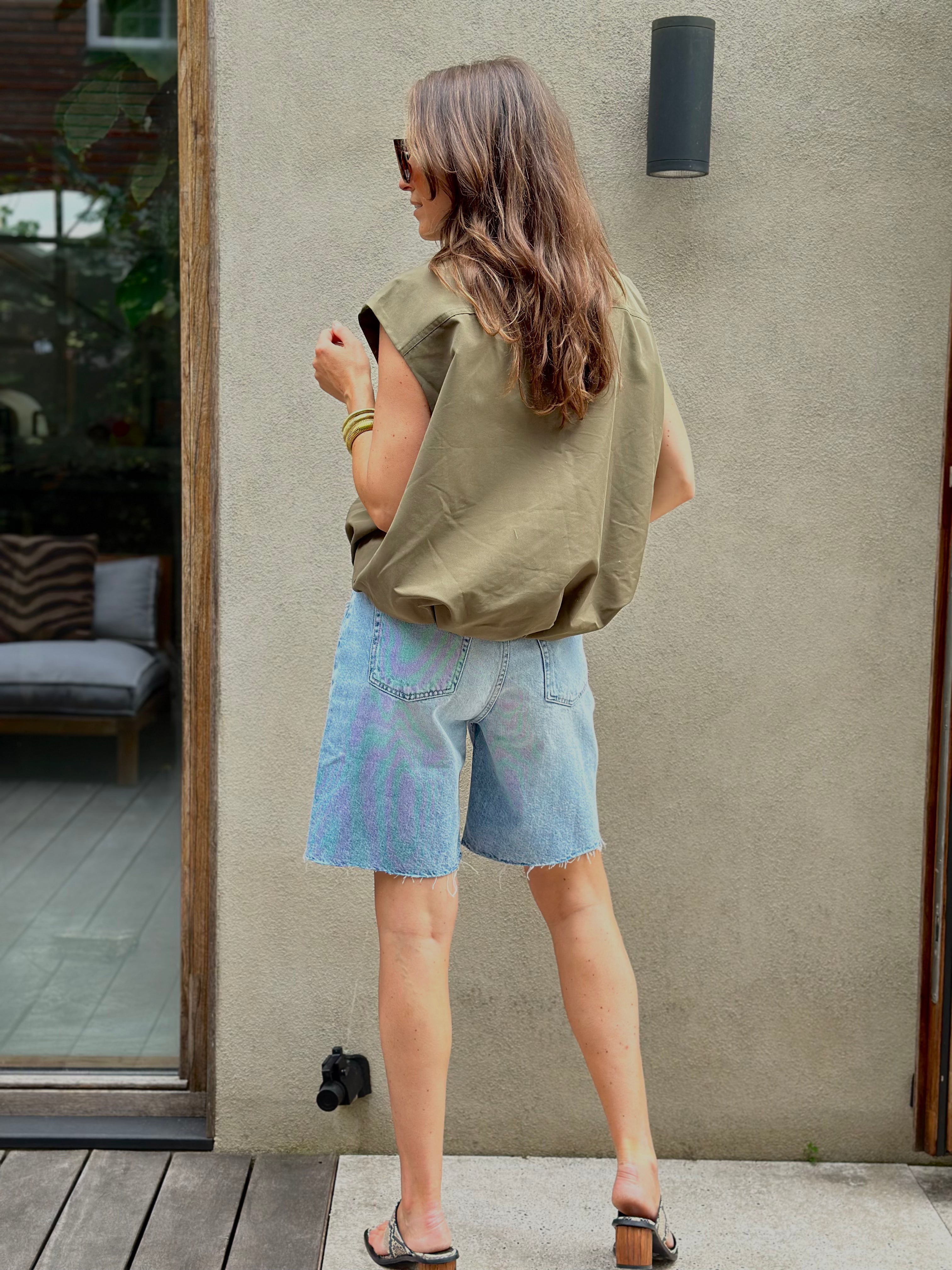 Dit toffe groene Gillet valt iets wat oversized. Marlies draagt s/m