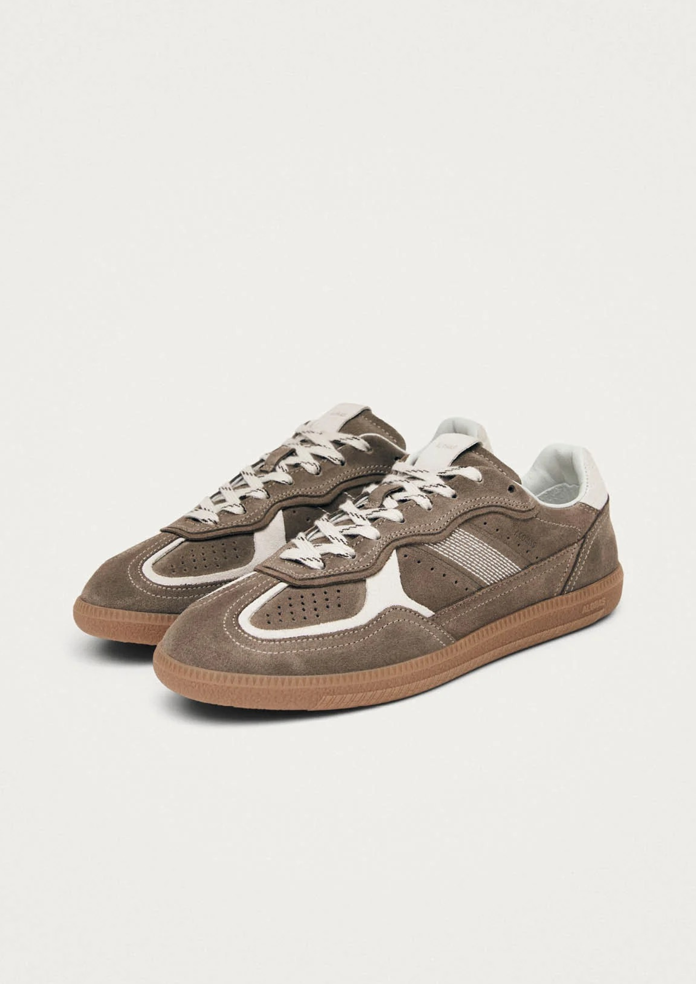 Taupekleurige suède sneakers met crèmekleurige accenten