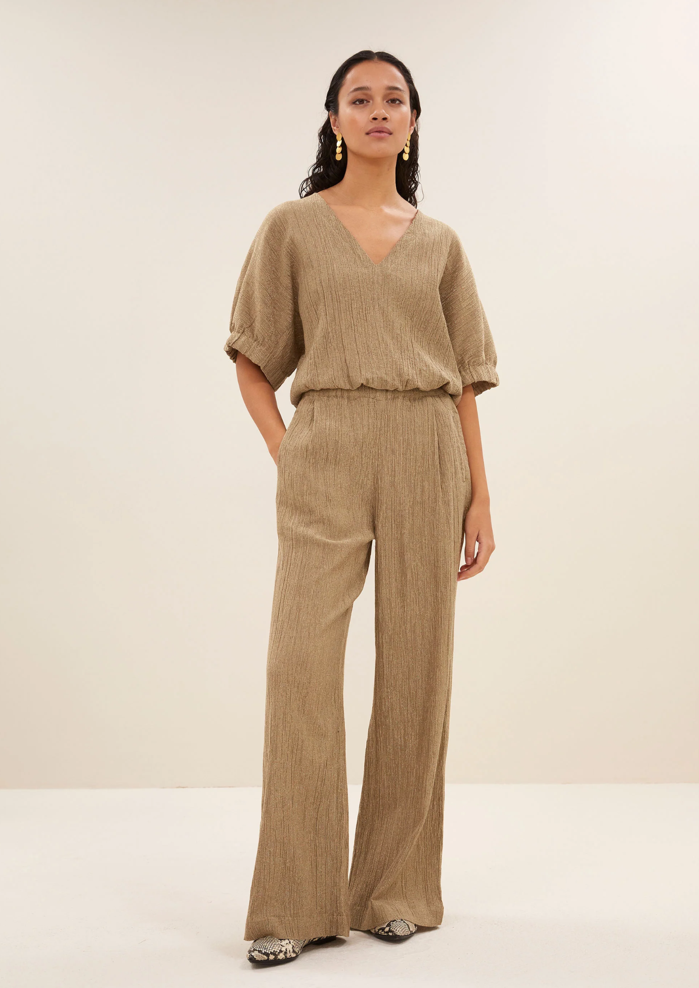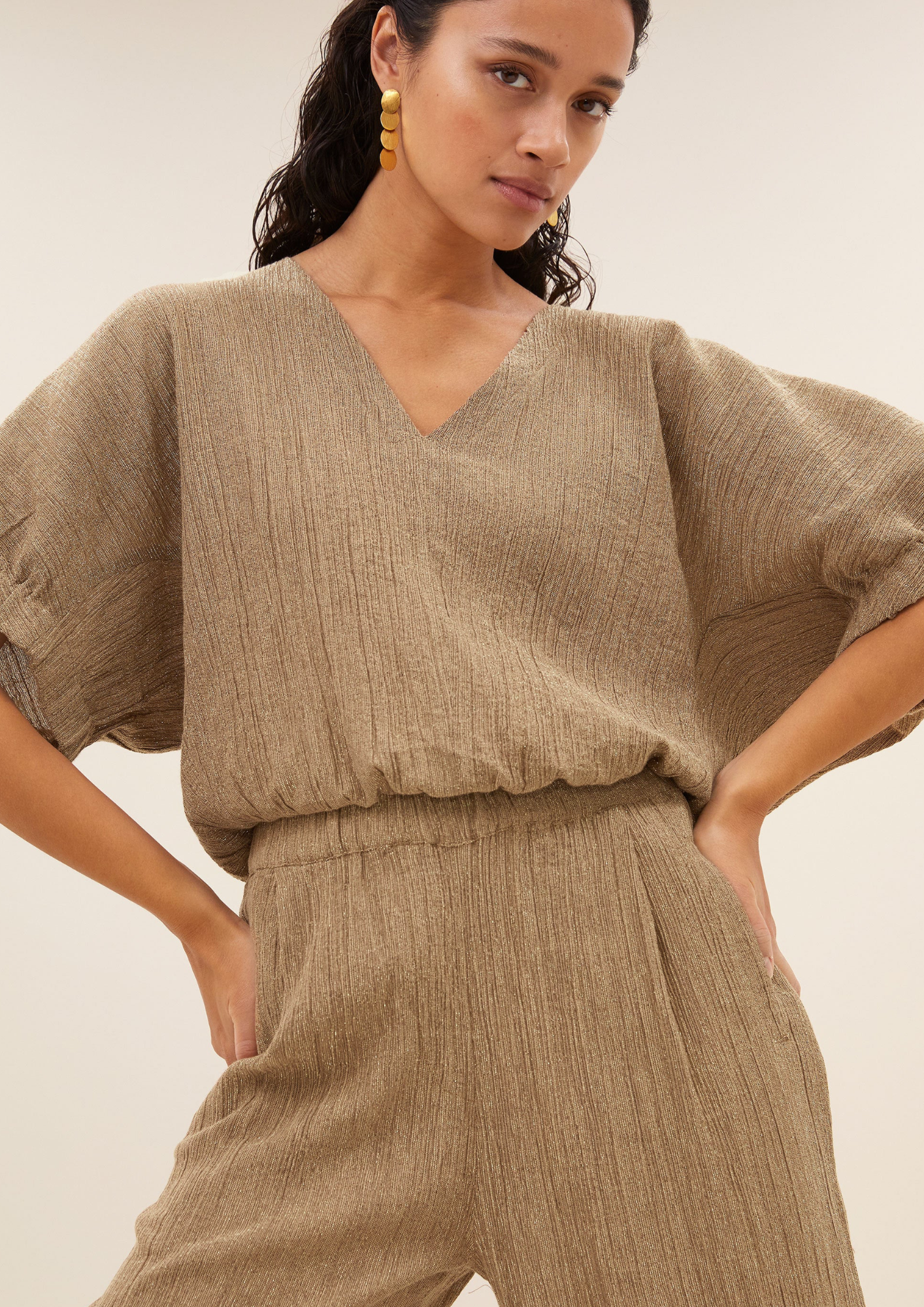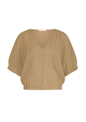 De mabel lurex blouse, een stijlvolle aanvulling op je casual chic garderobe. Dankzij de elastieken band biedt deze blouse comfort, terwijl de subtiel geweven lurex draad een subtiele glans toevoegt. De v-halslijn maakt deze blouse perfect voor elke gelegenheid. Voel je zelfverzekerd en elegant, waar je ook gaat!