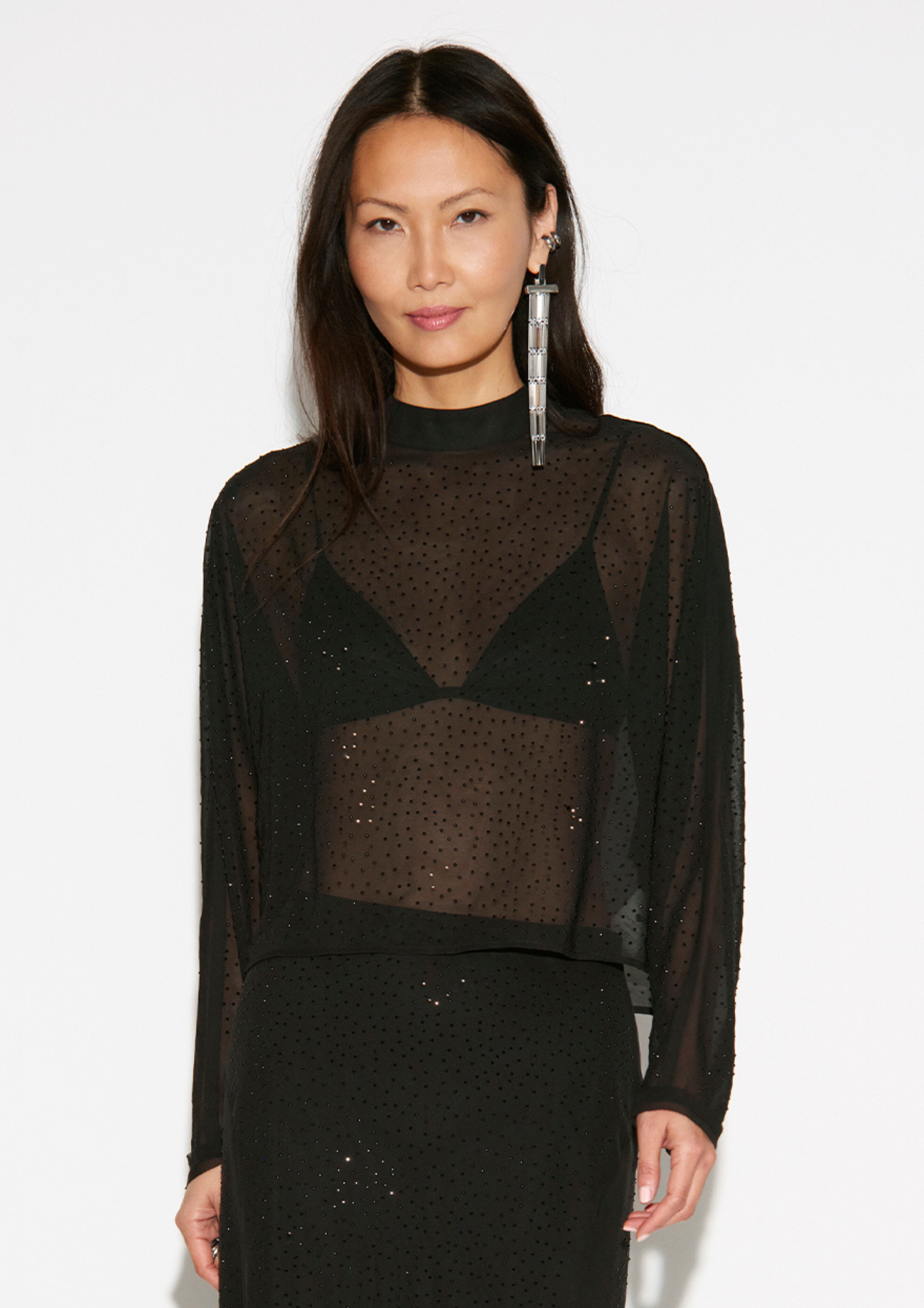 Voeg een vleugje glitter toe aan je garderobe met de Biacco top in het zwart. Deze transparante top is gemaakt van 100% gerecyclede chiffon en volledig versierd met strass-steentjes. De opstaande kraag en het relaxte silhouet maken het een opvallende top voor feestjes of casual te combineren met denim.