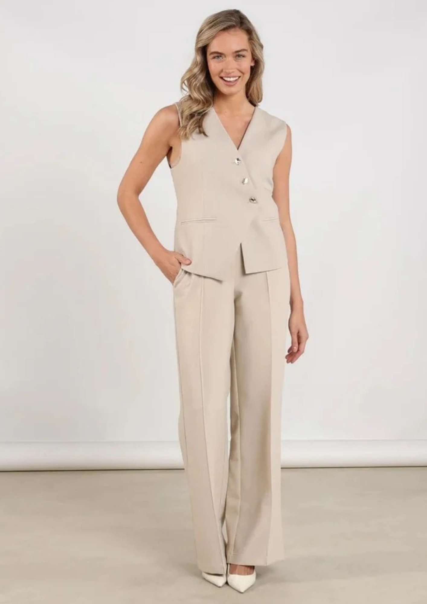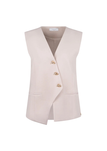 De Gilet Julia Sand van Nukus is een elegante gilet met V-hals. De getailleerde belijning en goudkleurige knopen geven een chique look. Perfect voor kantoor of een diner.