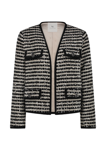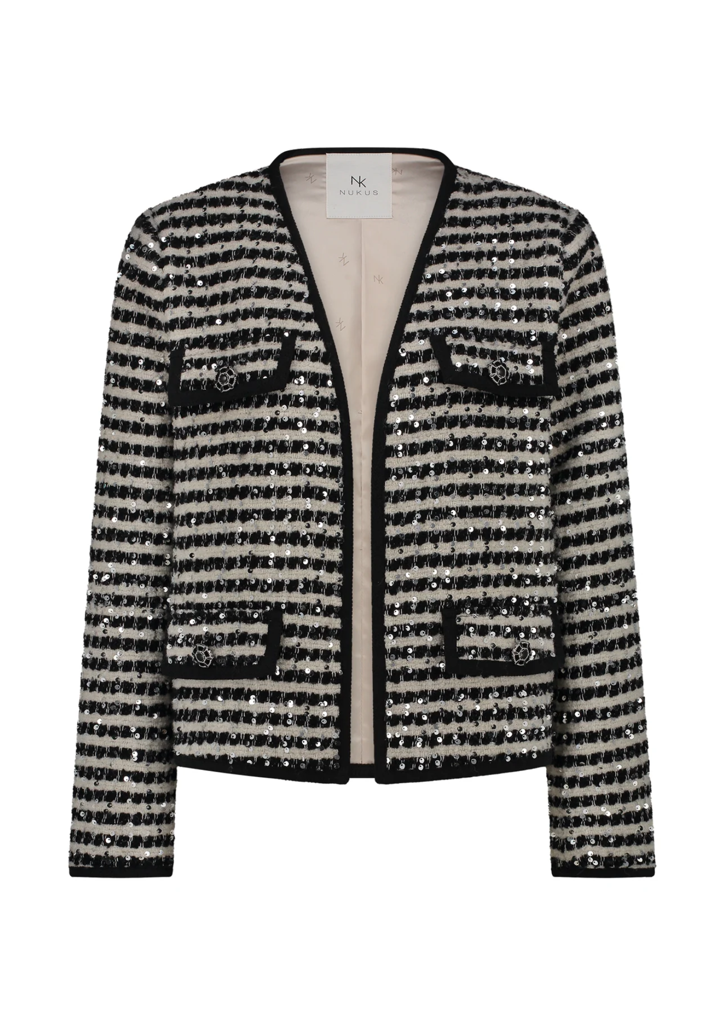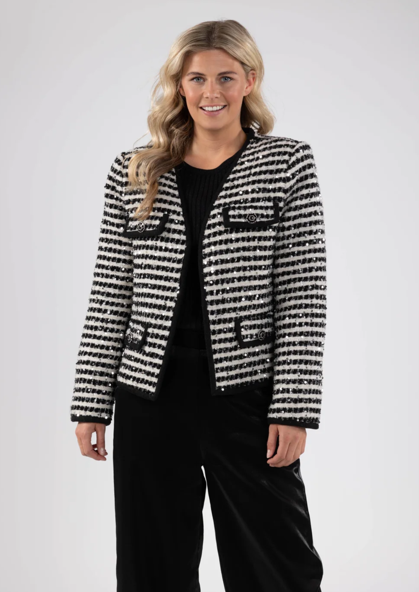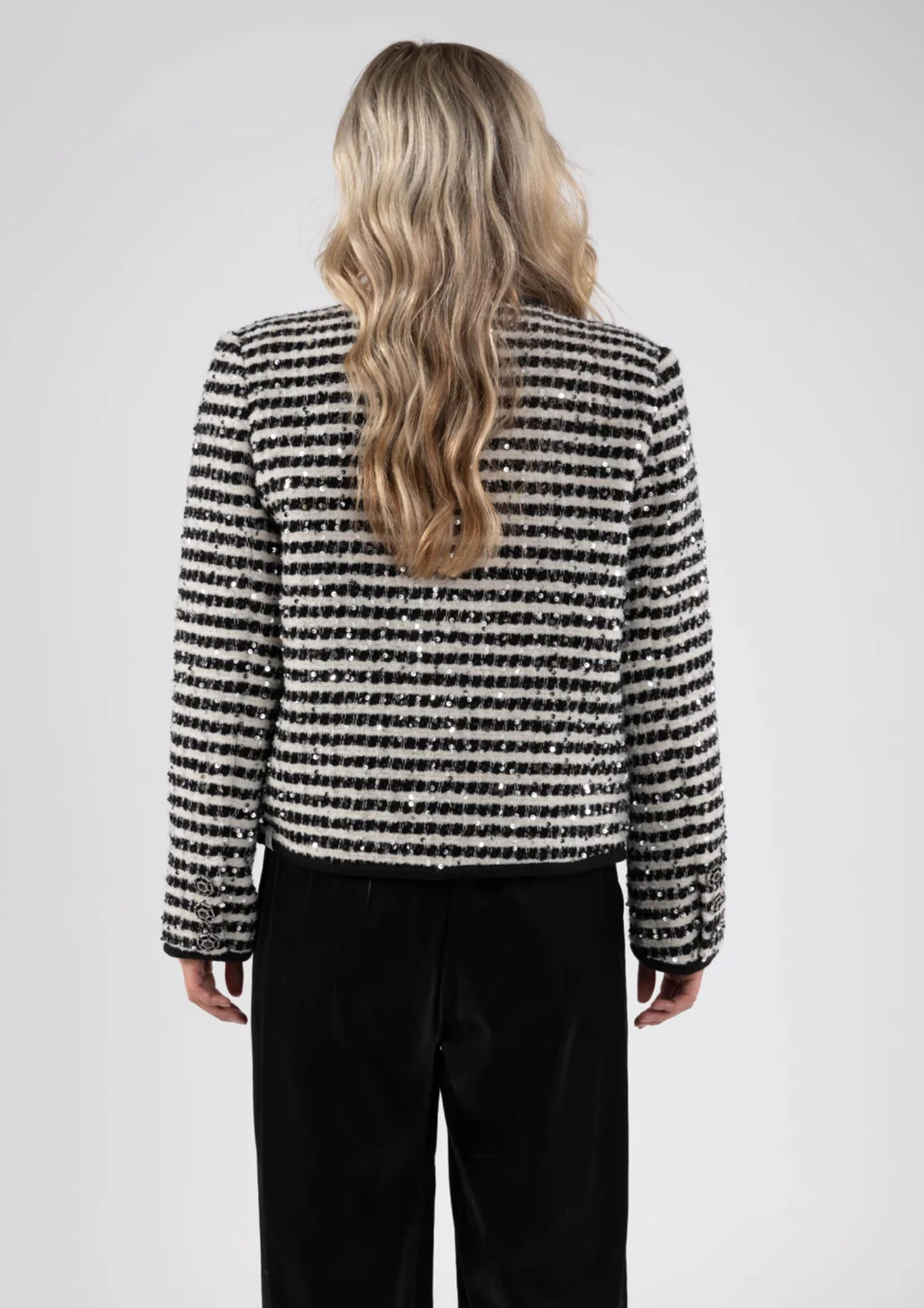 Het Leicester Jacket in zwart en off white is een stijlvolle en chique toevoeging aan je garderobe. Het jasje is voorzien van opvallende pailletten en zwart-witte strepen.