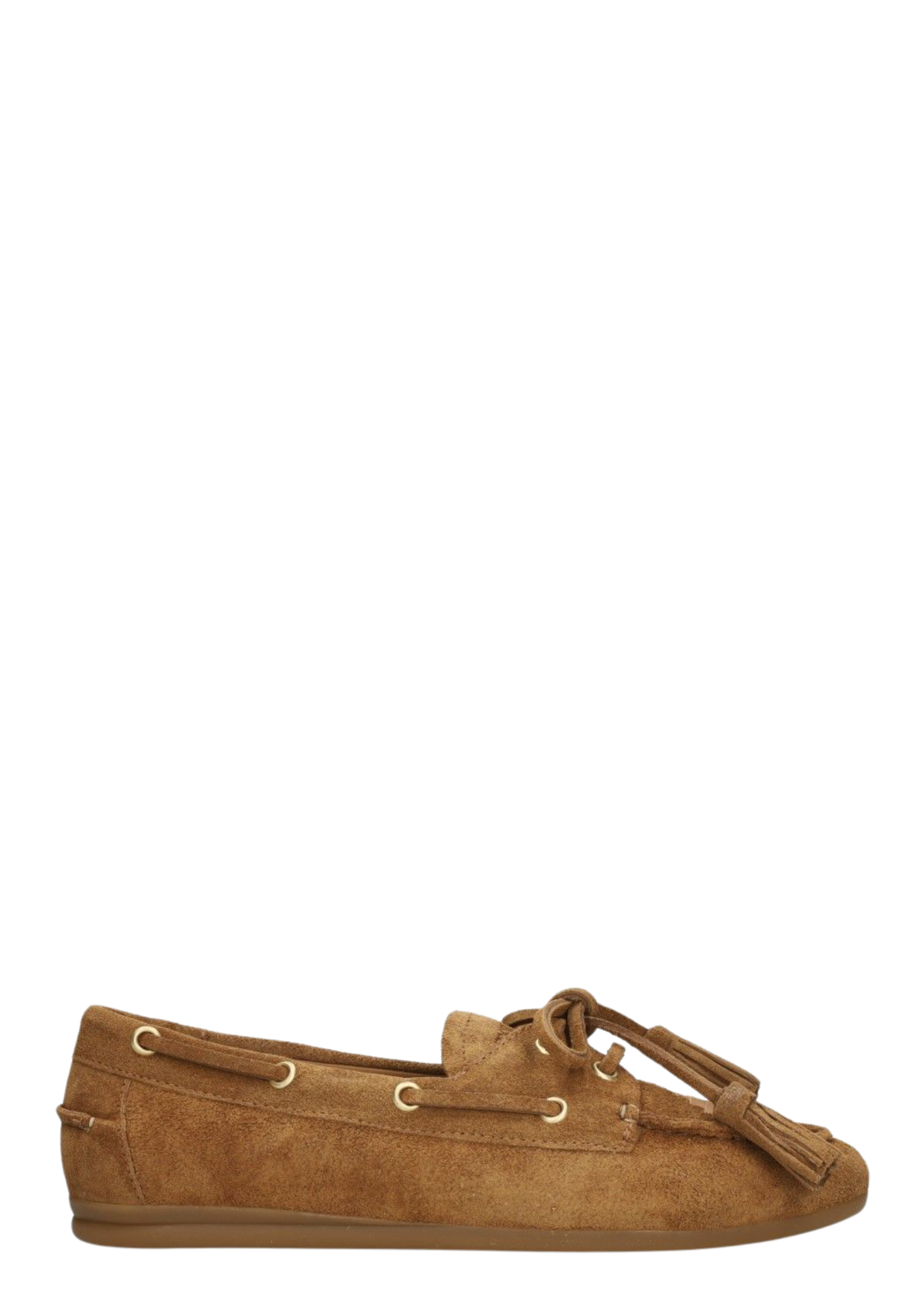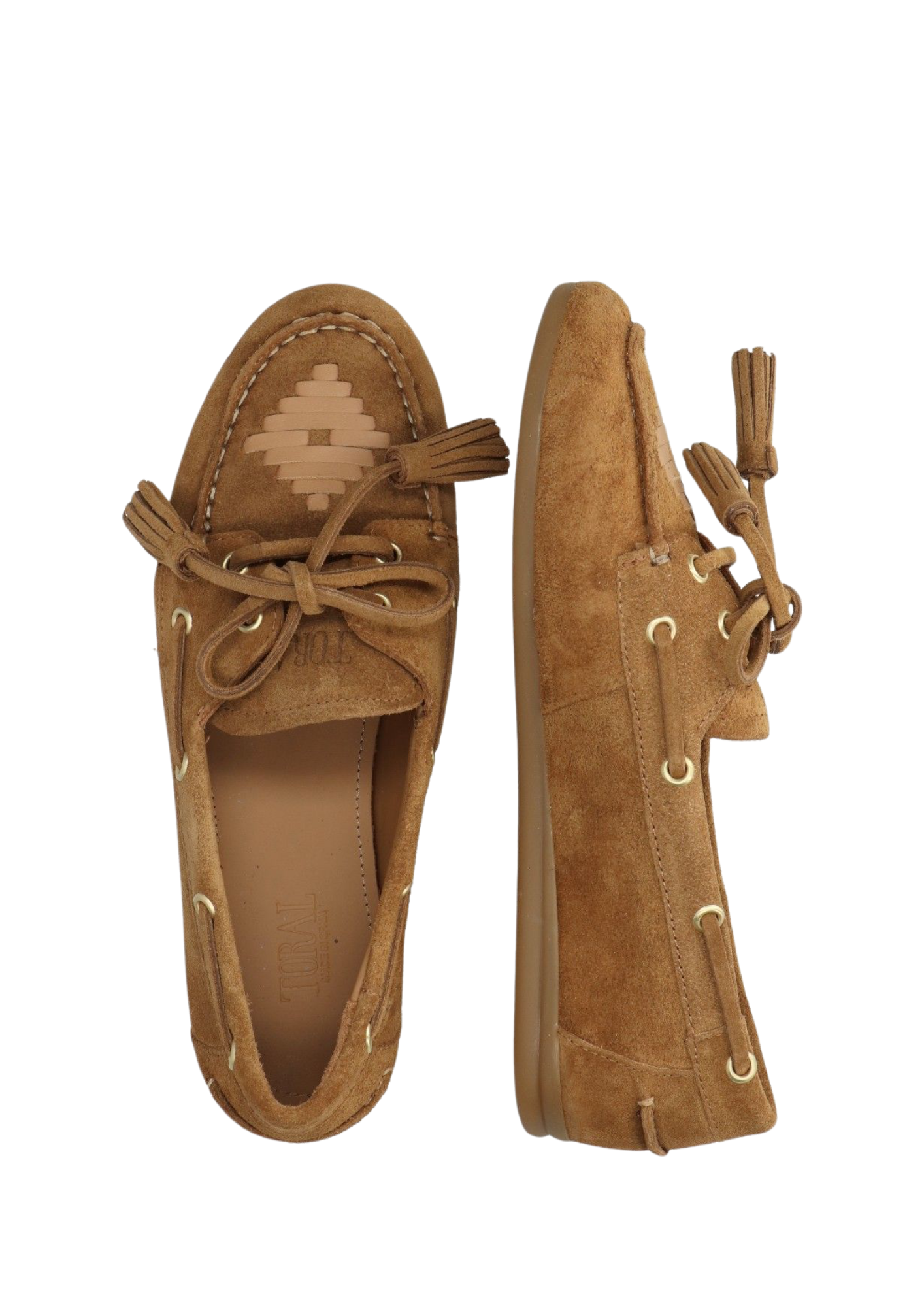 Stijlvol en verrassend comfortabel: de Shima loafer voor dames van het merk Toral heeft een zachte cognackleurige suède basis in een elegant vormgegeven ontwerp. Suède veters met kwastjes geven de instappers een klassieke uitstraling, terwijl gouden eyelets en de leren bewerking op de neus het geheel een verfijnde twist geven. De lederen binnenzijde met vast voetbed zorgt voor een prettig draaggevoel en dankzij de rubberen zool en flexibele constructie beweegt deze mocassin soepel met je mee. De loafers zijn afgewerkt met het Toral-logo op de tong. Kleur: cognac. (Caramelo)
